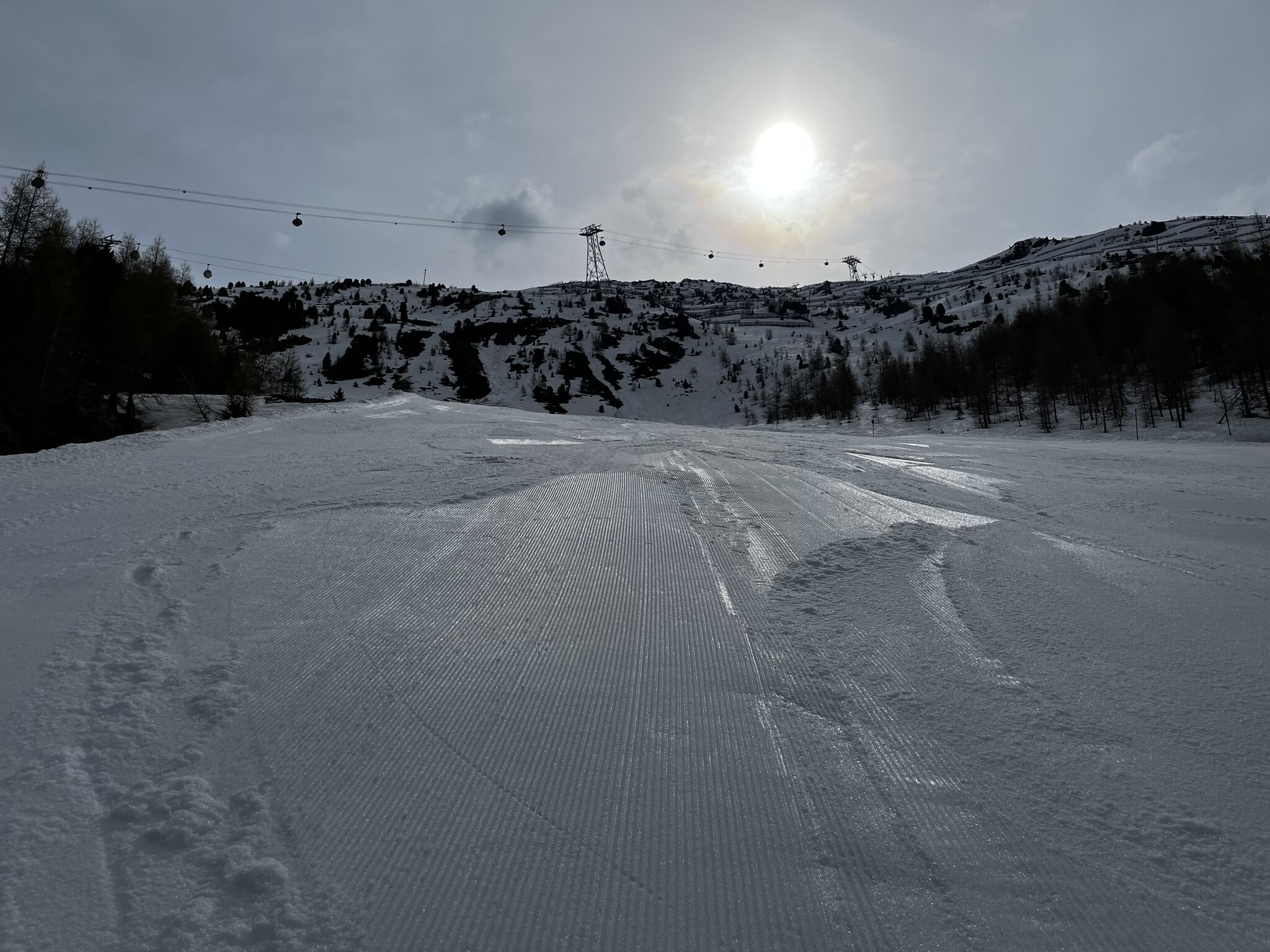 Die Rennpiste am Falgin ganz aussen wurde irgendwann freigegeben ist auch jetzt nach 15 Uhr schlichtweg immer noch der HAMMER! Da werden wir nicht vor Betriebsschluss aufhören können.