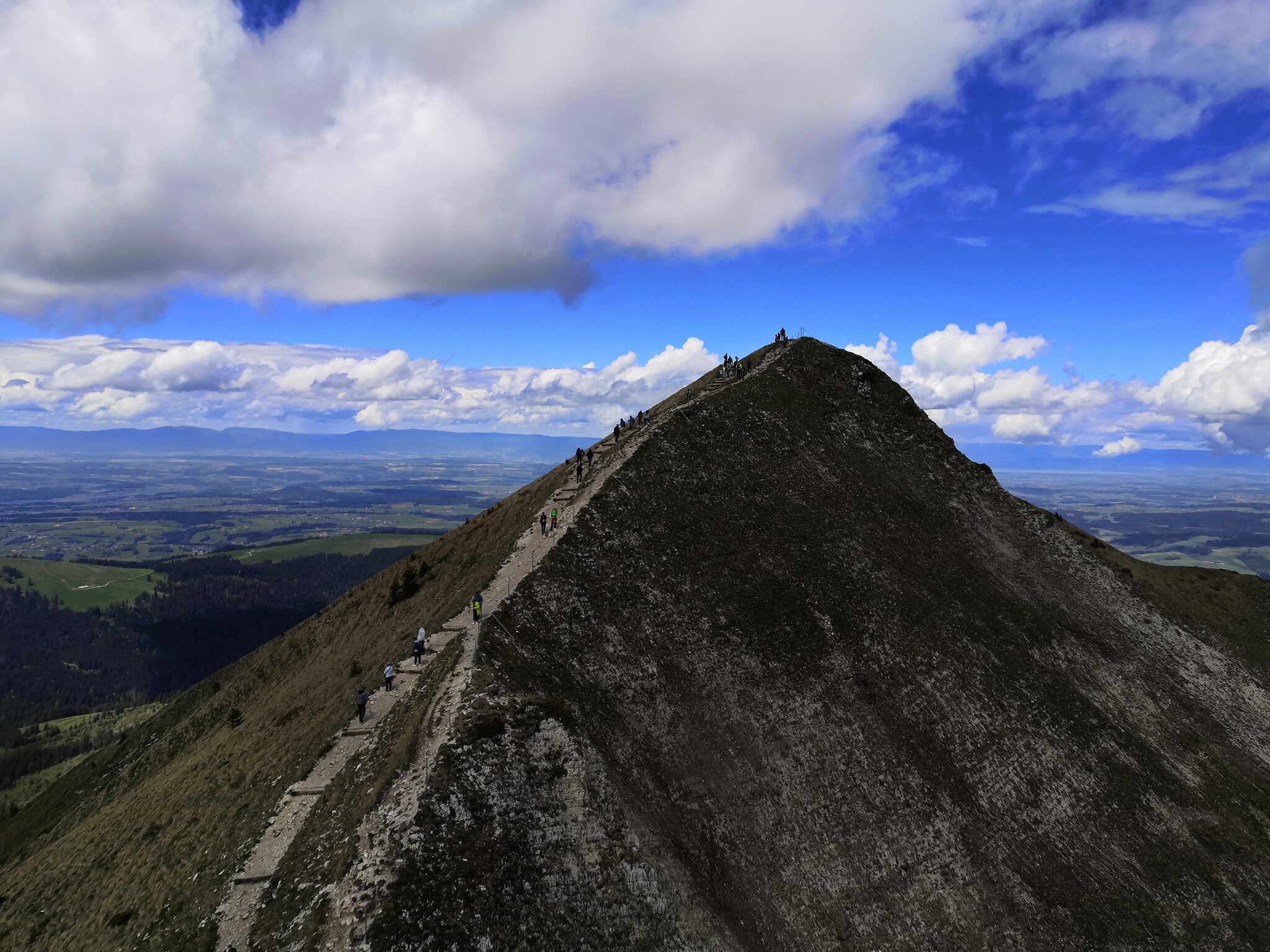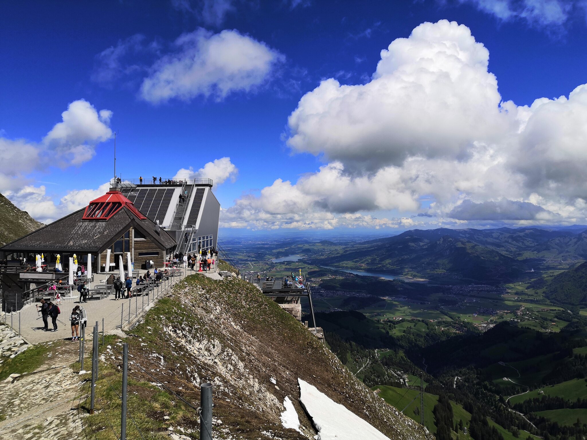 Mit dem Magic Pass ging es dann natürlich noch per Bahn hoch auf den Gipfel. Die Bahn fuhr heute alle 10 Minuten und es war gerade auf dem Gipfel doch einiges los. Nach einer Stunde oben ging es dann schon halb durchgefroren wieder nach unten. Der starke Wind machte das Ganze schon ziemlich kühl. Unten durchquerte ich dann den komplett vollen Parkplatz und setzte mich in den 14:18 Uhr-Bus Richtung Bulle.