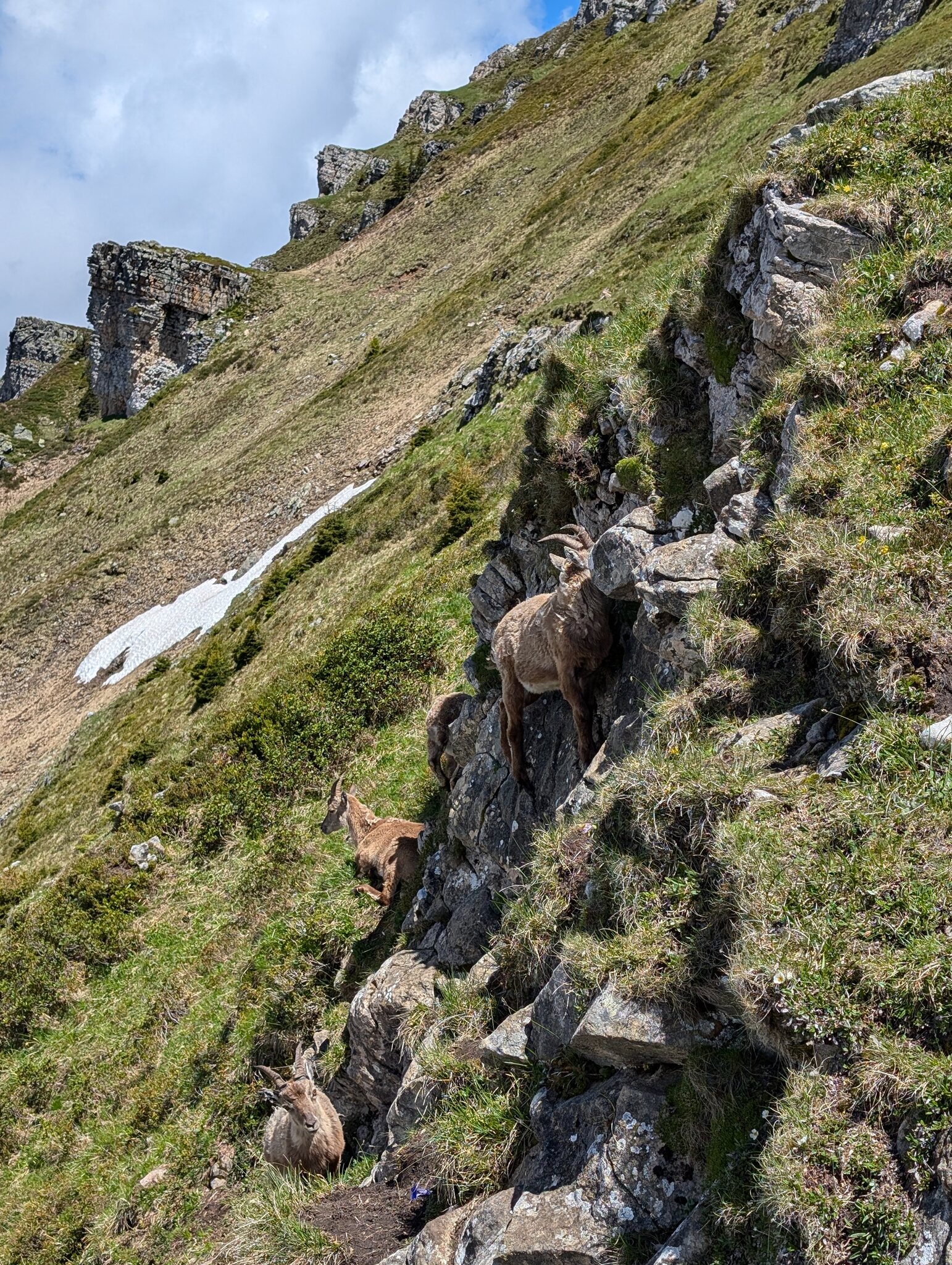 Auf den Bildern wird dann das einzige Schneefeld ersichtlich sein. Durch die Steilheit taten sich doch einige schwer, nicht zuletzt die beiden Herren aus Deutschland auf dem Foto, welche schon oberhalb einen mässig sicheren Eindruck machten. Ansonsten beeindruckten die zahlreichen jungen Steinböcke entlang des Wanderwegs. Auf dem Rückgang nutzte ich dann ab Oberhofen bis Thun noch das ebenfalls gut nachgefragte Schiff, sodass ich kurz vor 18 Uhr wieder zurück in Bern war.