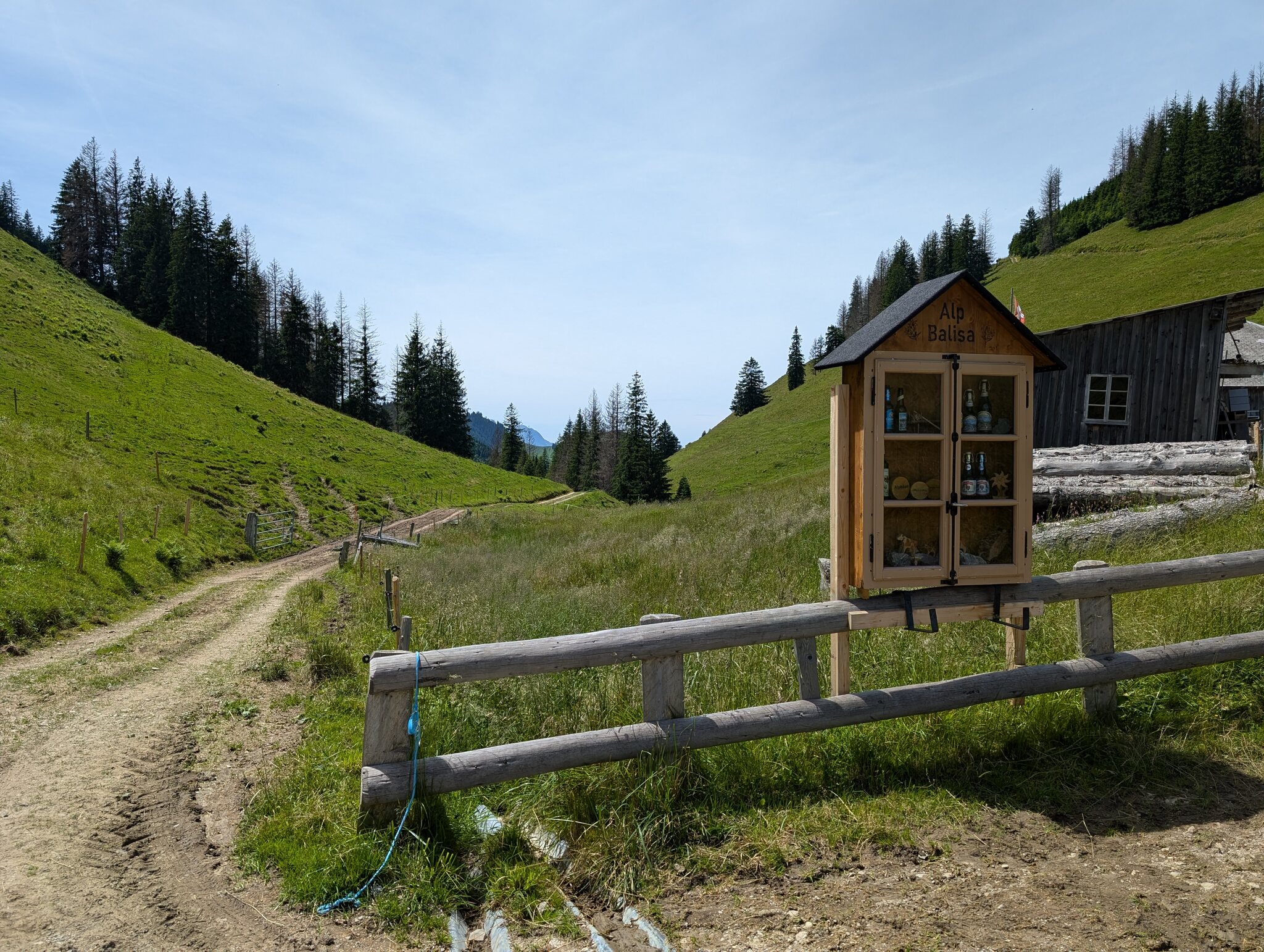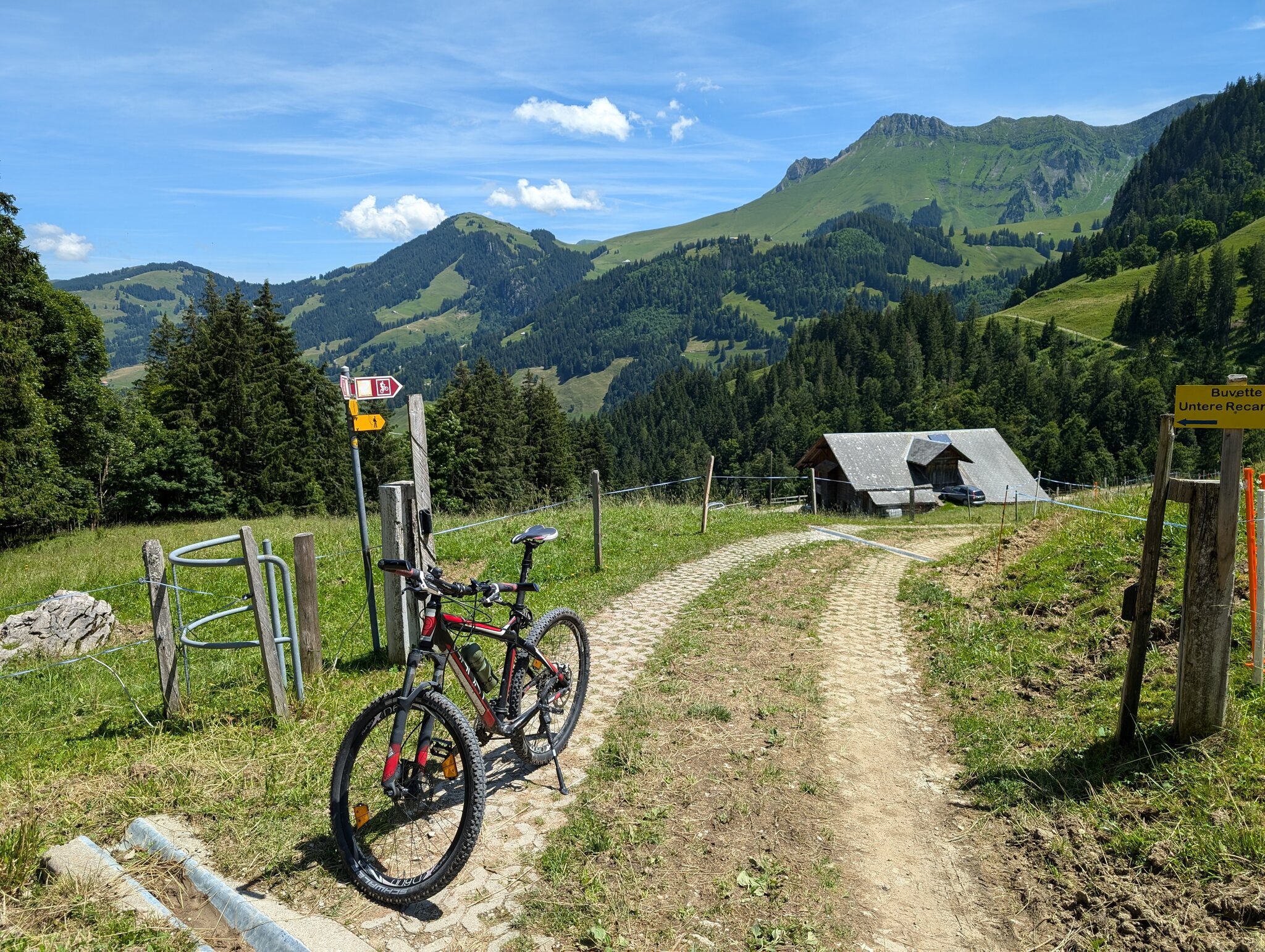 Unterdessen bin ich mit der Berichtserstattung bereits etwas ins Hintertreffen geraten. An diesem Sonntag ging es für einmal mit dem Velo los. Ausgangspunkt war Schwarzenburg und meine geplante Route führte via Schwarzsee und La Balisaz. Da ich alleine unterwegs war, wollte ich mir aber den genauen Routenverlauf noch offen lassen. Ich kam gut voran und hatte die 25km bis Schwarzsee deutlich schneller wie berechnet hinter mich gebracht. Obwohl ich ein kleines Picknick im Rucksack hatte, entschied ich mich für einen Zwischenstopp auf der Riggisalp. Mit dem MagicPass konnte man die Warteschlange an der Kasse problemlos umgehen. Nach einer grossen Stärkung, sonntags gibt es hier jeweils Beilagenbuffet mit Fleisch vom Grill zu einem fairen Preis, machte ich mich auf den Weg Richtung Charmey. Ich folge dem Verlauf der nationalen Mountainbike-Route Nr. 2, welche bis La Balisaz auf knapp 3 Kilometer eine Höhendifferenz von 350m zurücklegt. Für ein Mountainbike ohne Motor war die Steigung abschnittsweise definitiv zu gross. Es war mehrmals stossen angesagt.