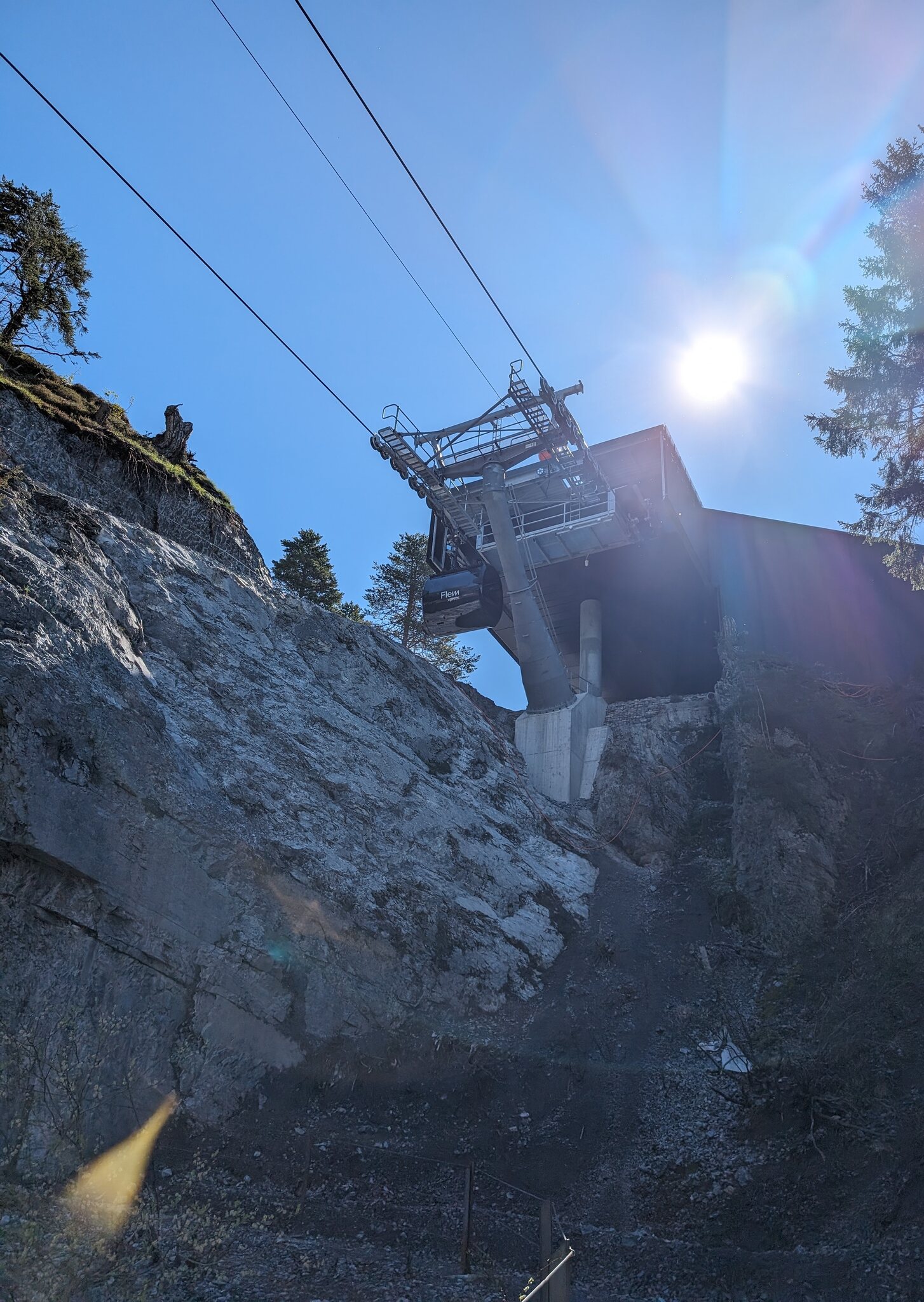 Das Paar schlendert zur Kabine, wir schauen zu wie die Uhr von 10 Sekunden runterzählt. Die Frau steigt ein, die Uhr geht auf 0 und der Mann versucht noch die Tür zu blockieren aber der Bähnler winkt ab: "Die nächscht Kabine nach Startgels neh". (Die nächste Kabine nach Startgels nehmen)