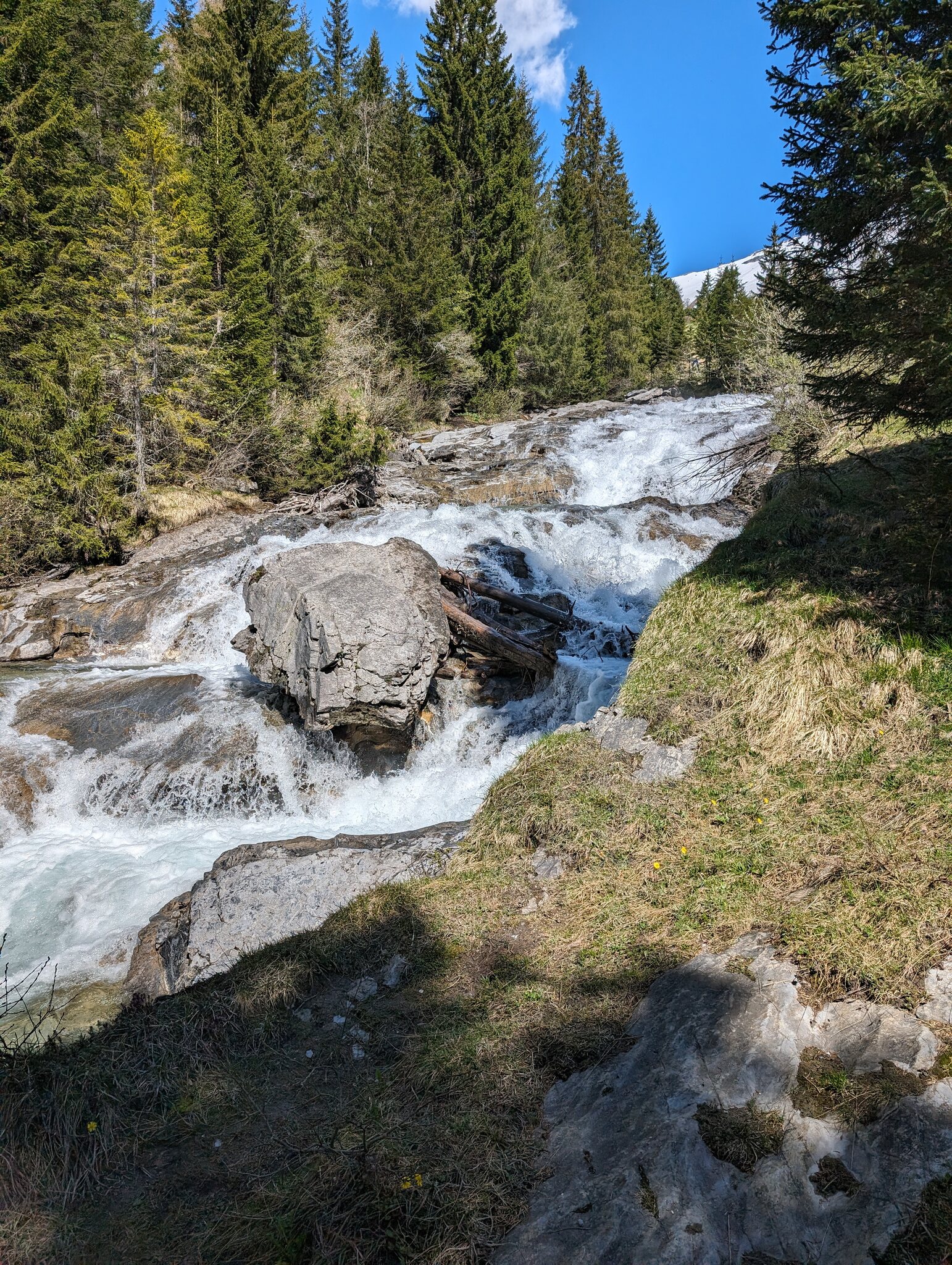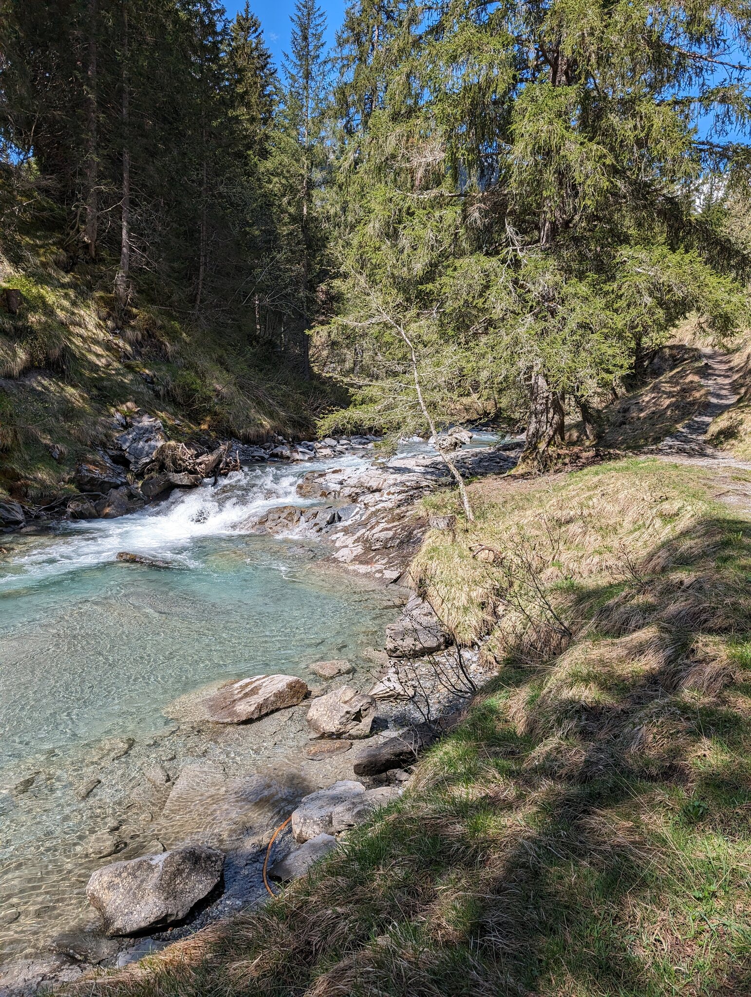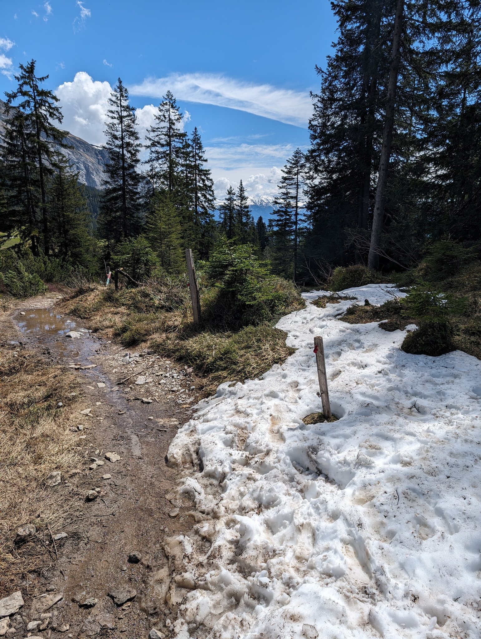 Schon fast in Startgels. Hier liegt noch Naturschnee. Der Bach links daneben ist der Wanderweg und nicht etwa die Flem.