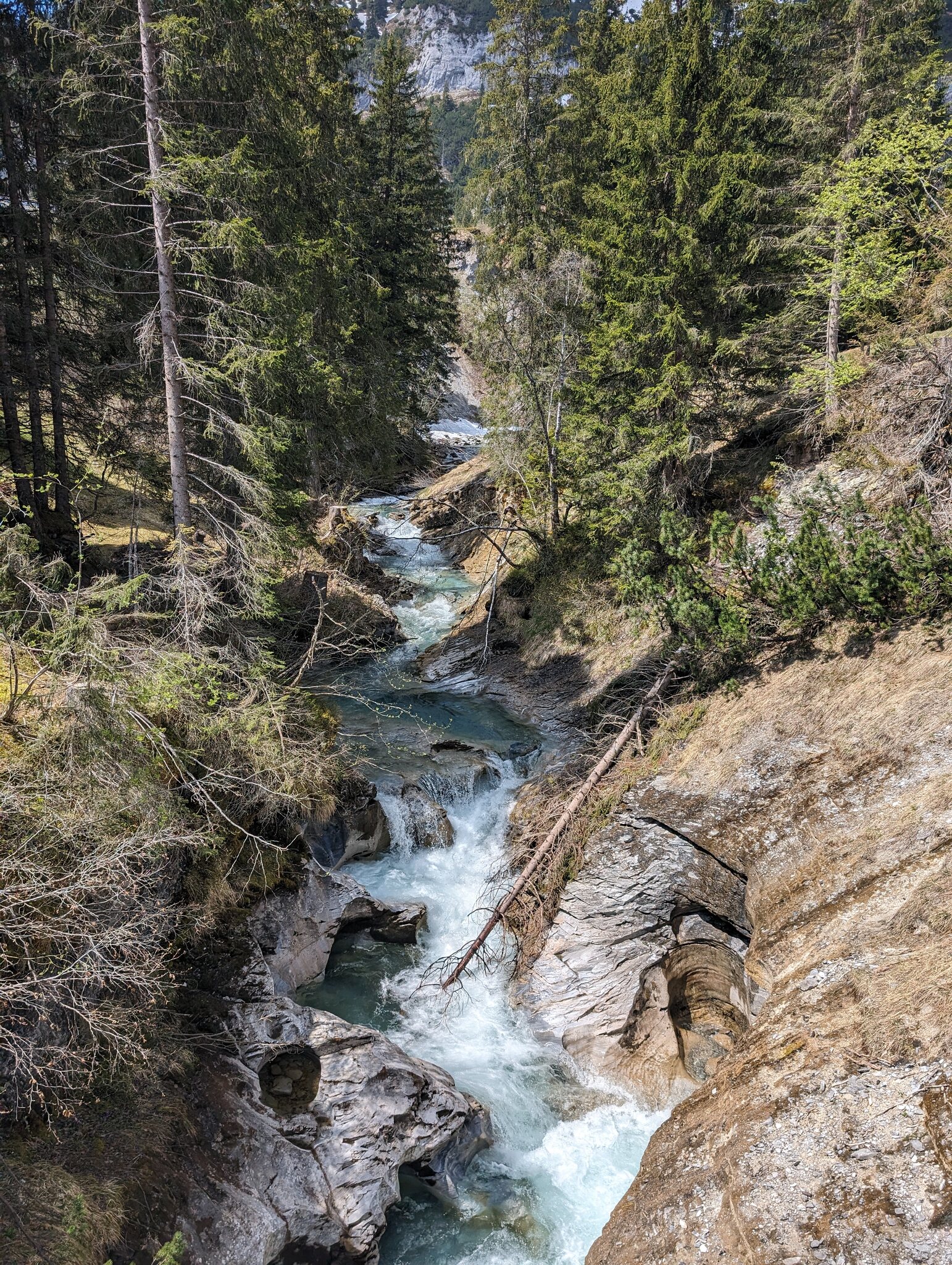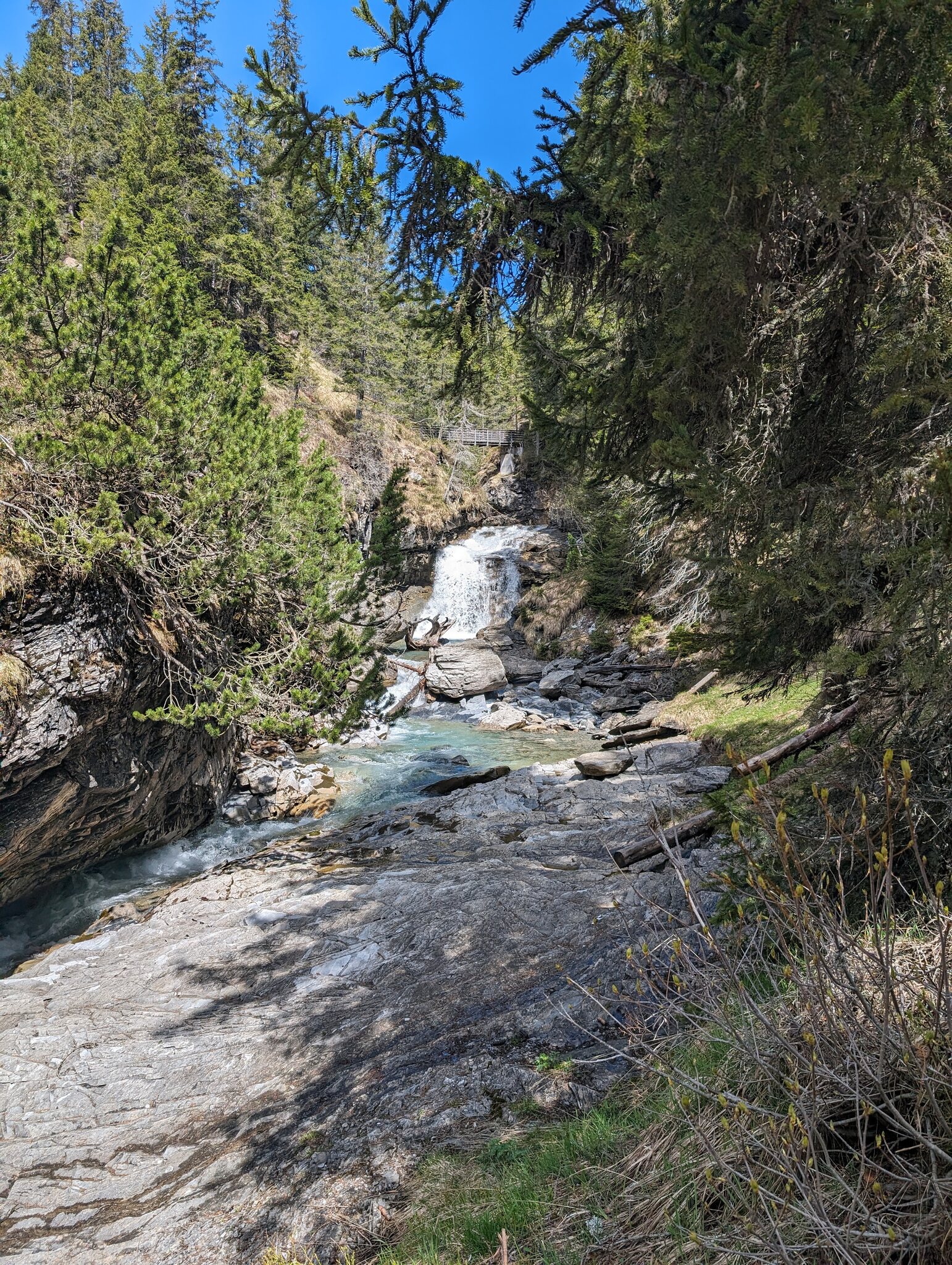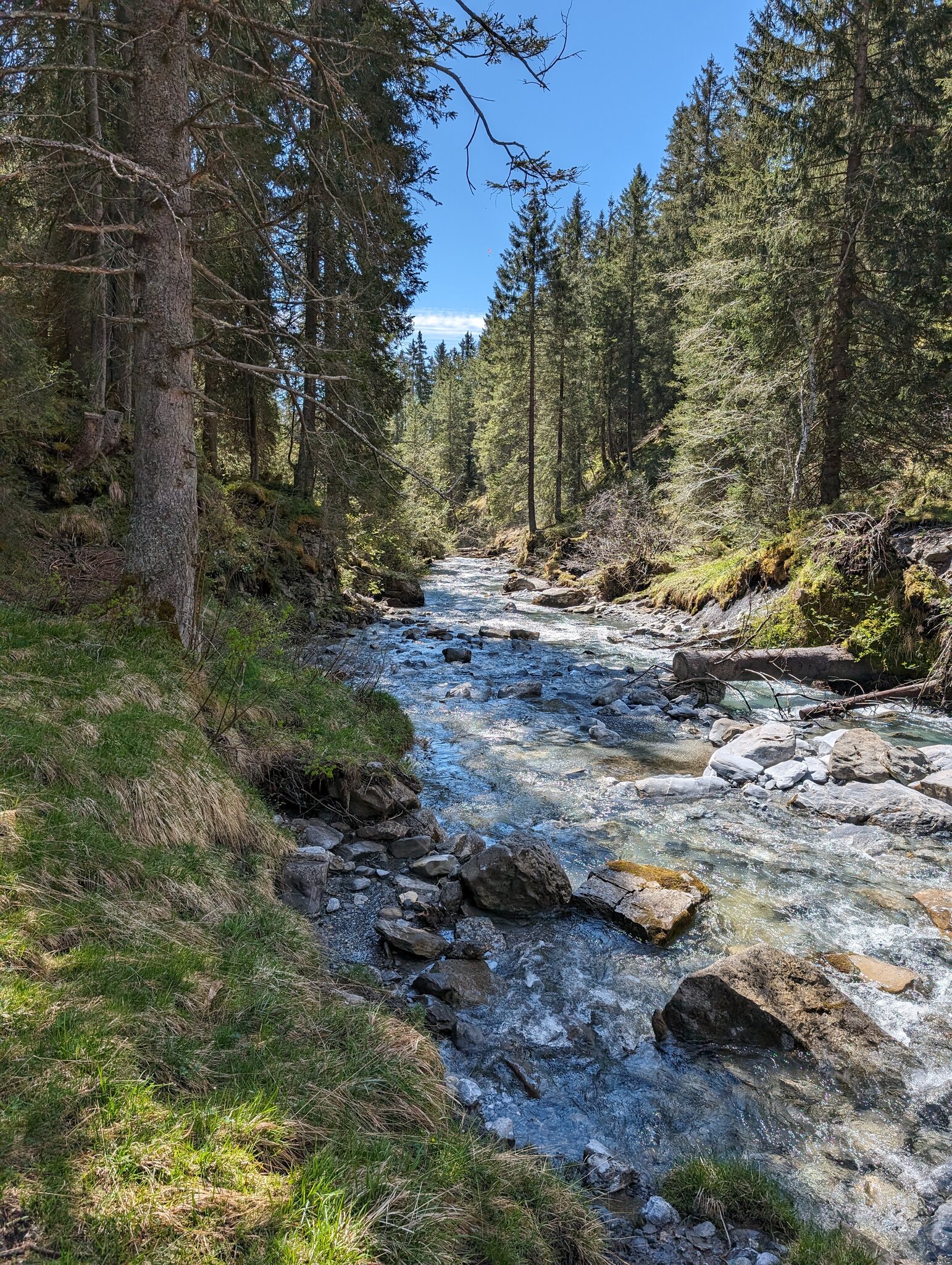 An Pfingsten 2023 sind wir die komplette Strecke abgelaufen, wobei man leider einen Teil bei Uaul Pulté nicht mehr begehen kann, weil er Seit einiger Zeit zur Mountainbike Autobahn umgebaut wurde. Wir sind diesen Teil damals durch den Wald gegangen, also ohne Weg. Heute beschränken wir uns auf die "klassische" Strecke zwischen Flims Waldhaus und Conn. Wir gehen durch den offiziell markieren Zugang zum Conn-Bächli. Schon nach kurzer Zeit erreicht man den Schrägaufzug zum Caumasee. Es ist schön, dass bis auf ein sehr kurzes Stück das Bächli offen ist, und auch dort wo die Forststrasse parallel verläuft, es trotzdem einen Trampelpfad entlang dem Bächli gibt.