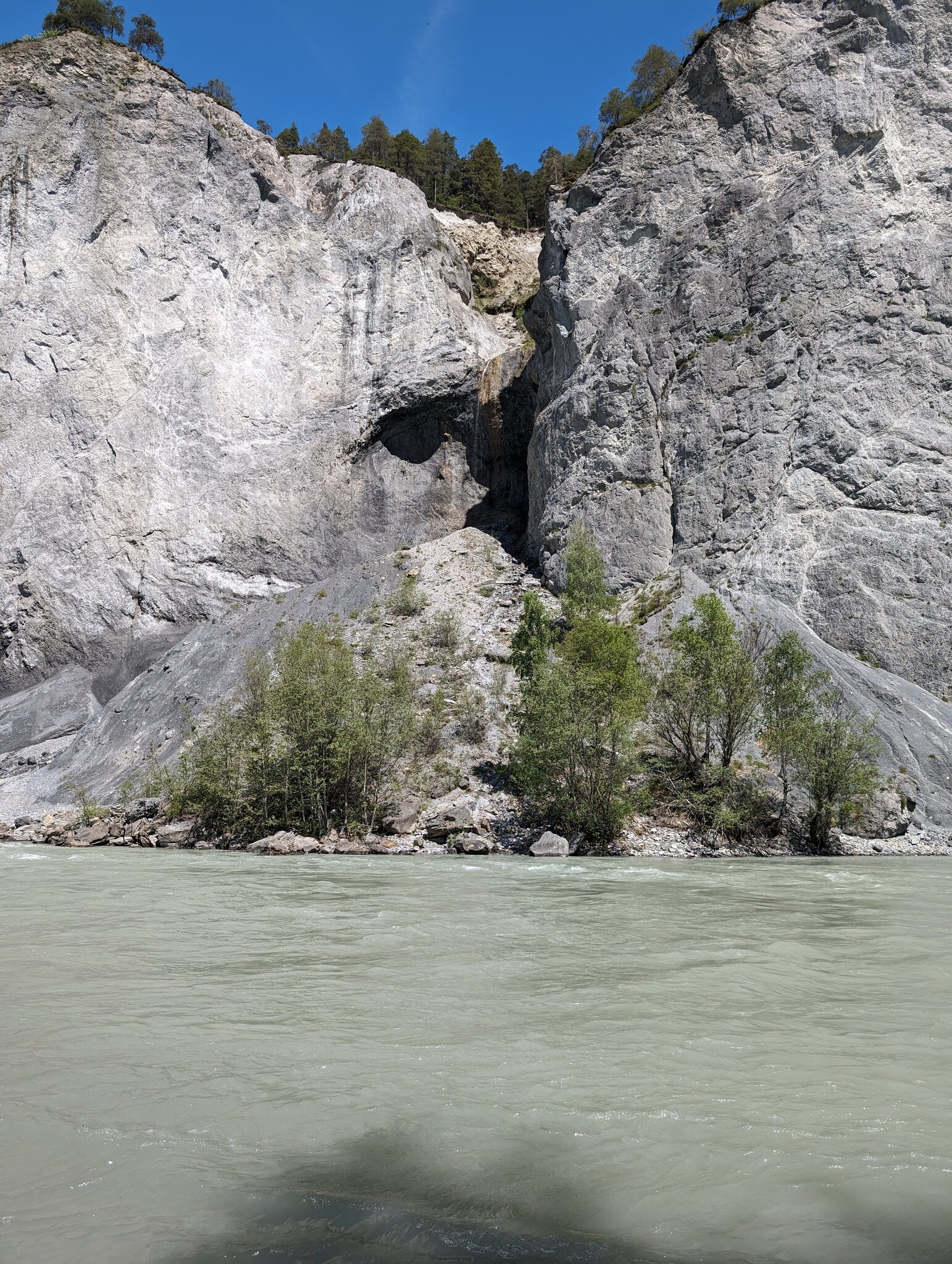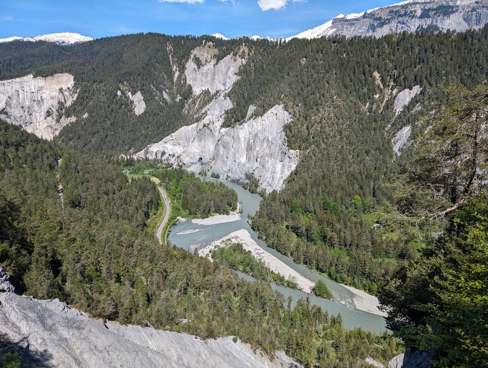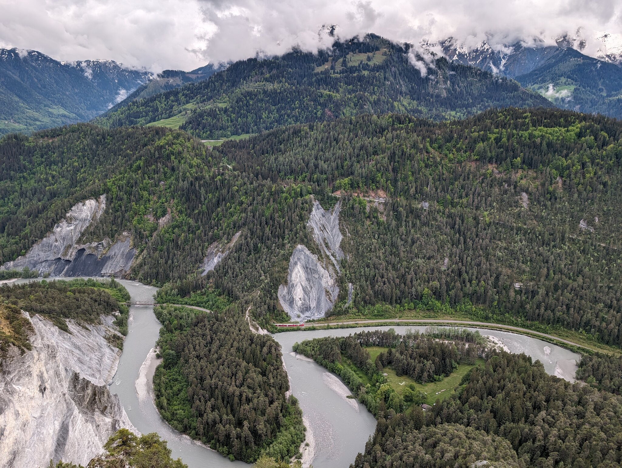 Der Vorderrhein bei der Halbinsel Chrummwag. Genau über dem RhB Zug ist das Islabord wo die Aussichtsplattform ist auf der wir zwei Tage zuvor waren.