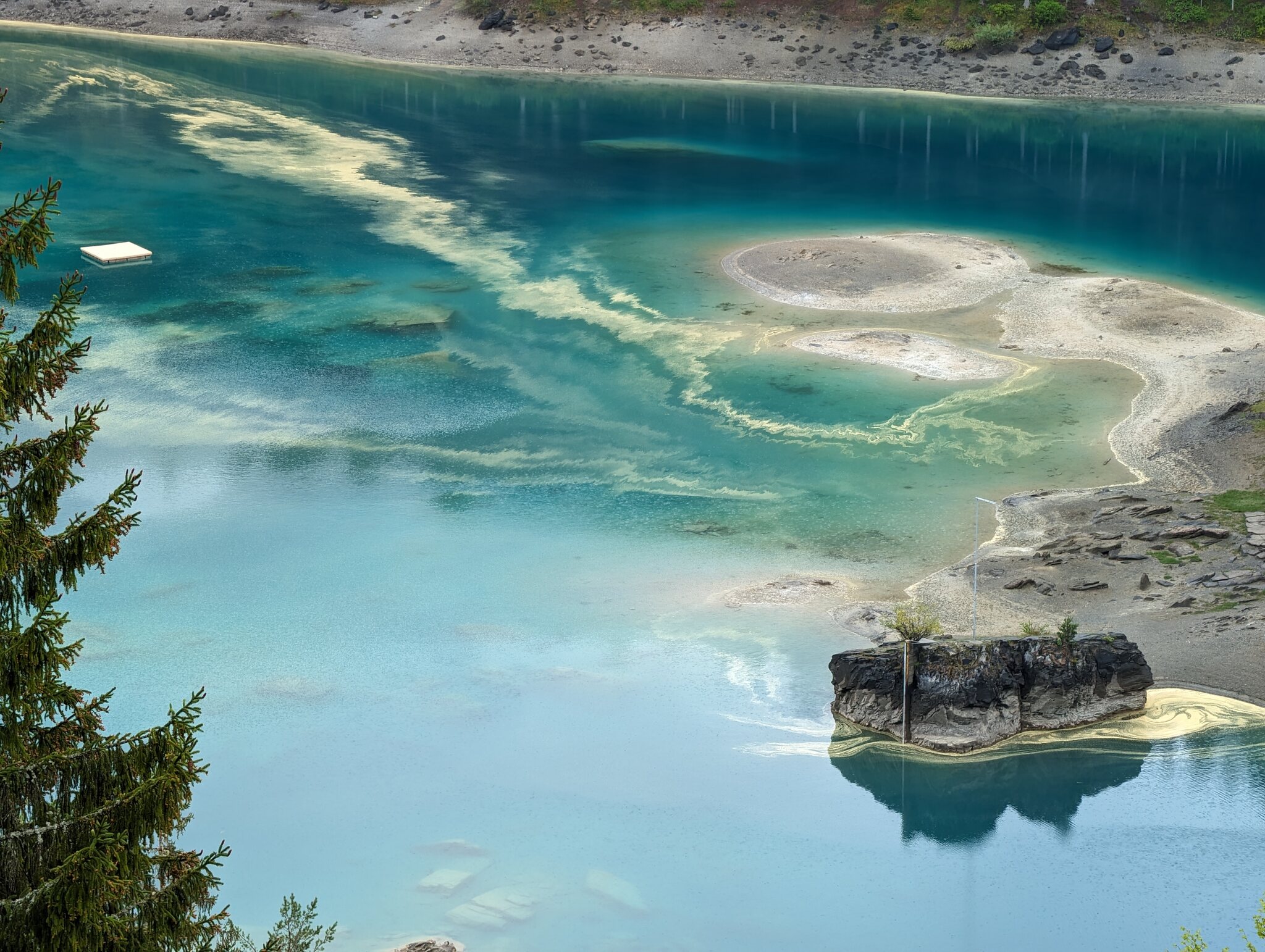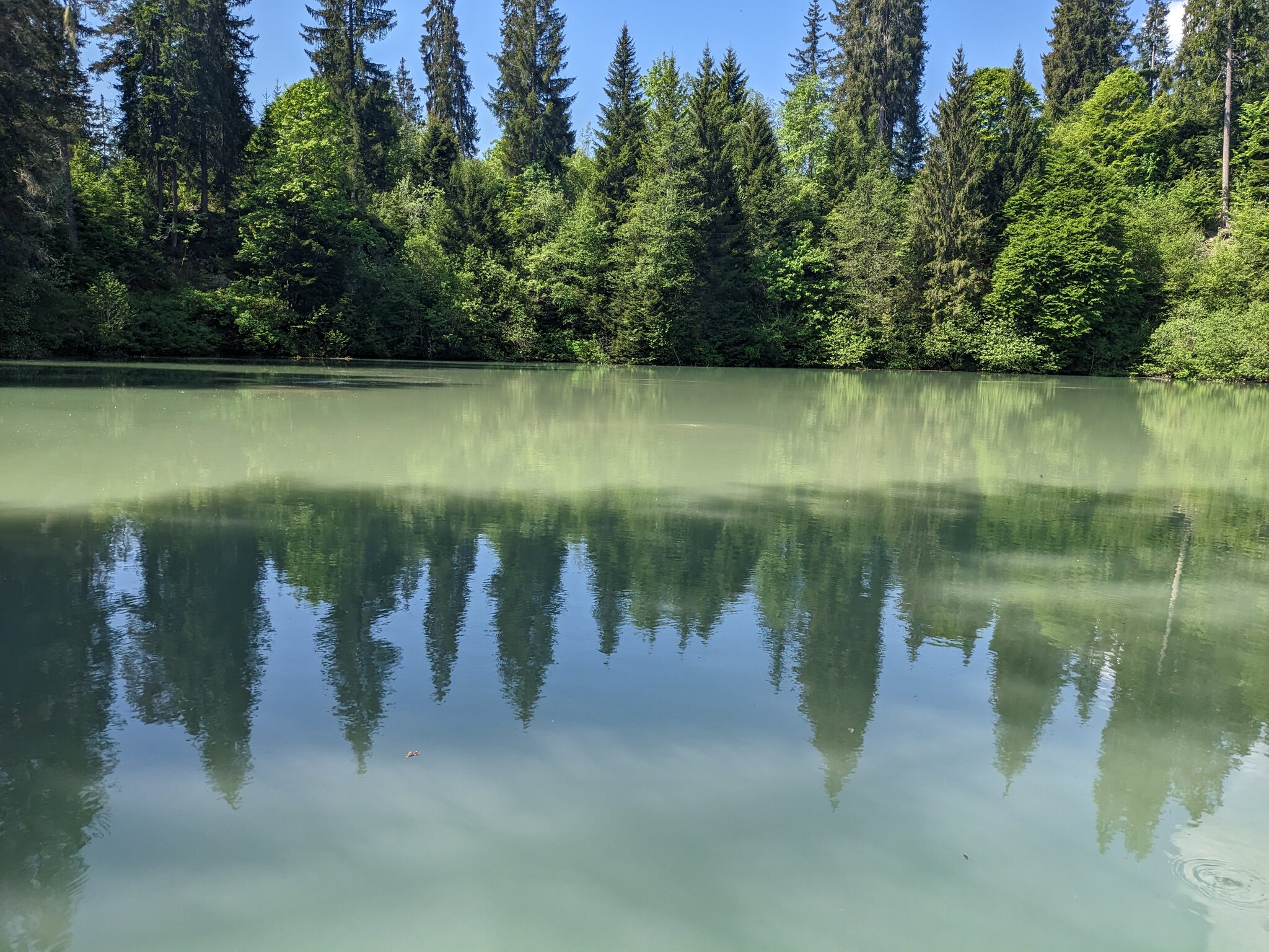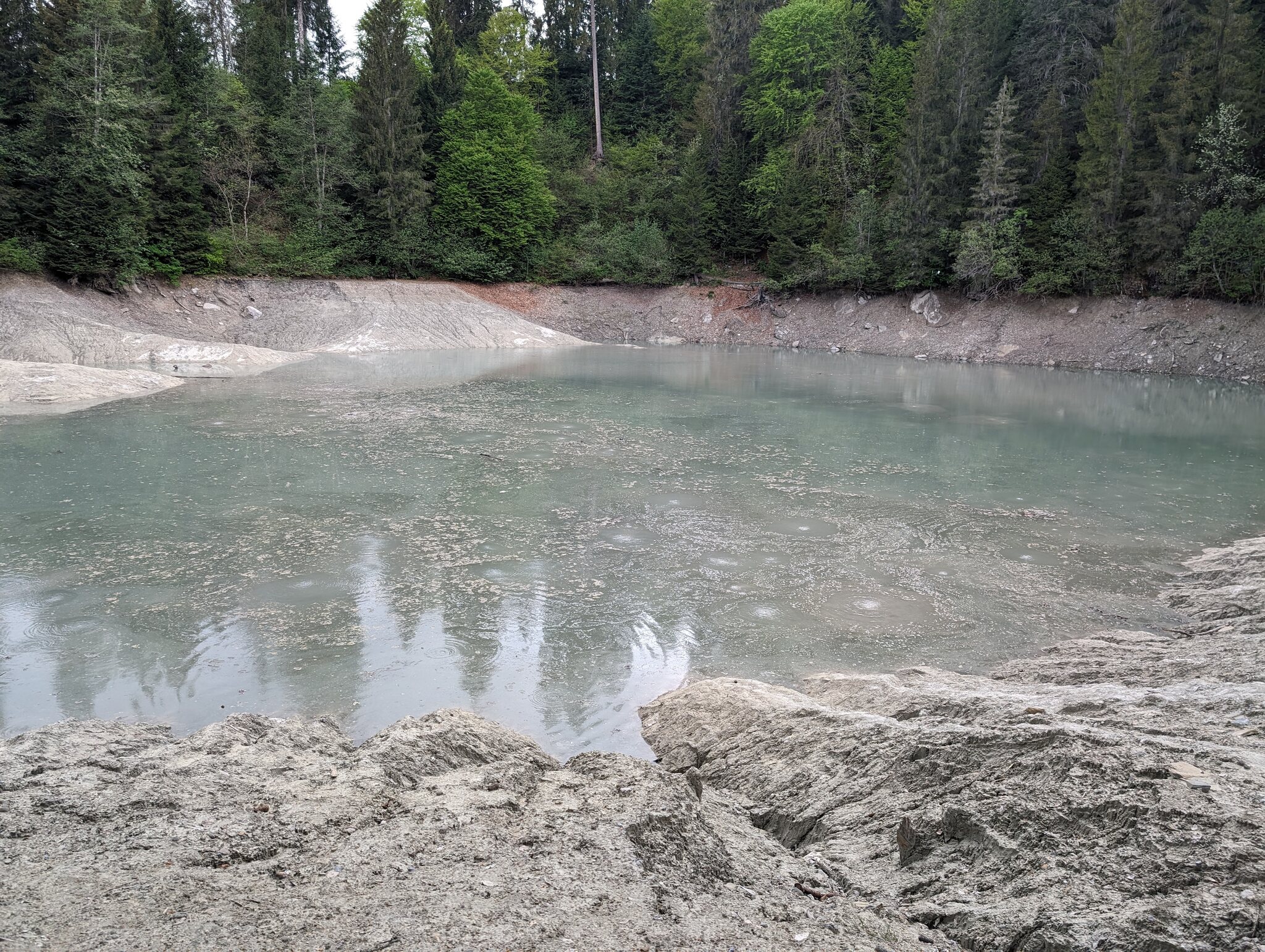 Durch den Regen hat es den Blütenstaub in den See gespült, was zu einem interessanten Farbenspiel führt.