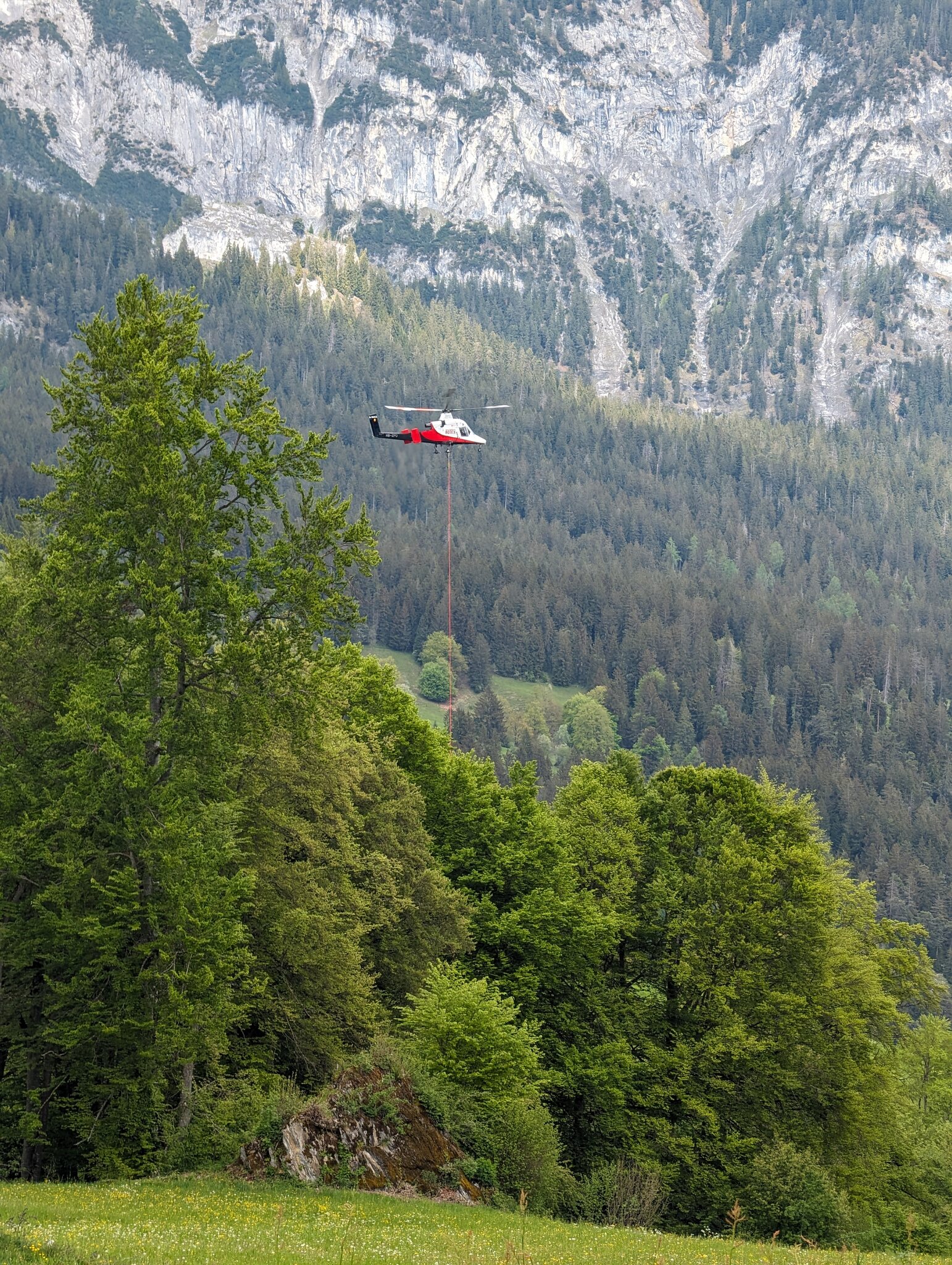 Wir hören einen Helikopter der immer lauter wird je weiter wir kommen. Es handelt sich um Forstarbeiten, der Helikopter transportiert jeweils etwa ein viertel Tanne pro Flug aus Tal der Flem hinaus.