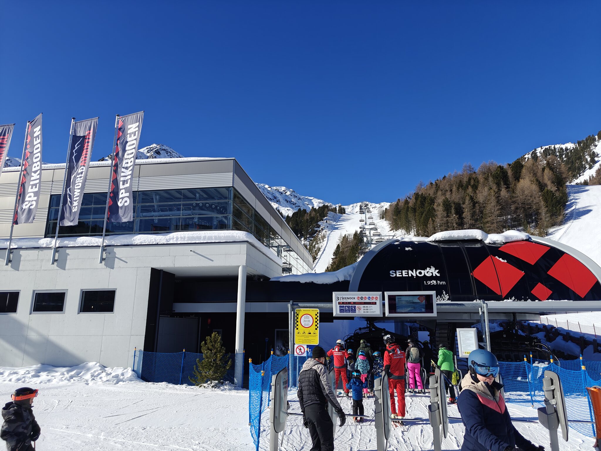 Am ersten Tag des Skiurlaubs geht es auf den Speikboden. Im Gegensatz zu Sillian gestern gibt es hier gar keinen Neuschnee. ^ Start um kurz nach 8:30 Uhr. ^ Gleich einmal zur sonnigen 8-KSB Seenock. ^ Die Pisten sind perfekt. Hier machen wir gleich einige Wiederholungsfahrten. ^ Zur Abwechslung zum Sonnklar. ^ Bei der Sonnklarhütte vorbei. ^ Bernhard Glück ist noch im Schatten. ^ Meine Lieblingspiste am Speikboden ist die von oben gesehen linke Piste am Sonnklar. Schön in die Landschaft integriert, mit vielen Kuppen und Mulden