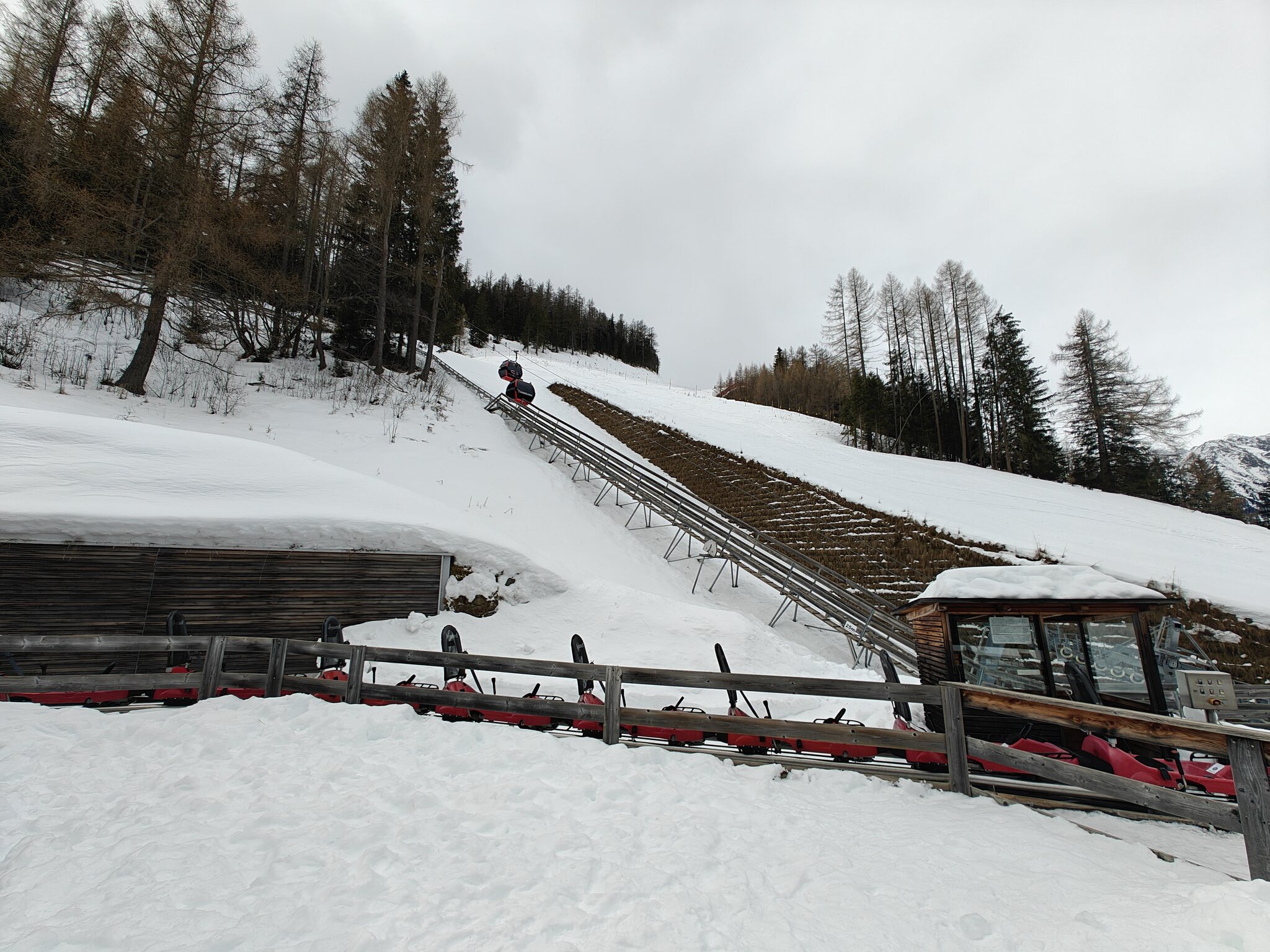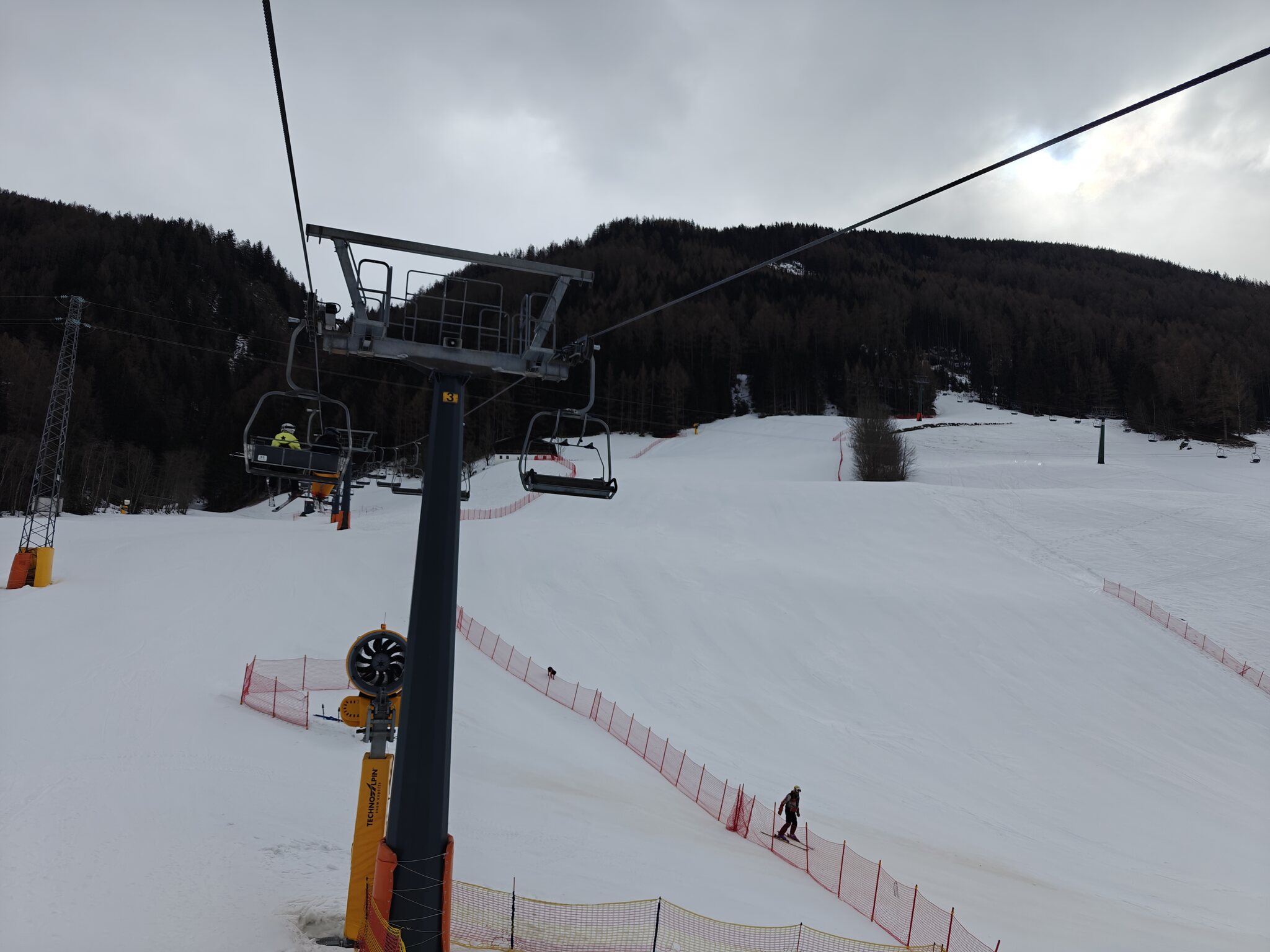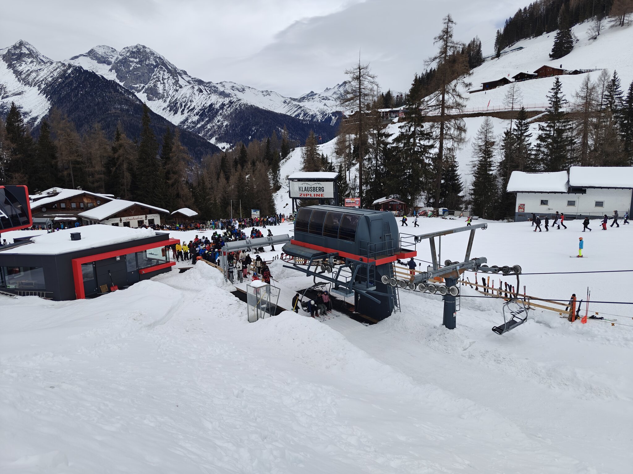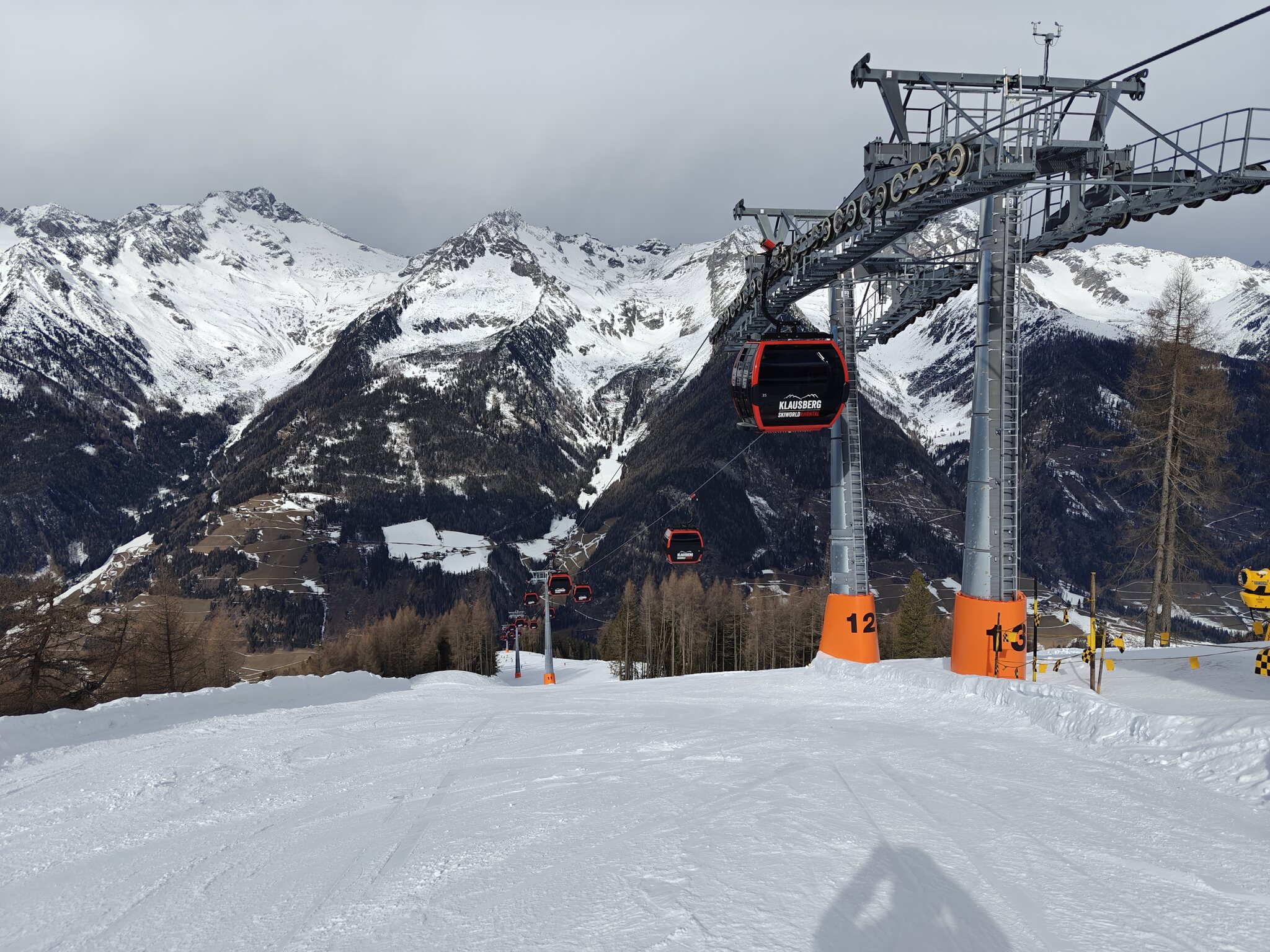 Nach dem Speikboden gestern geht es heute in das zweite große Skigebiet im Ahrntal: auf den Klausberg. ^ Es geht hoch mit dem K-Express. ^ An der Bergstation ist es sehr voll durch viele Anfänger. ^ Von der 10-MGD Sonnen geht seit heuer eine neue Abfahrt "Baurschaft" in Richtung Baurschaftolbe. Zuerst etwas steiler, danach ein flacher breiter Weg. ^ Man kommt aber ohne Aufstieg nicht zum Klaussee 2, sondern man muss über die schwarze Abfahrt runter zum Klaussee 1. ^ Die Piste an der 10-MGD Panorama geht, wie die meisten Pisten, sehr gut. ^ Zeitweise kommt der blaue Himmel durch. ^ Ich bin gespannt wie lange der Klaussee 1 noch eine Sesselbahn sein wird. ^ Die besten Pisten des Tages sind am Klaussee 2. ^ Bei der neuen 10-MGD Sonnen ist die Piste leider komplett totplaniert. ^ Die im Skipass inkludierte Fahrt mit dem Klausberg-Flitzer muss auch genutzt werden