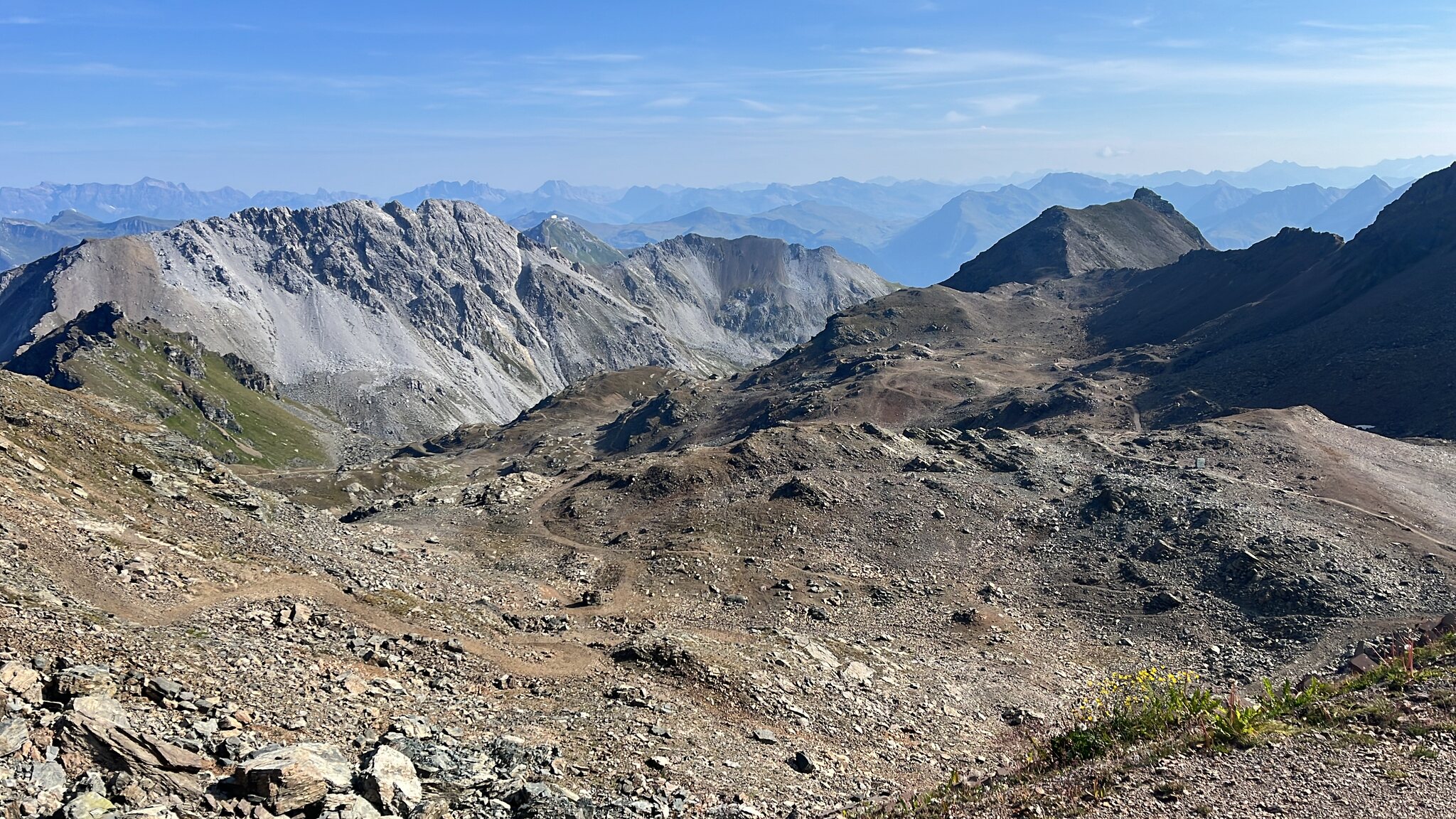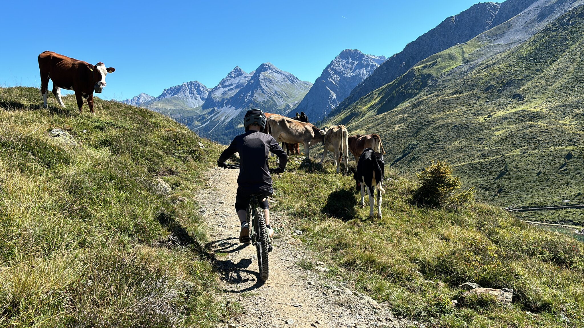 Auf dem ersten Teil des Trails gilt stürzen verboten - der ist keinen Meter breit und es geht auf der rechten Seite steil bergab. Danach folgt ein technisch anspruchsvoller Teil bevor der Weg dann auch mal so wird, dass man die Aussicht geniessen kann.