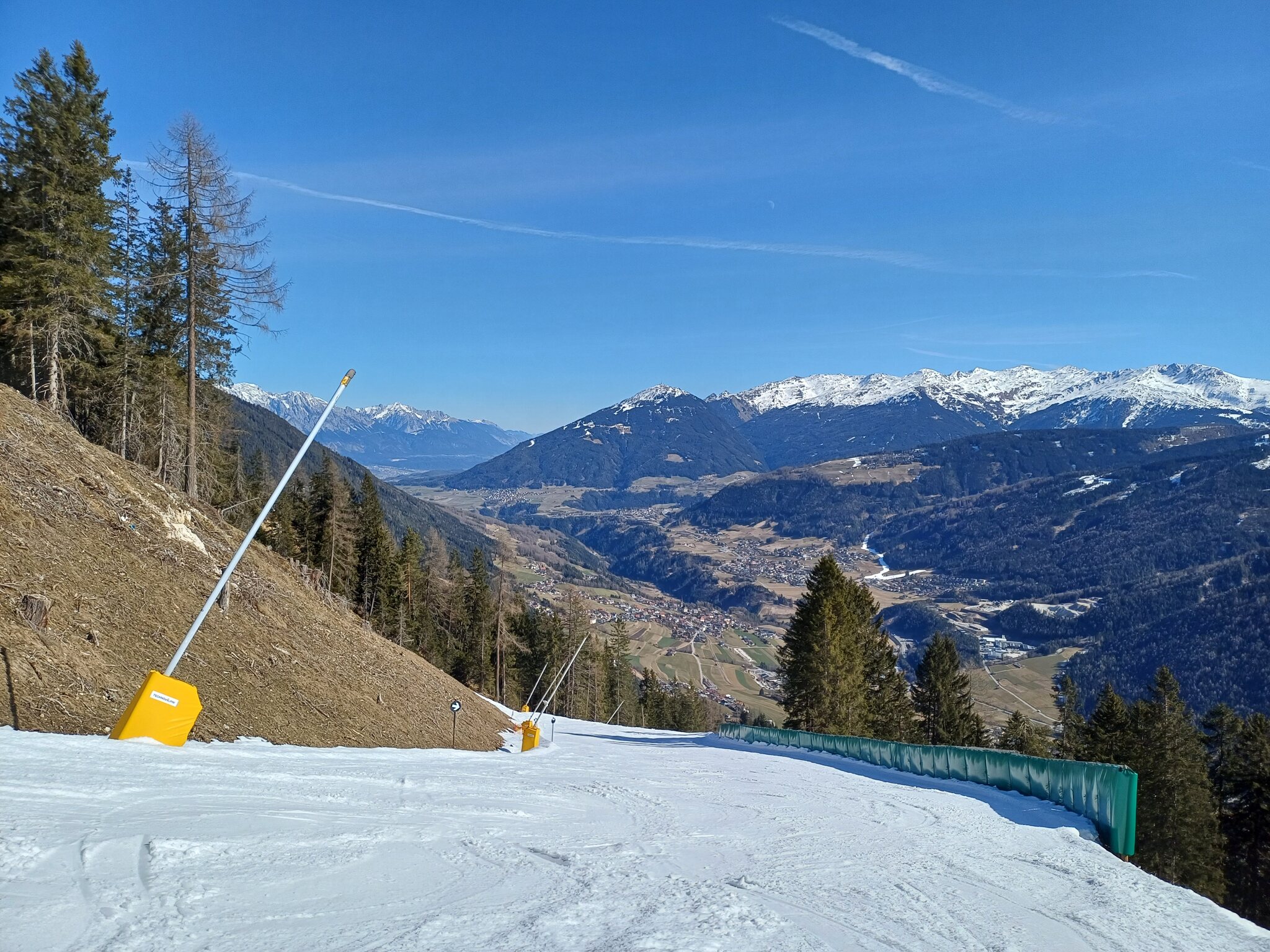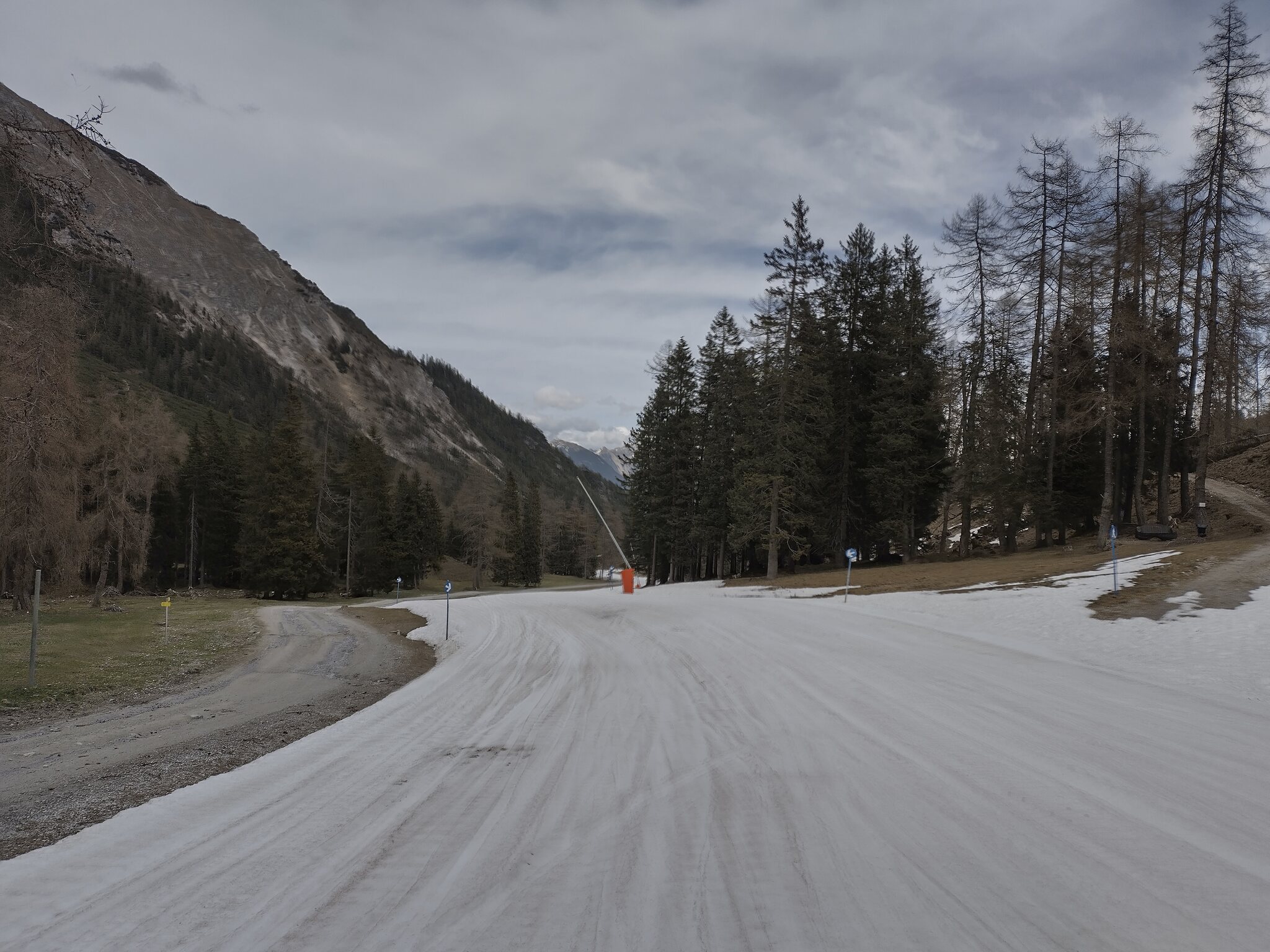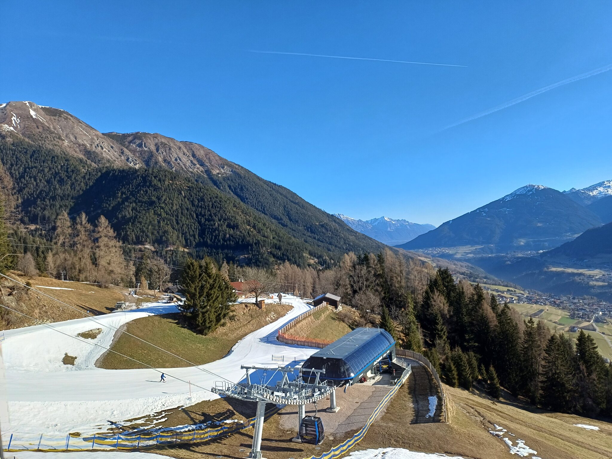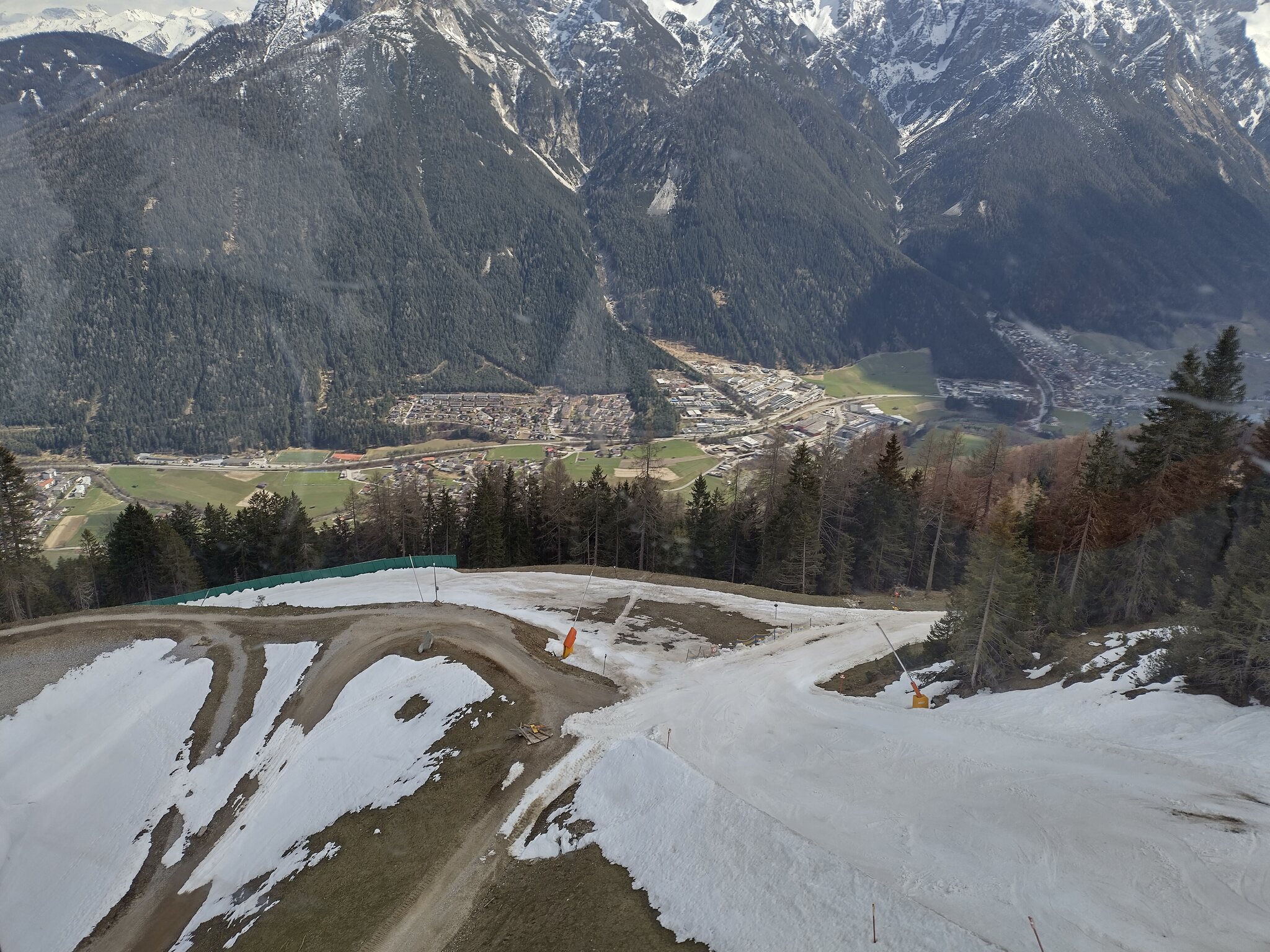 Bei der Mittelstation ist nur noch wenig Schnee, die Zufahrt zur Galtbergbahn ist ein kleines Kunststschneeband: