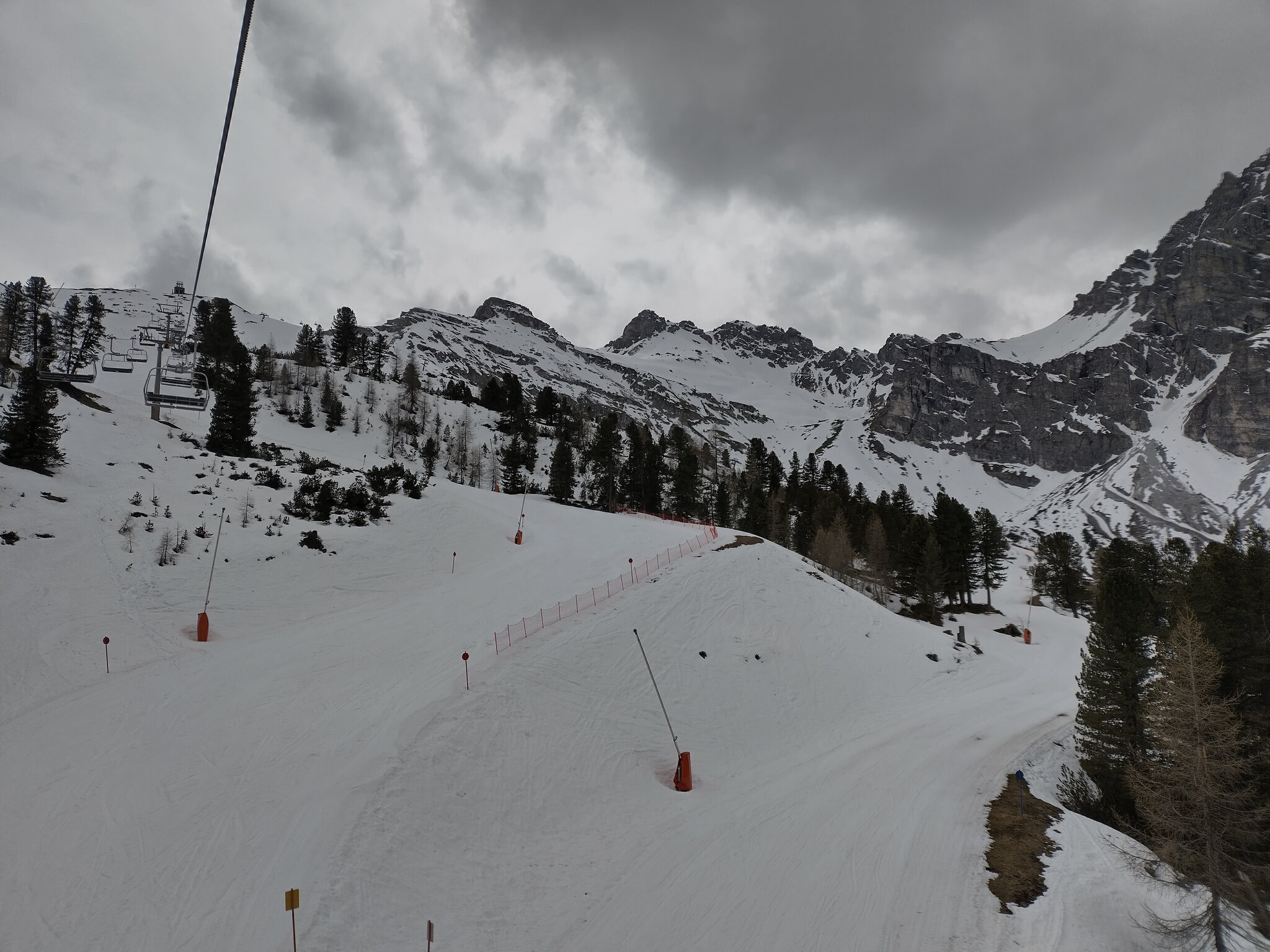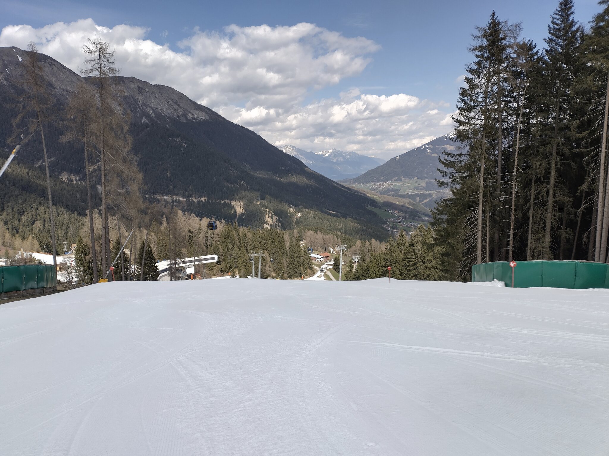 Nachdem ich um 15:59 den allerletzten Sessel der Saison bei der Sennjochbahn erreicht habe geht es ins Tal. Die Abfahrt unterhalb der Schlickeralm schaut anfangs noch gut aus obwohl es neben der Piste keinen nennenswerten Schnee hat: