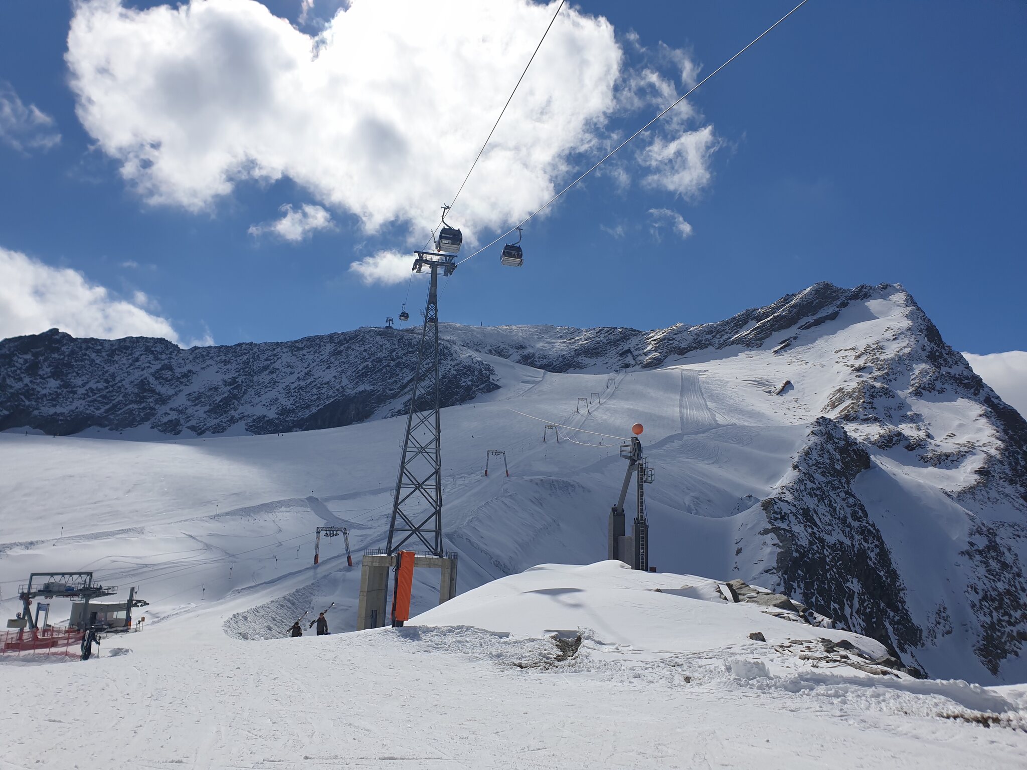 Blick aus der Gondel auf den Gletscher und die Piste. Der Gletscherschwund ist eindrücklich und gut erkennbar. Auch die winterlichen Bedingungen.