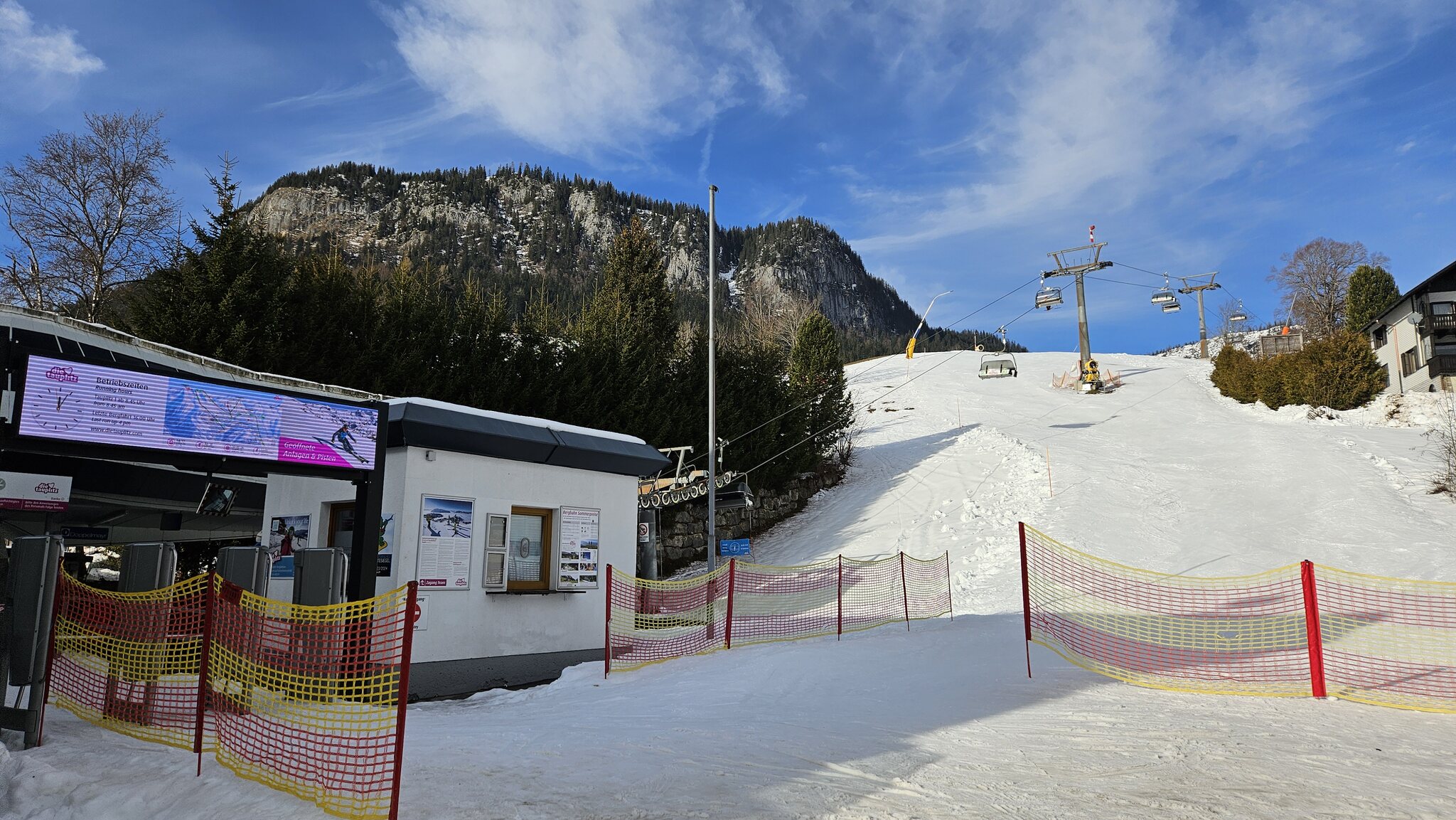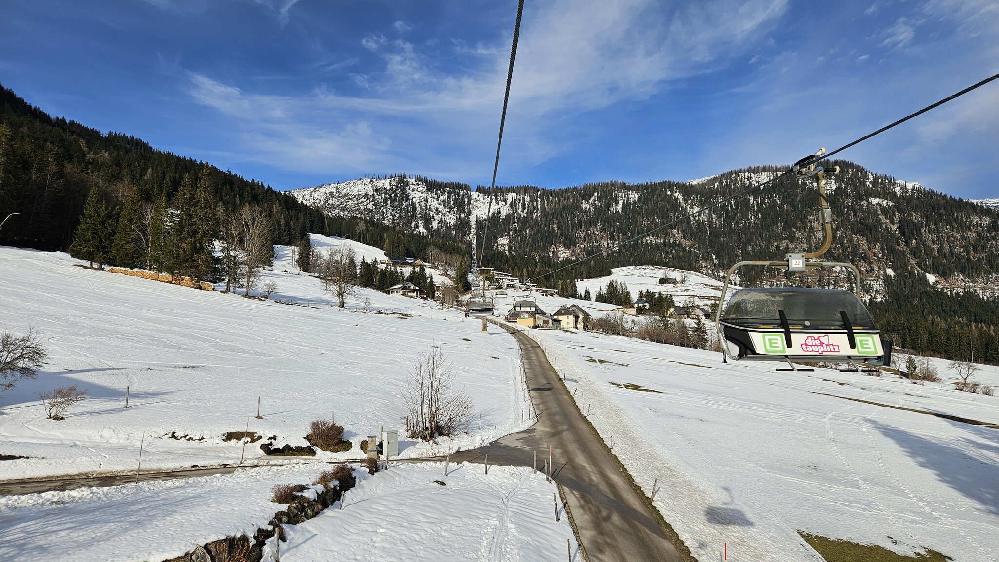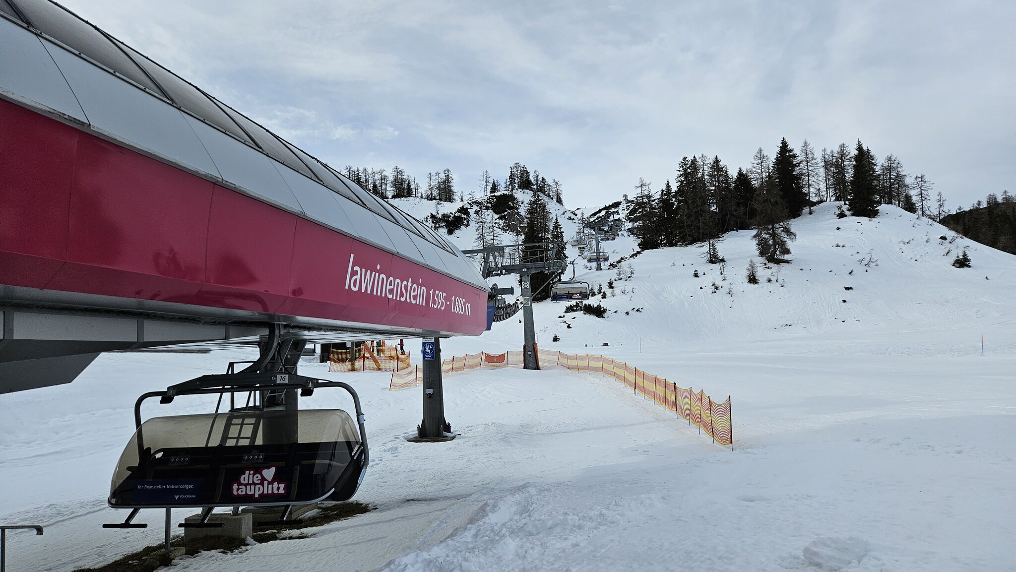 Wieder mal perfektes Timing, 5 min vor halb neun die Talstation erreicht, Bahn steht noch still (die Sessel werden auf der Tauplitz ber Schönwetter offenbar nicht garagiert). Gestartet wurde die Bahn um 8:30, im Gegensatz zum Dezember wo man stur die offizielle Betriebszeit (8:45) eingehalten hat:
