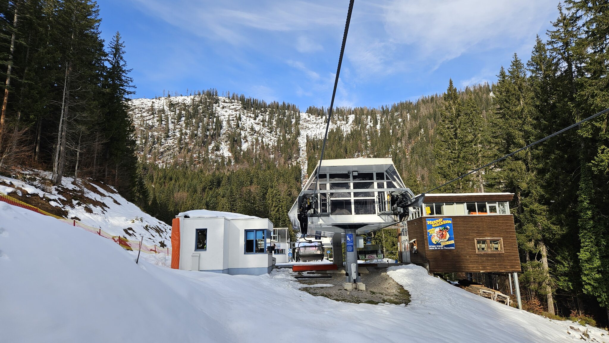 Zu früh sollte man nicht dort sein, in Tauplitz geht es noch gemütlich zu: Betriebsbeginn der 1. Sektion 4KSB um 8:45. Und ich stehe bereits 20 min vorher dort. Macht nichts, neben der Talstation gibt es ein gepflegtes Cafe wo ich bei einem Cappuccino die 20 Minuten 'umgebracht' habe: