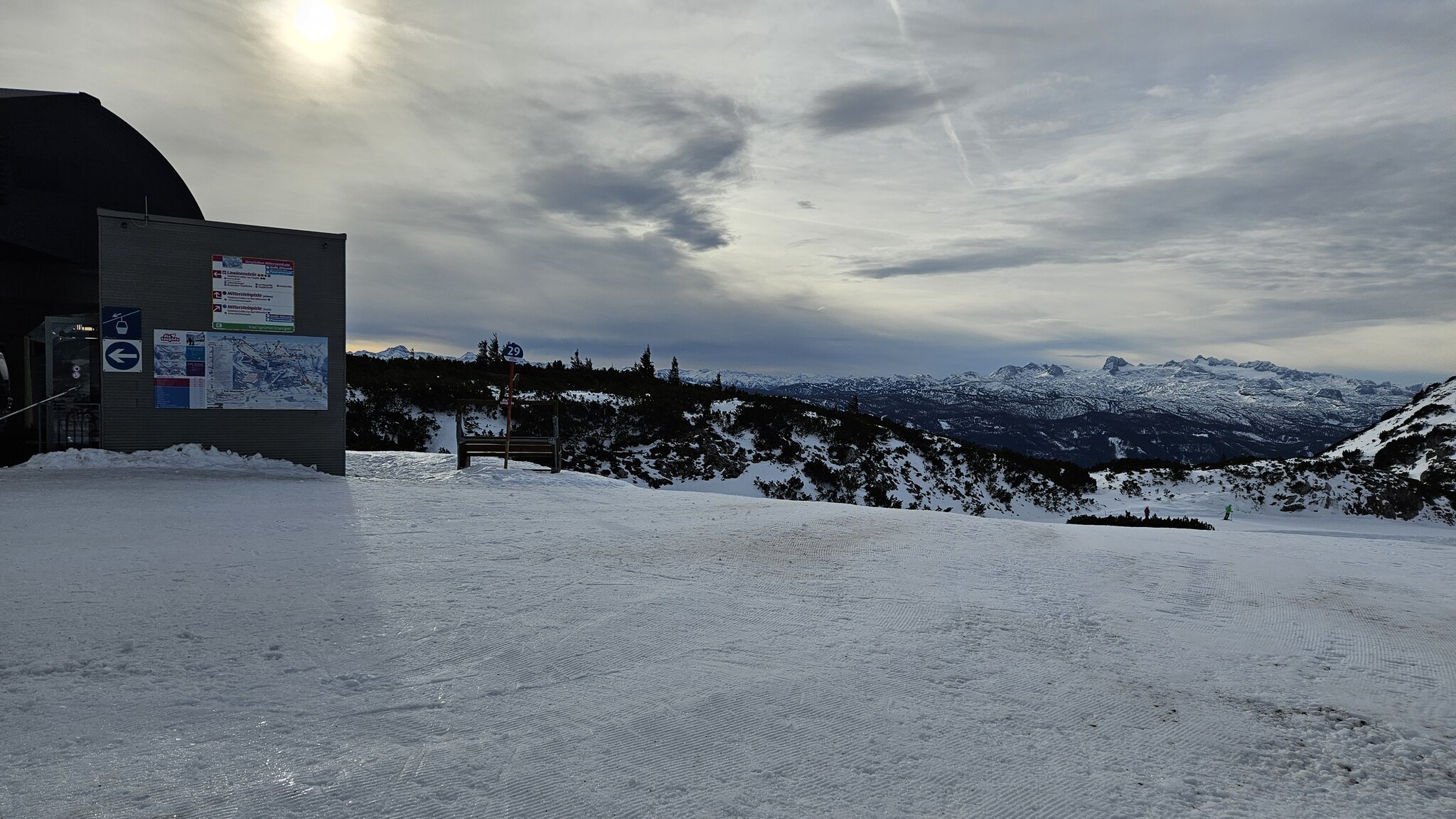 Nun ist auch der komplette Bereich Schneiderkogel offen, der bei meinem ersten Besuch noch geschlossen war. Hier war etwas mehr los, anstehen musste ich aber nur einmal und zwar etwa 4 - 5 Sessel. Etwas überraschned war vor allen der erste Steilhang der schwarzen 16 ziemlich eisig, der Neuschnee wurde abgerutscht und auch tlw. verblasen und der in der Vorwoche aufgefirnte Altschnee war bockhart. Die 'rundherum' - Pisten 15 und 17 waren deutlich besser. Aber die Aussicht dort oben ist ein Traum: