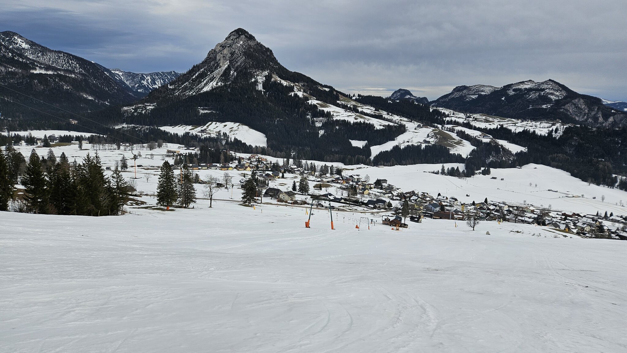 Interessante Schneesituation: im Tal halbwegs winterlich, auf halber Höhe alles aper, am Berg wieder schöner Winter: