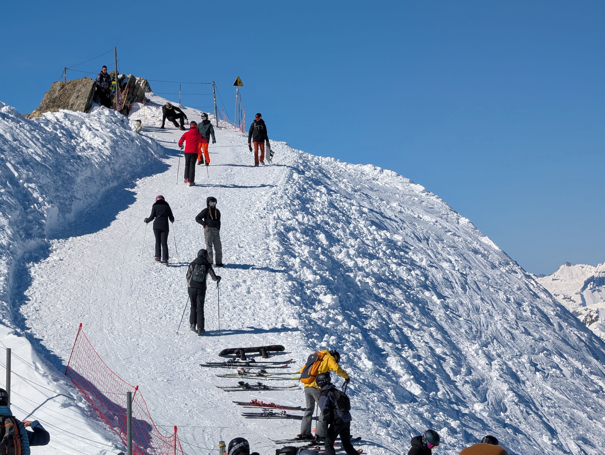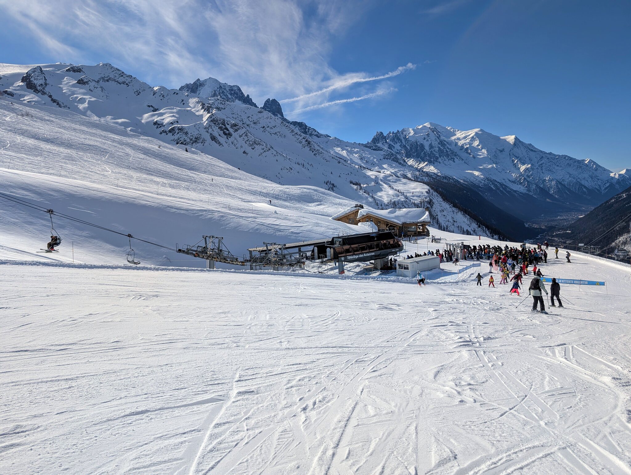 Im TK Reines kann man auch einigermassen den Wartebereich des TS Autannes einsehen, wo ich dann entschieden habe zu wechseln. Rüberfahrt mit Solonges haut und Solonges bas, letztere wirklich ein Traum. Dann mit dem TK Arve zwei Fahrten, da der Lift extrem leer war und die blaue Piste Arve viel weniger frequentiert ist als die parallel laufende Ecuries. Die Abfahrt nach Le Tour war auch sehr gut, wobei unten schon ganz leicht sulzig wurde und ein kurzer Bereich vor dem "Sulz" leicht rutschig war (fiel wahrscheinlich nur durch den direkten Vergleich auf). Dann musste ich in den sauren Apfel beissen und den TS Autannes nehmen. Die Wartezeit von ca. 5-7 min war teilweise einfach dummen Positionsgetausche und wartenden Leuten geschuldet.