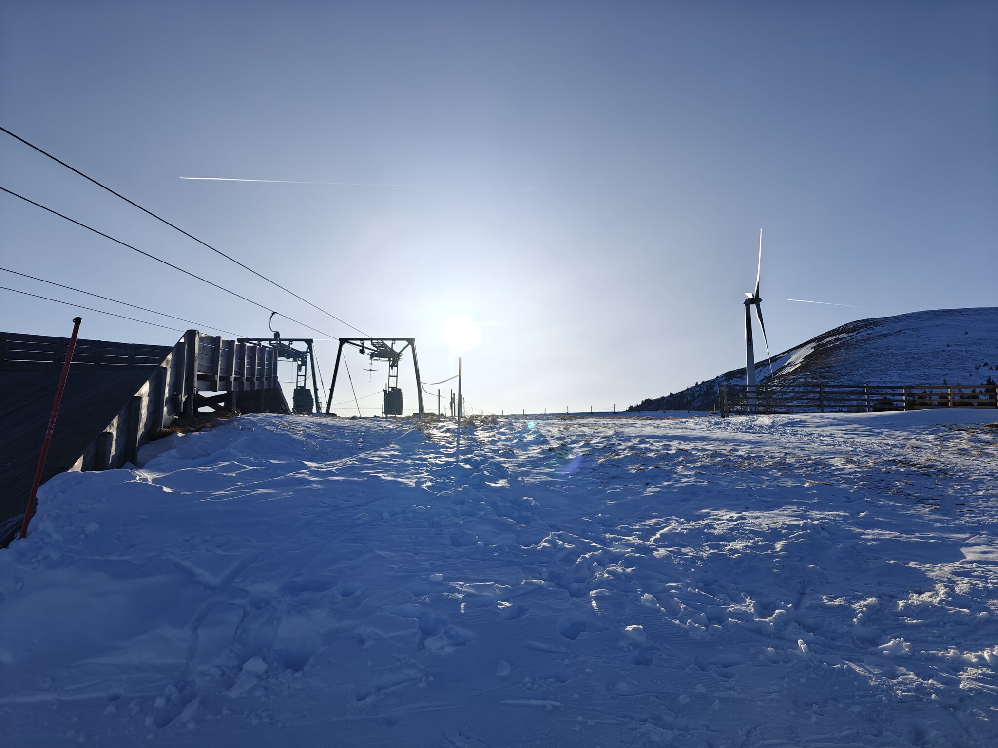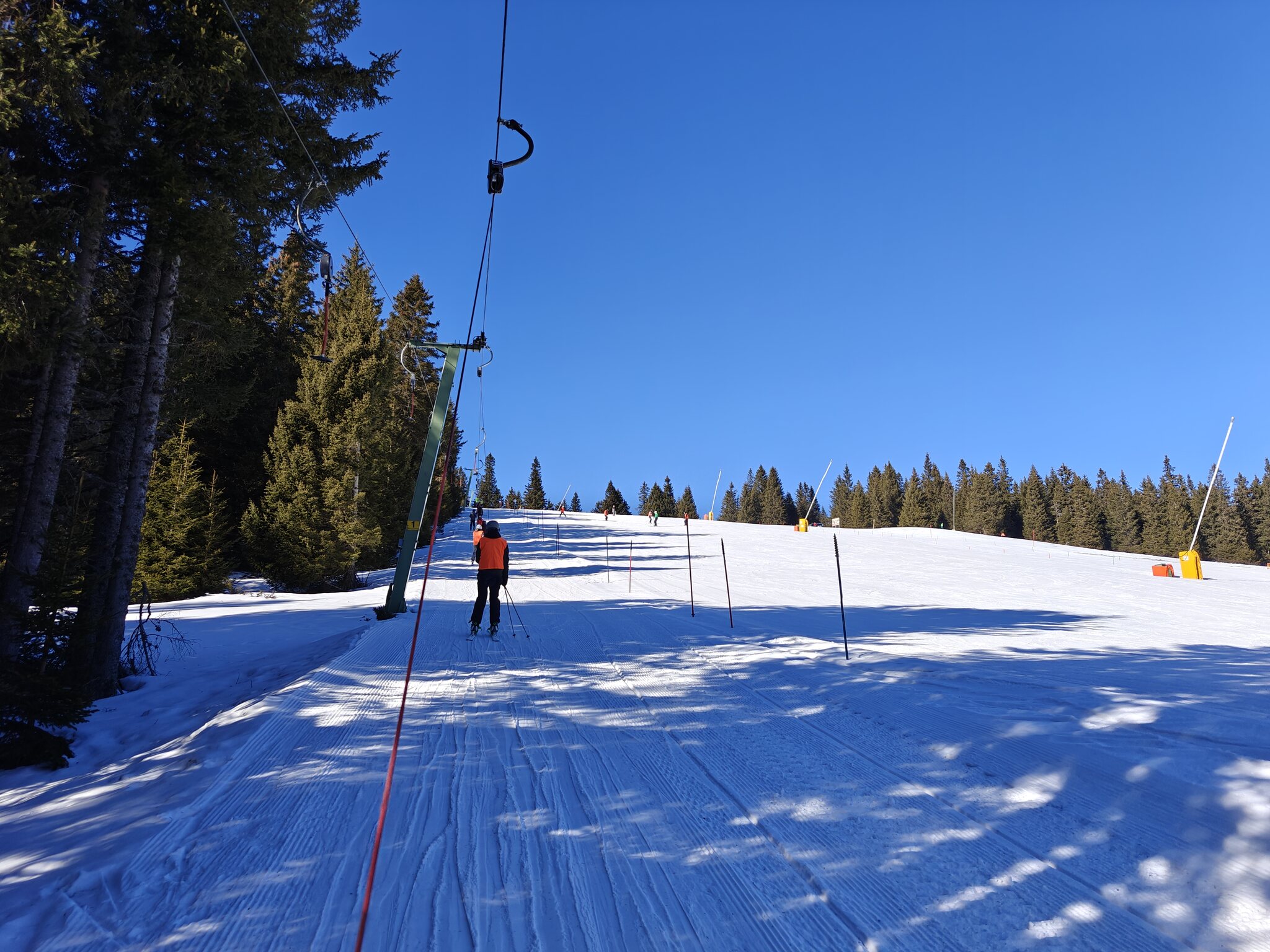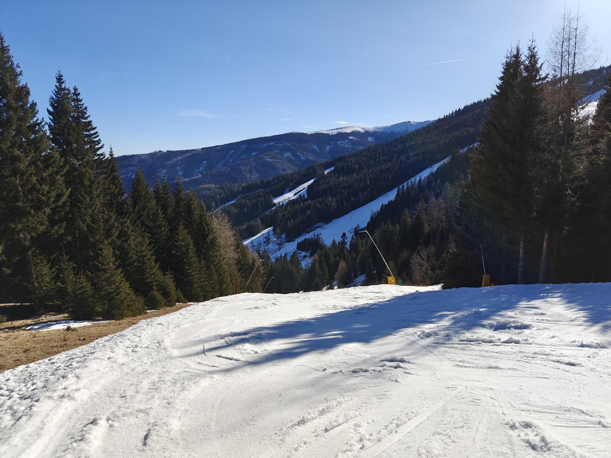Es sind alle Lifte mit Ausnahme des Muldenlifts geöffnet. Bei den Pisten fehlen ein paar kleinere Varianten. Das Wetter ist sehr warm und wolkenlos. ^ Blick auf die Hauptbeschäftigungsanlagen. Links Langbügel, rechts Kurzbügel. ^ Wir starten aber beim Buchenlift, damit wir nicht aufsteigen müssen. Der fährt aber etwas langsam. ^ Die Speiklifte sind deutlich schneller unterwegs. Ich kemne kaum Schleoplifte, die schneller sind. ^ Die Schneelage auf den Pisten ist sehr gut. In der Umgebung liegt aber kaum etwas. ^ Die rechte Außenherumpiste ist im oberen Teil eher flacher. ^ Die schwarze Piste unterhalb des Muldenlifts ist etwas angerutschter. ^ Auch der Zwergenlift muss gefahren werden. ^ Die sonnige Außenherumpiste firnt schon auf