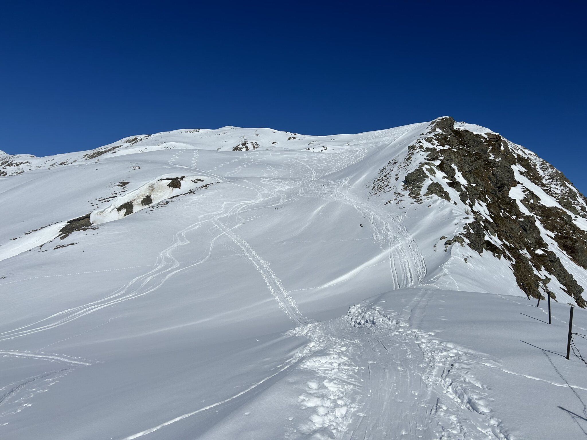 Gipfel Langschneid bietet ein 360 Grad Panorama vom Großglockner bis zu den Dolomitem. Absolut lohnenswert. Gibt noch weitere Abfahrtsvarianten in alle Richtungen, aber da ich meine Gruppe im Skigebiet nochmal treffen wollte bin ich die Aufstiegsroute einfach zurück.