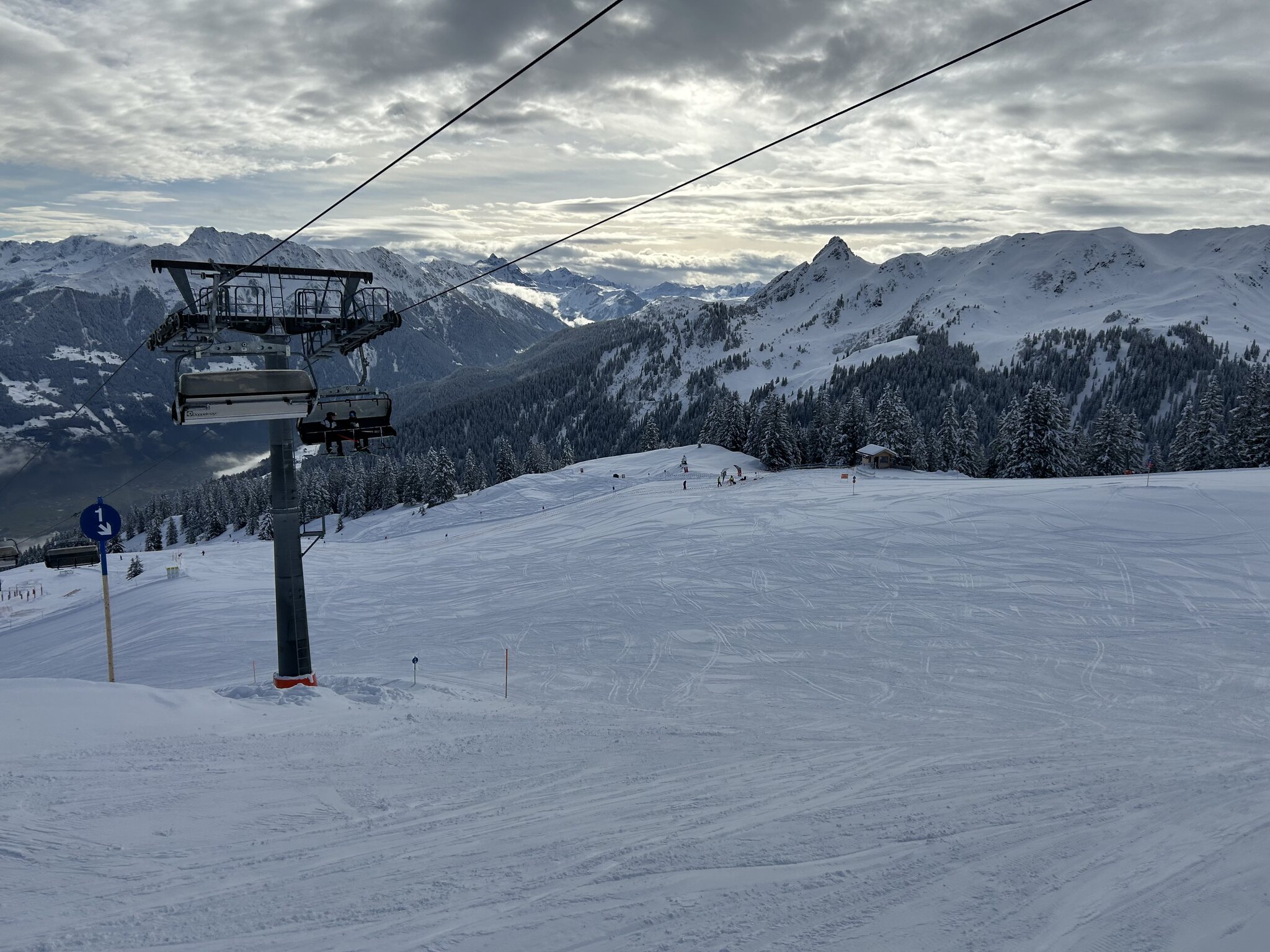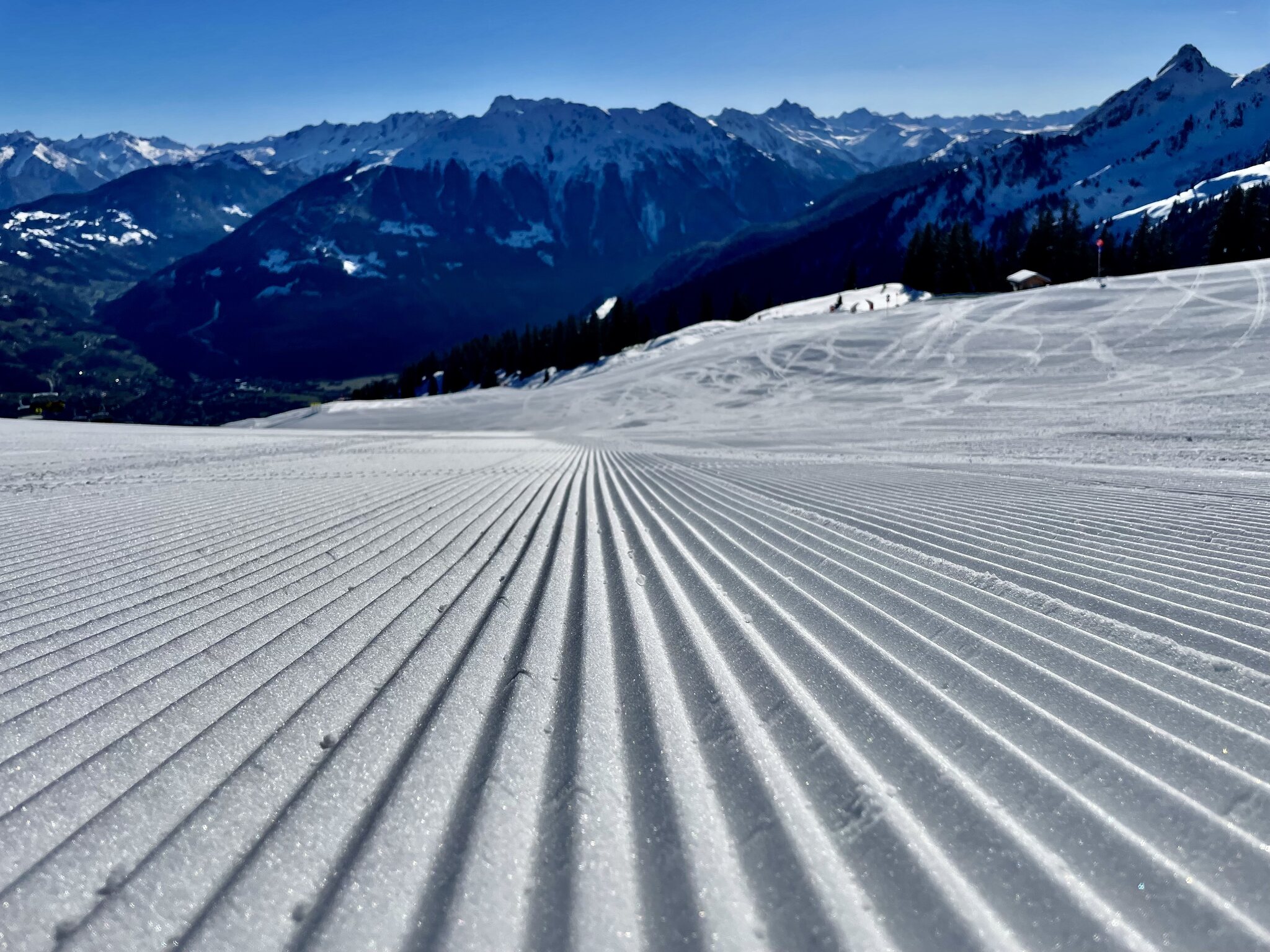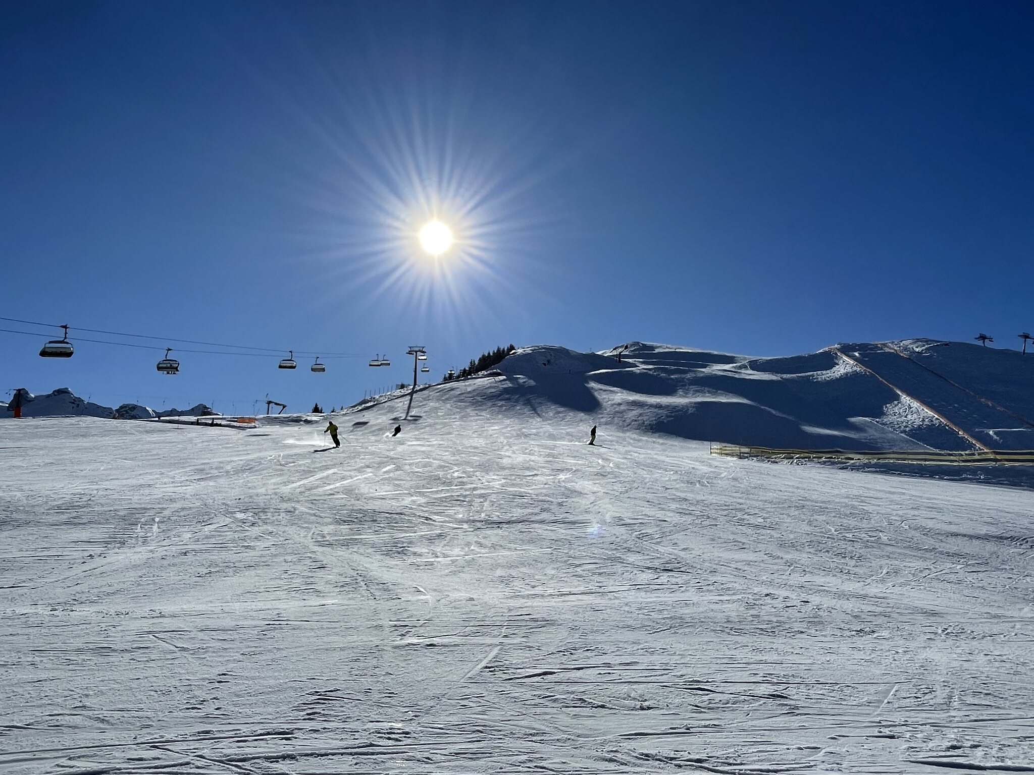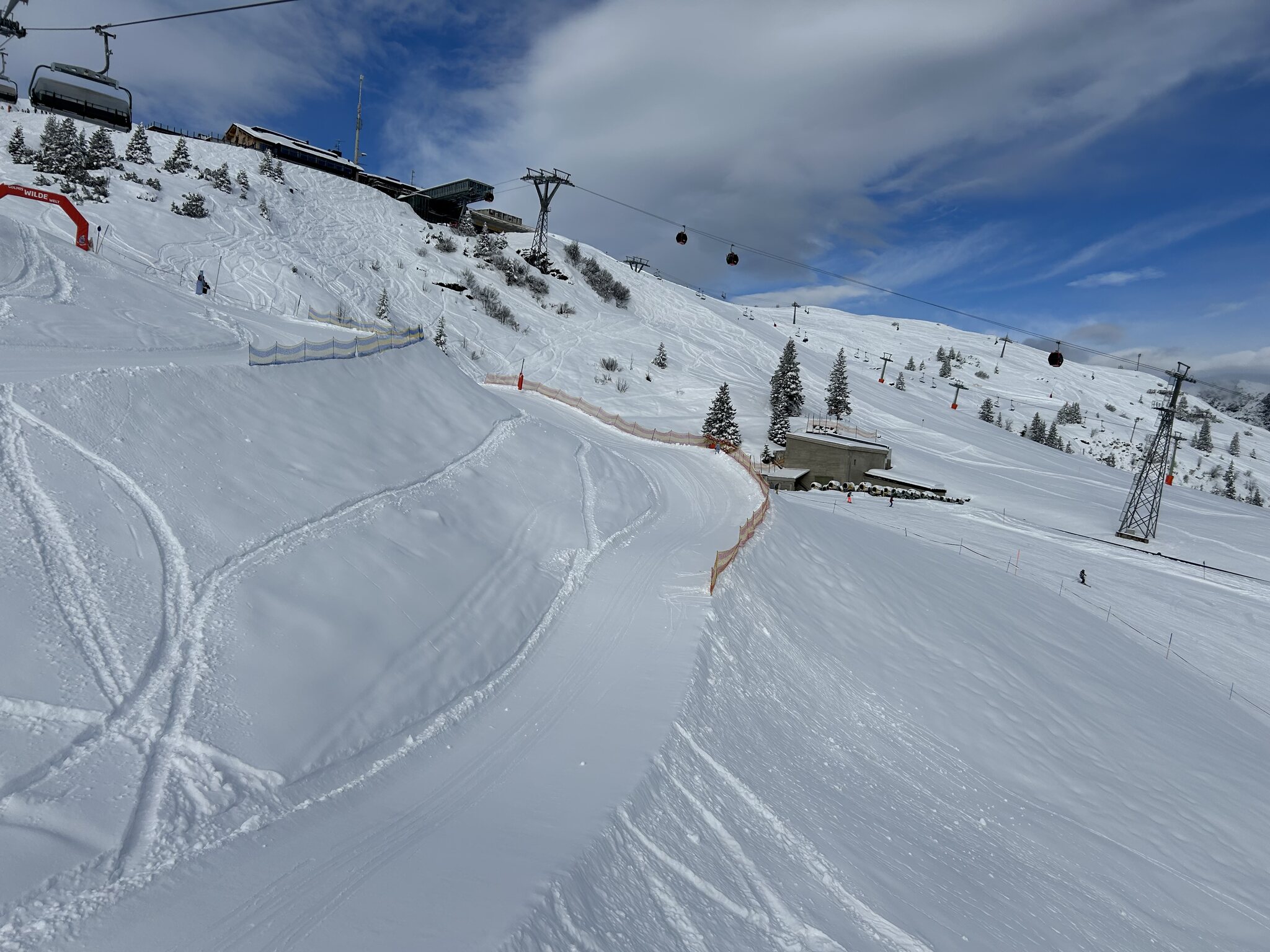 kaum Andrang und perfekte Pisten bis am ende des Tages, nur im untersten Abschnitt um Matschwitz wurde es am Nachmittag sulzig. Ansonsten genial harte Pisten ohne Haufenbildung und glattgebügelt präpariert. Die Talabfahrt nach Latschau ist offiziell geschlossen aber noch gut fahrbar. Nur ein Hang ist ziemlich braun und die Strasse muss springend oder laufend gequert werden.