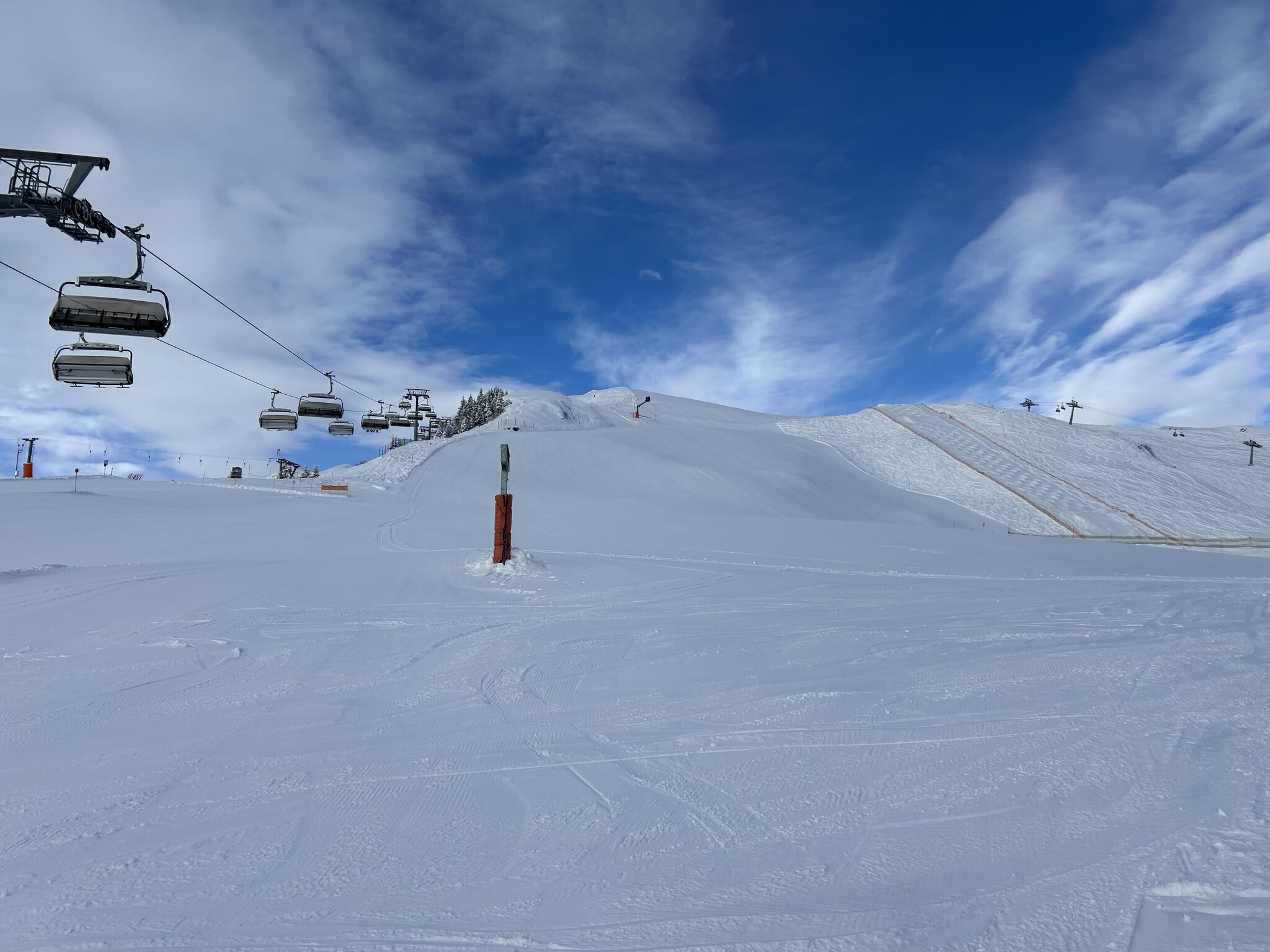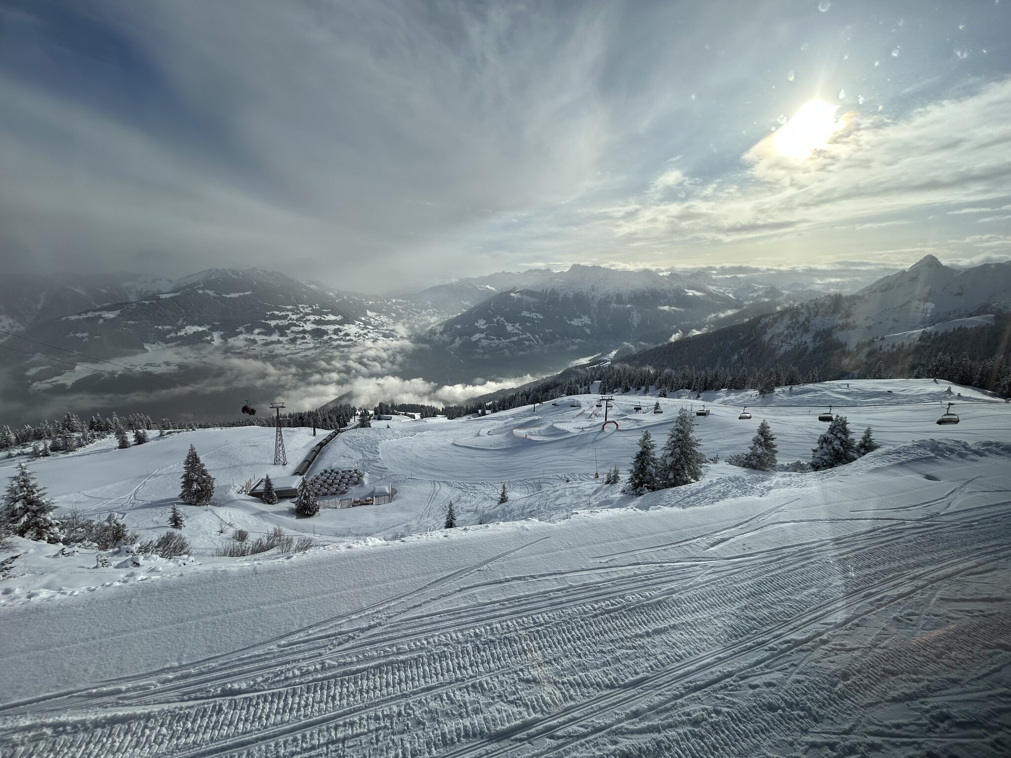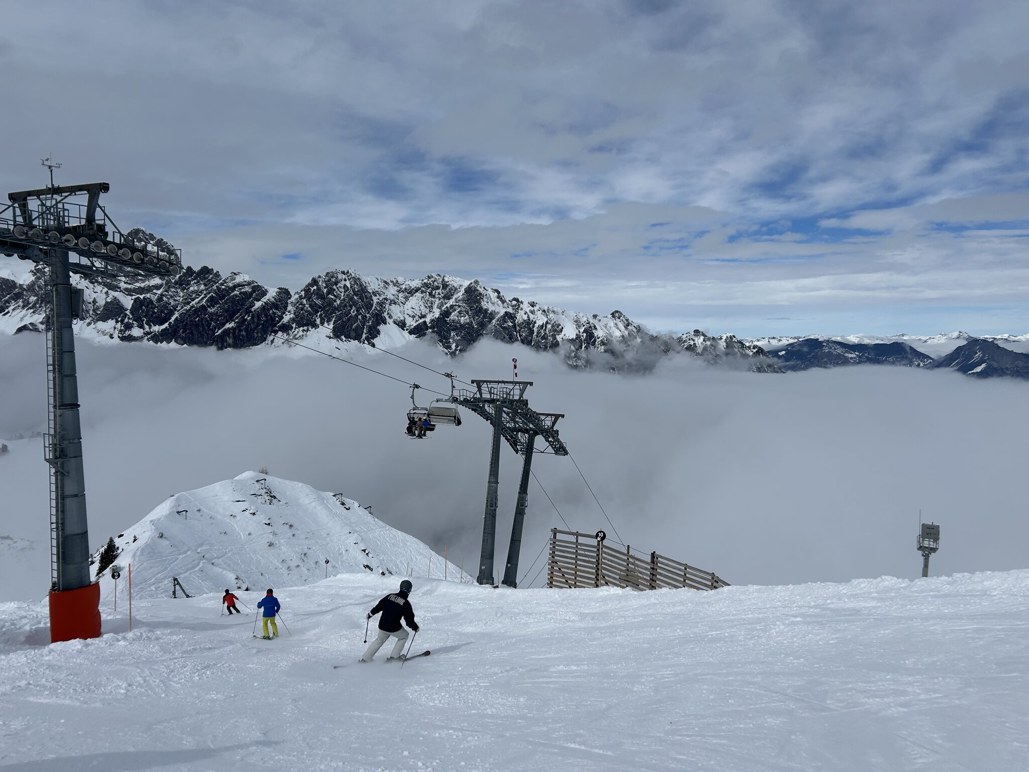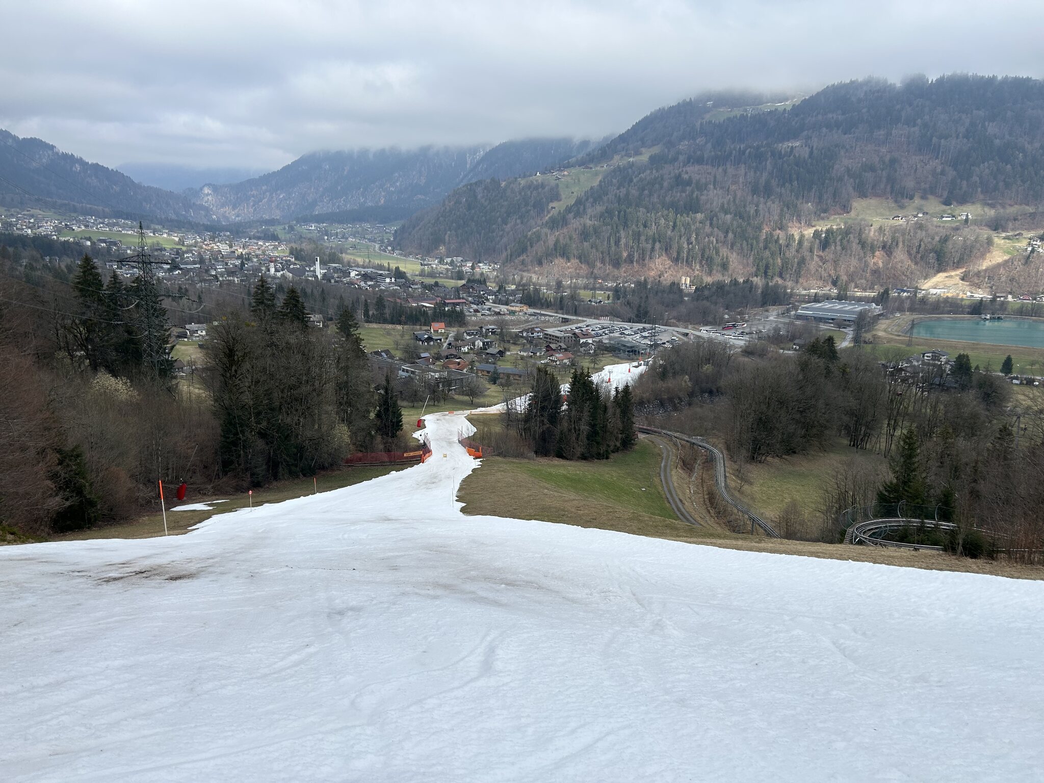 kaum Andrang und perfekte Pisten bis am ende des Tages, nur im untersten Abschnitt um Matschwitz wurde es am Nachmittag sulzig. Ansonsten genial harte Pisten ohne Haufenbildung und glattgebügelt präpariert. Die Talabfahrt nach Latschau ist offiziell geschlossen aber noch gut fahrbar. Nur ein Hang ist ziemlich braun und die Strasse muss springend oder laufend gequert werden.
