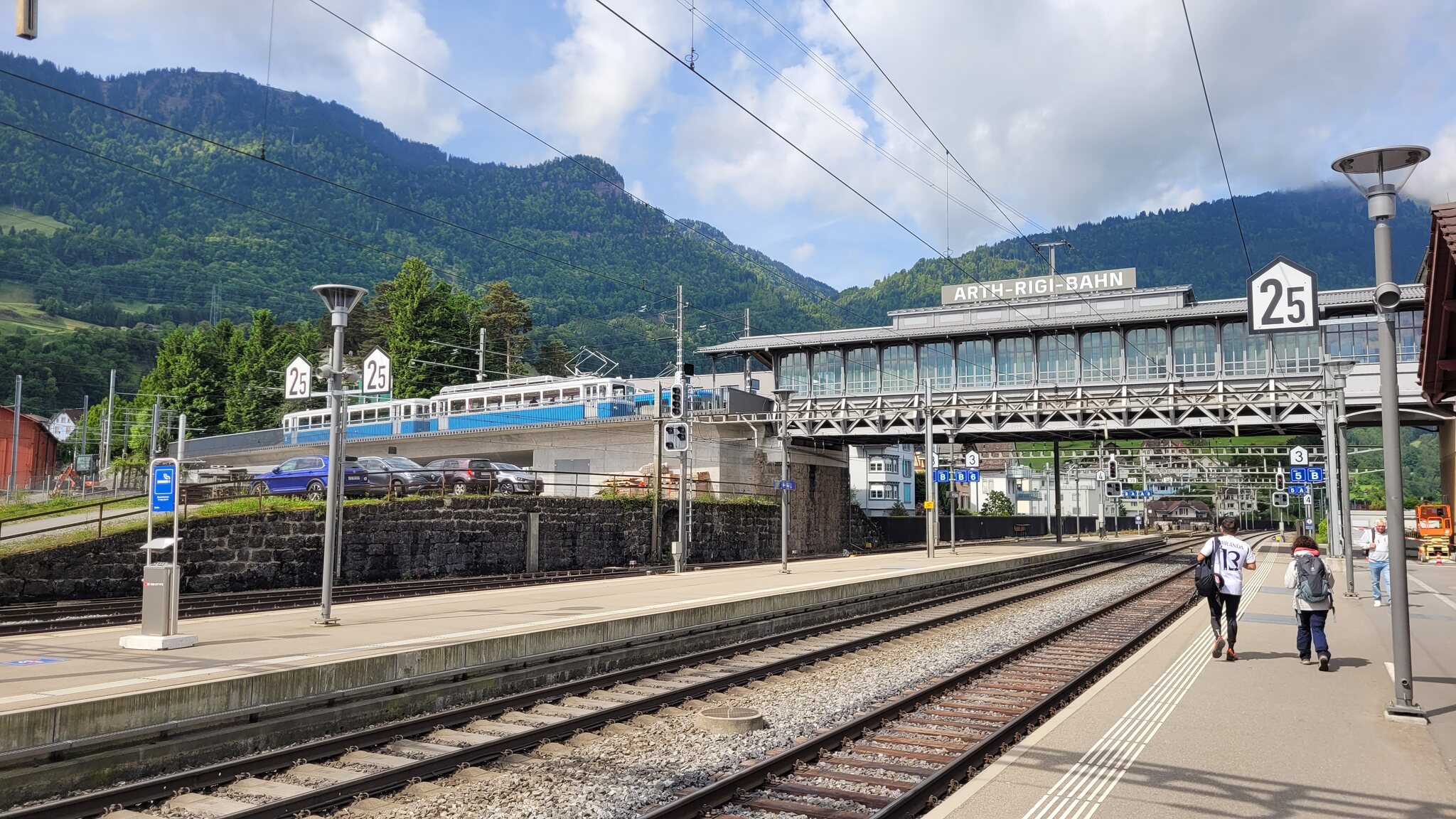 Mein letzter Besuch auf der Rigi war in den 90ern, ich hatte also Nachholbedarf. Start war am Bahnhof Arth-Goldau, über dem die Rigibahn eine Art Bahnhofsbrücke hat.