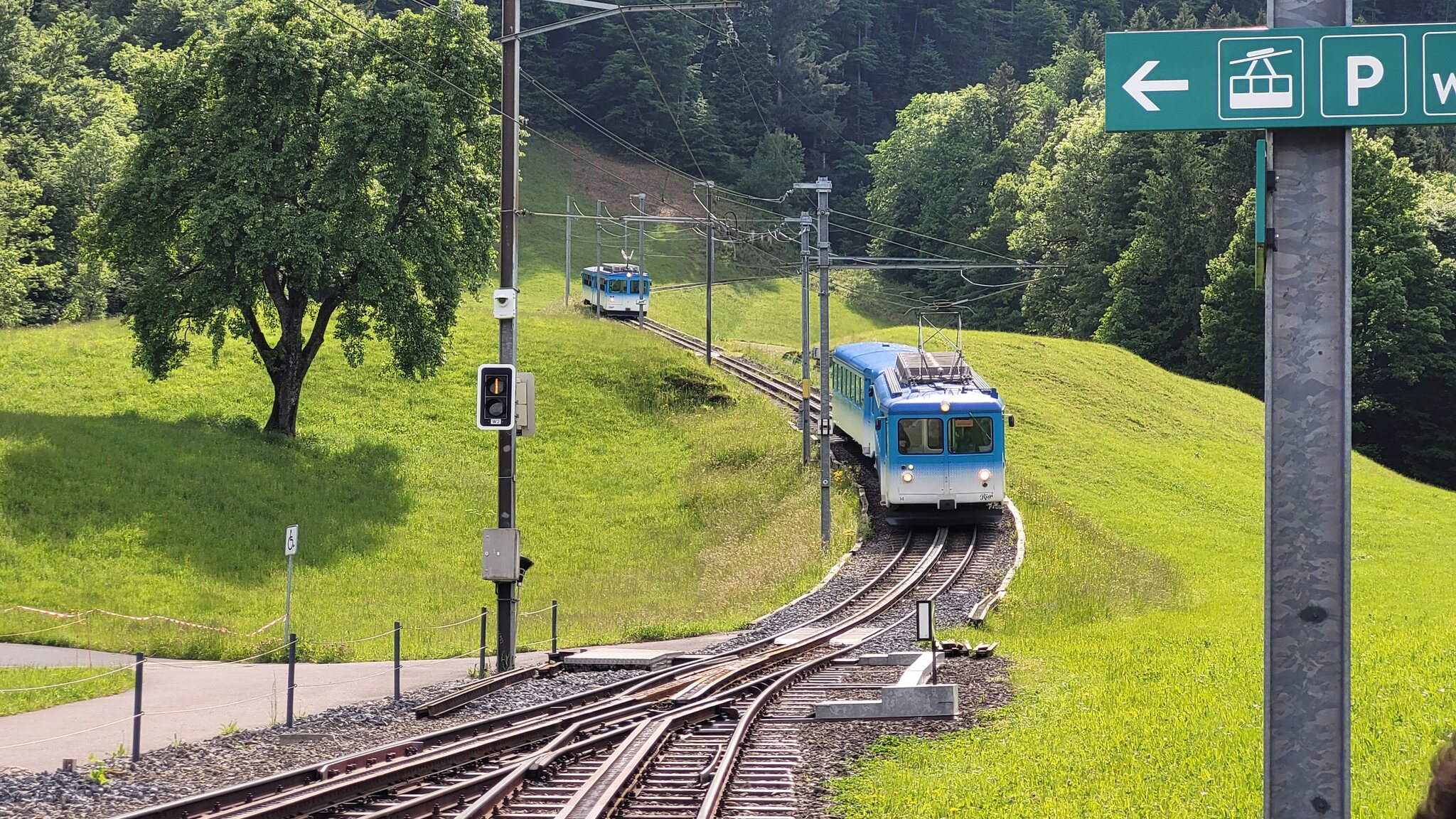Nach dem Abstecher nach Weggis ging es wieder mit der Zahnradbahn nach Staffel. Auf dieser Streck fahren moderne Züge.