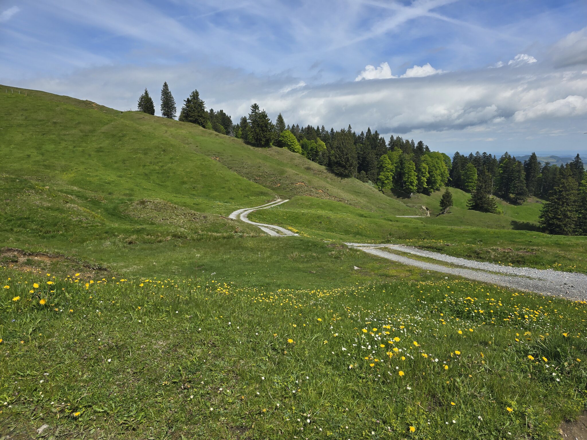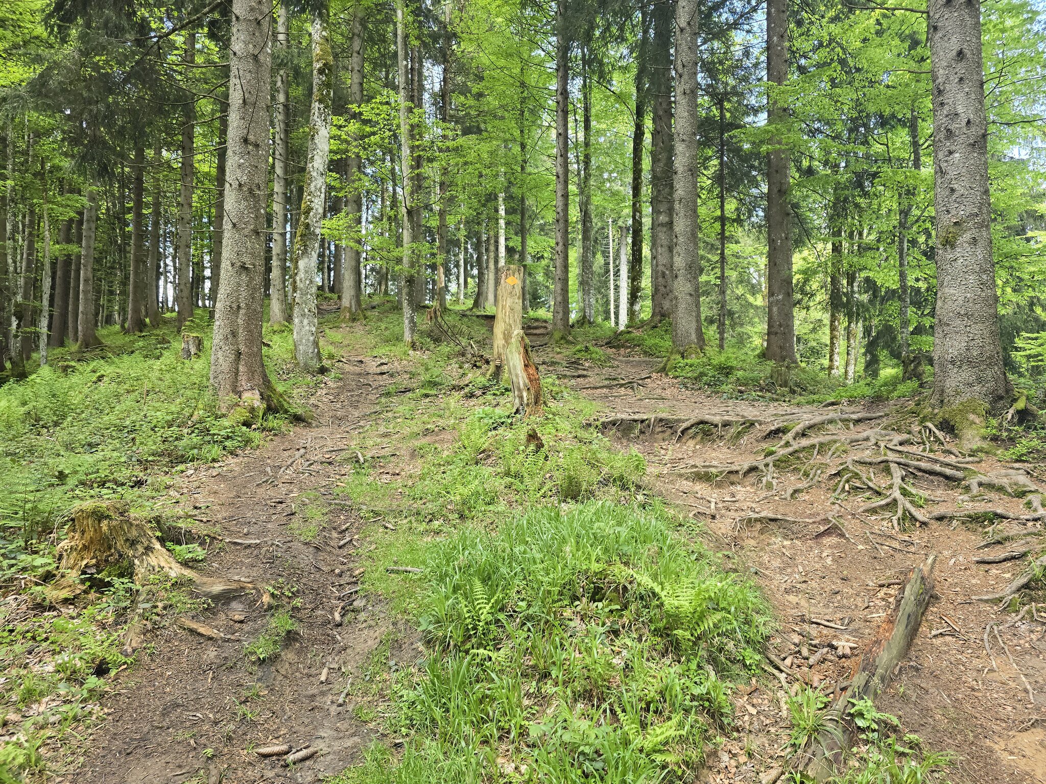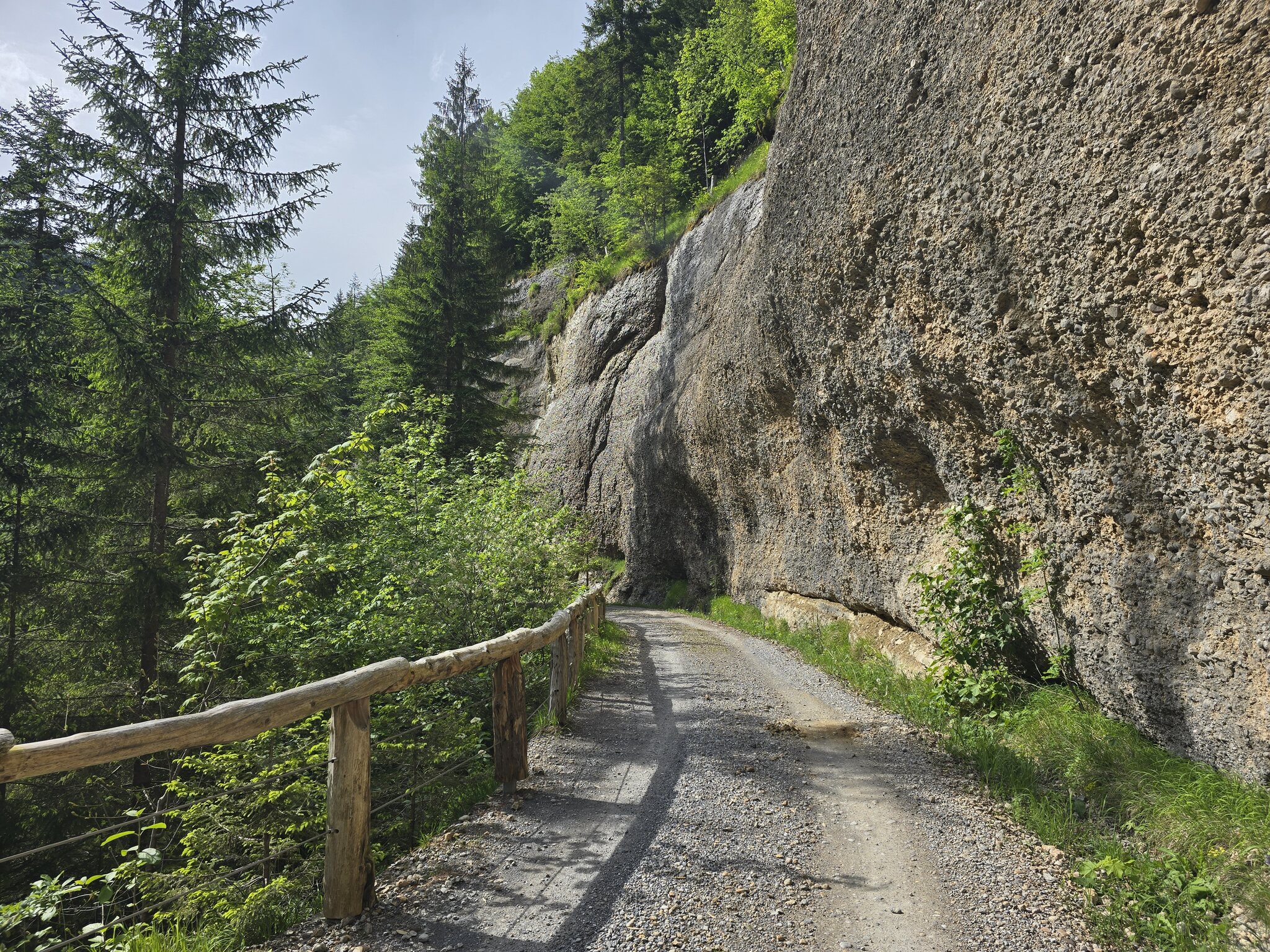 So starte ich morgens gegen halb 9 von Zuhause und fahre zuerst mit dem Zug nach Ebnat-Kappel. Dort angekommen beginnt nach wenigen Minuten Fahrzeit der Anstieg ins Steintal. Nach einigen Kilometern zweige ich rechts auf eine Schotterstrasse ab. Dort geht es zuerst mit moderater Steigung nach oben, doch bald wird die Strasse immer steiler. Für mich mit dem Mountainbike zwar anstrengend, aber problemlos fahrbar. Ich überhole aber einige andere Radfahrer mit Gravel-Bike, welche schieben. Später erfahre ich, dass sie am "Züri Escape", einem dreitägigen Gravel-Bike Event über 400 km und 10'000 Höhenmeter teilnehmen und ihre Kräfte nicht schon morgens auf dem ersten Anstieg des Tagens aufbrauchen wollen.