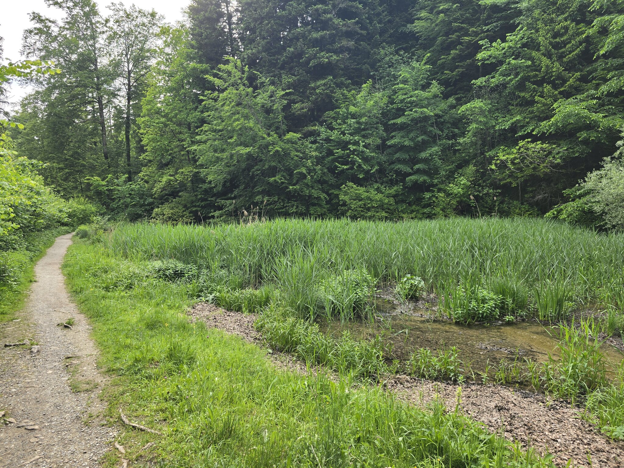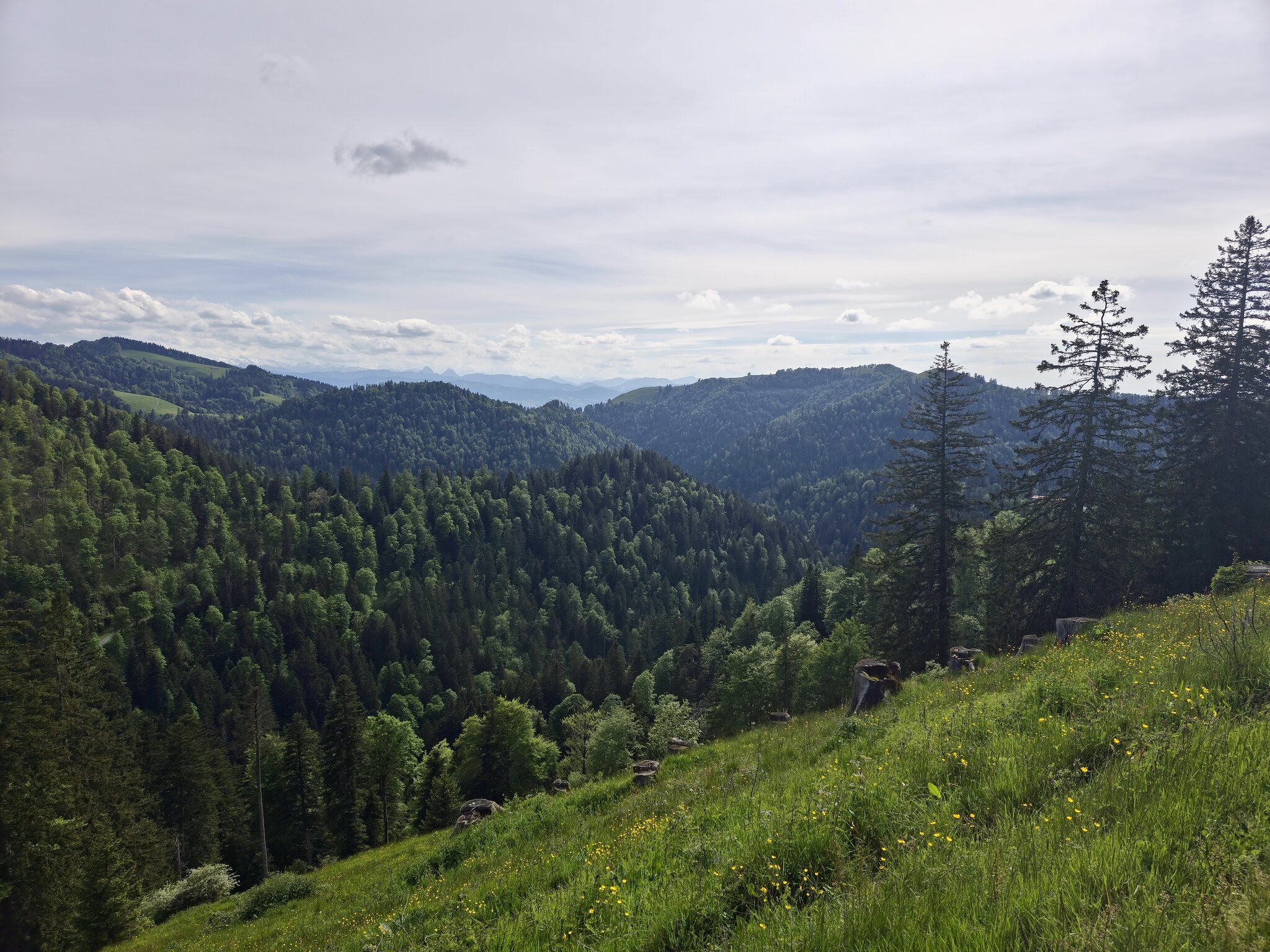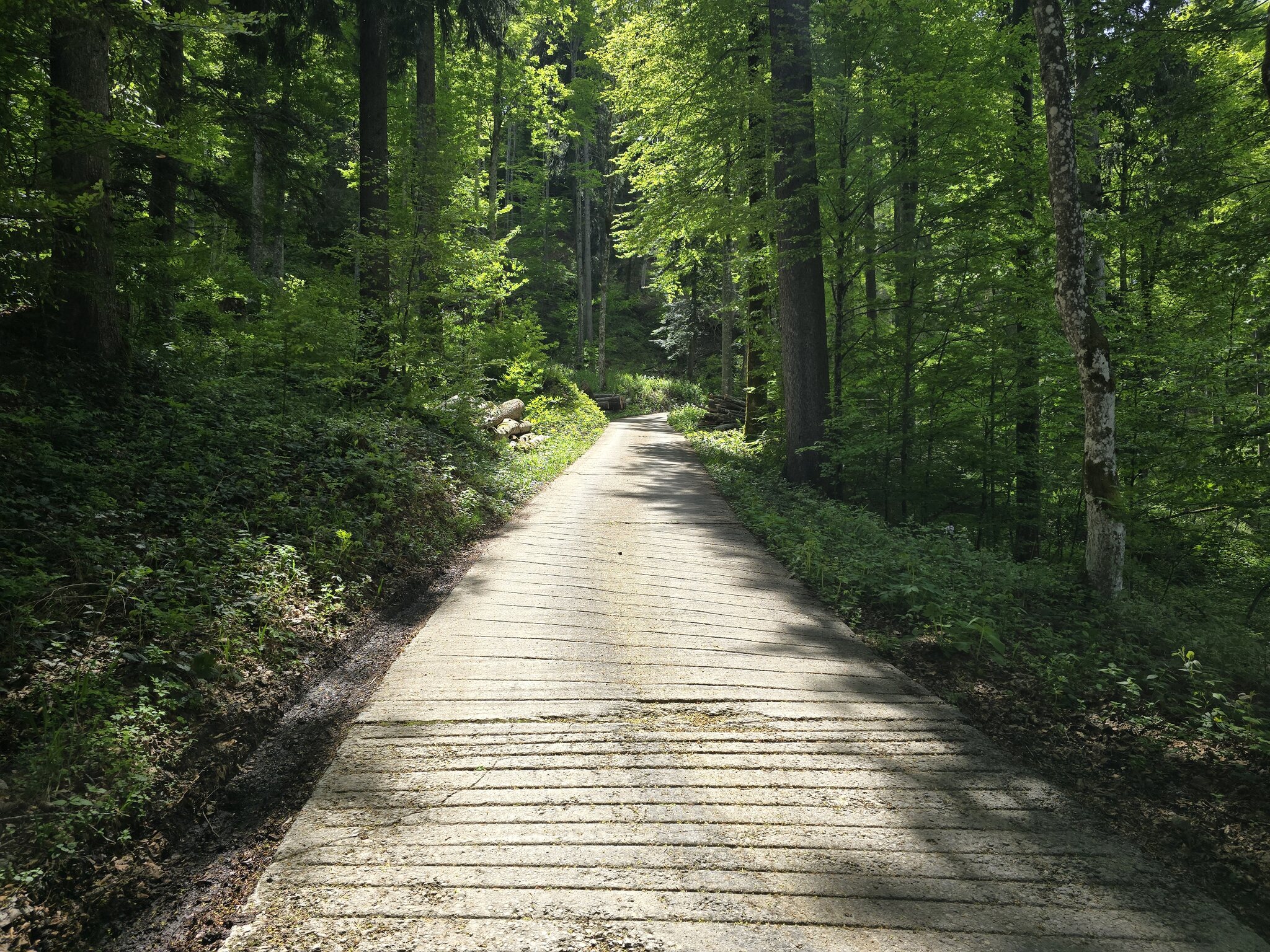 So starte ich morgens gegen halb 9 von Zuhause und fahre zuerst mit dem Zug nach Ebnat-Kappel. Dort angekommen beginnt nach wenigen Minuten Fahrzeit der Anstieg ins Steintal. Nach einigen Kilometern zweige ich rechts auf eine Schotterstrasse ab. Dort geht es zuerst mit moderater Steigung nach oben, doch bald wird die Strasse immer steiler. Für mich mit dem Mountainbike zwar anstrengend, aber problemlos fahrbar. Ich überhole aber einige andere Radfahrer mit Gravel-Bike, welche schieben. Später erfahre ich, dass sie am "Züri Escape", einem dreitägigen Gravel-Bike Event über 400 km und 10'000 Höhenmeter teilnehmen und ihre Kräfte nicht schon morgens auf dem ersten Anstieg des Tagens aufbrauchen wollen.