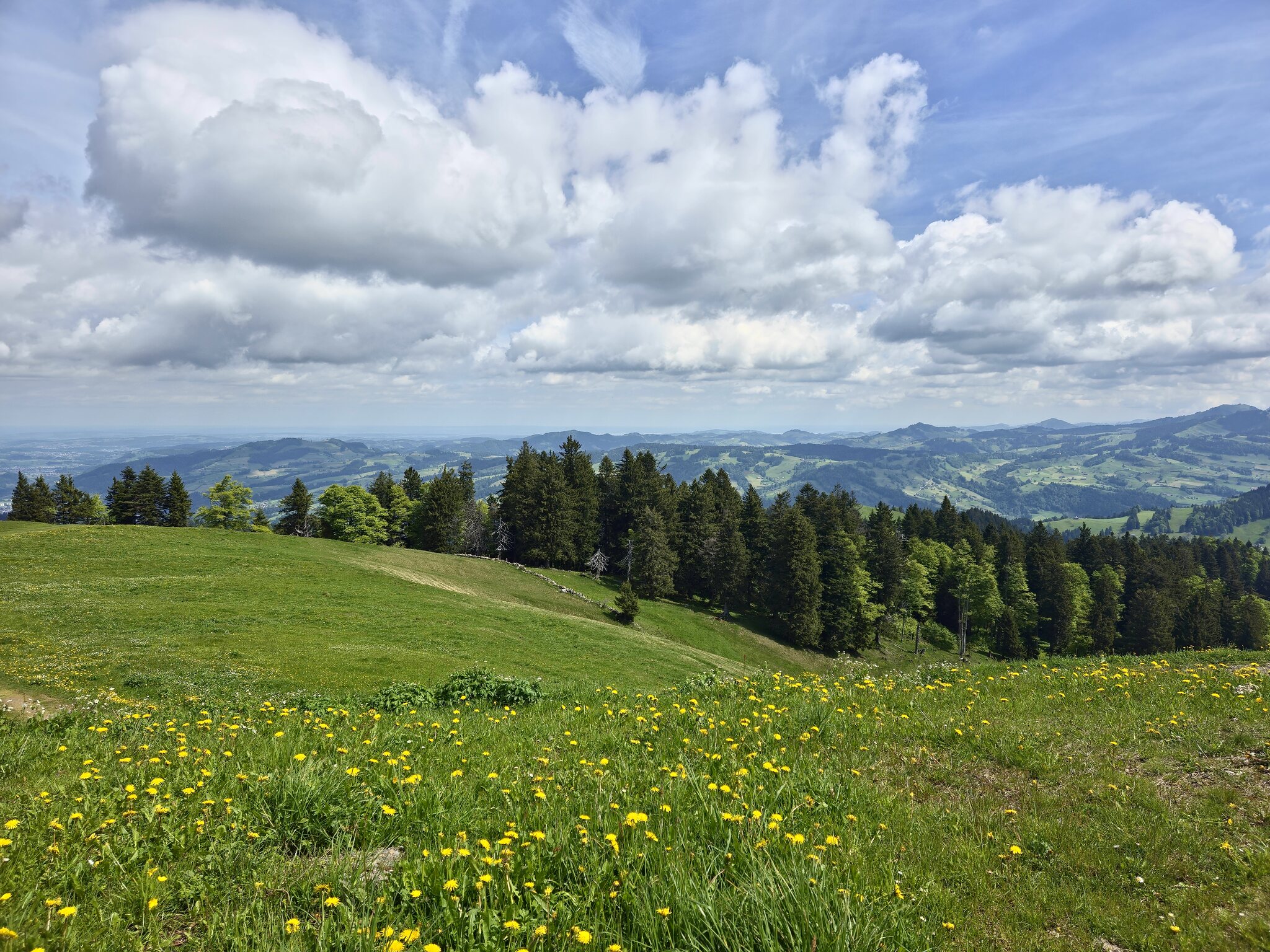 Gut eine Stunde nach dem Start in Ebnat-Kappel erreiche ich den Tanzboden. Auf dem Tanzboden geht jedoch ein strammer Wind und die Temperatur liegt wohl deutlich unter 10°C. So halte ich es nicht allzu lange aus und mache mich auf den Weg in Richtung Regelstein. Ich bin mir nicht ganz sicher, ob dieser Trail mit dem Bike befahren werden dürfte. Es gibt hier einige alte Tafeln, die auf ein allfälliges Verbot hinweisen, so wirklich klar ist das ganze aber nicht. Im Toggenburg gibt es allgemein sehr viele Beschilderungen für Mountainbikes. Die darauf aufgeführten Routen lassen sich aber nirgends im Internet finden und so ist es im Allgemeinen schwierig Herauszufinden, wo die ausgeschilderten Routen überhaupt hinführt. Teilweise fehlen an einzelnen Abzweigungen auch Schilder. Es scheint so, als ob da mal vor etlichen Jahren ein Routen-Netz aufgebaut wurde, welches aber nun während etlichen Jahren vernachlässigt wurde. So ignoriere ich die in die Jahre gekommene Tafel und biege trotzdem in den Trail in Richtung Regelstein ein. Es hat sich dann auch niemand unterwegs beschwert, dass das Biken hier verboten wäre. Der Trail vom Tanzboden zum Regelstein hat es in sich. Es geht abwechselnd abwärts und wieder aufwärts. Während bergab bis auf 1-2 Stellen alles gut fahrbar ist, muss das Bike bergauf immer wieder geschoben werden. Teilweise ist die der weg schlicht zu steil und teilweise erschweren Wurzeln und Absätze den Aufstieg. Nach einiger Zeit habe ich dann aber doch den Regelstein erreicht. Auch hier ist der Ausblick traumhaft: Mittlerweile ist es bereits kurz nach halb 1, sodass ich eine Mittagspause einlege. Auch hier auf dem Regelstein windet es, jedoch etwas weniger stark als zuvor auf dem Tanzboden. So lässt es sich von den Temperaturen her gerade so aushalten.