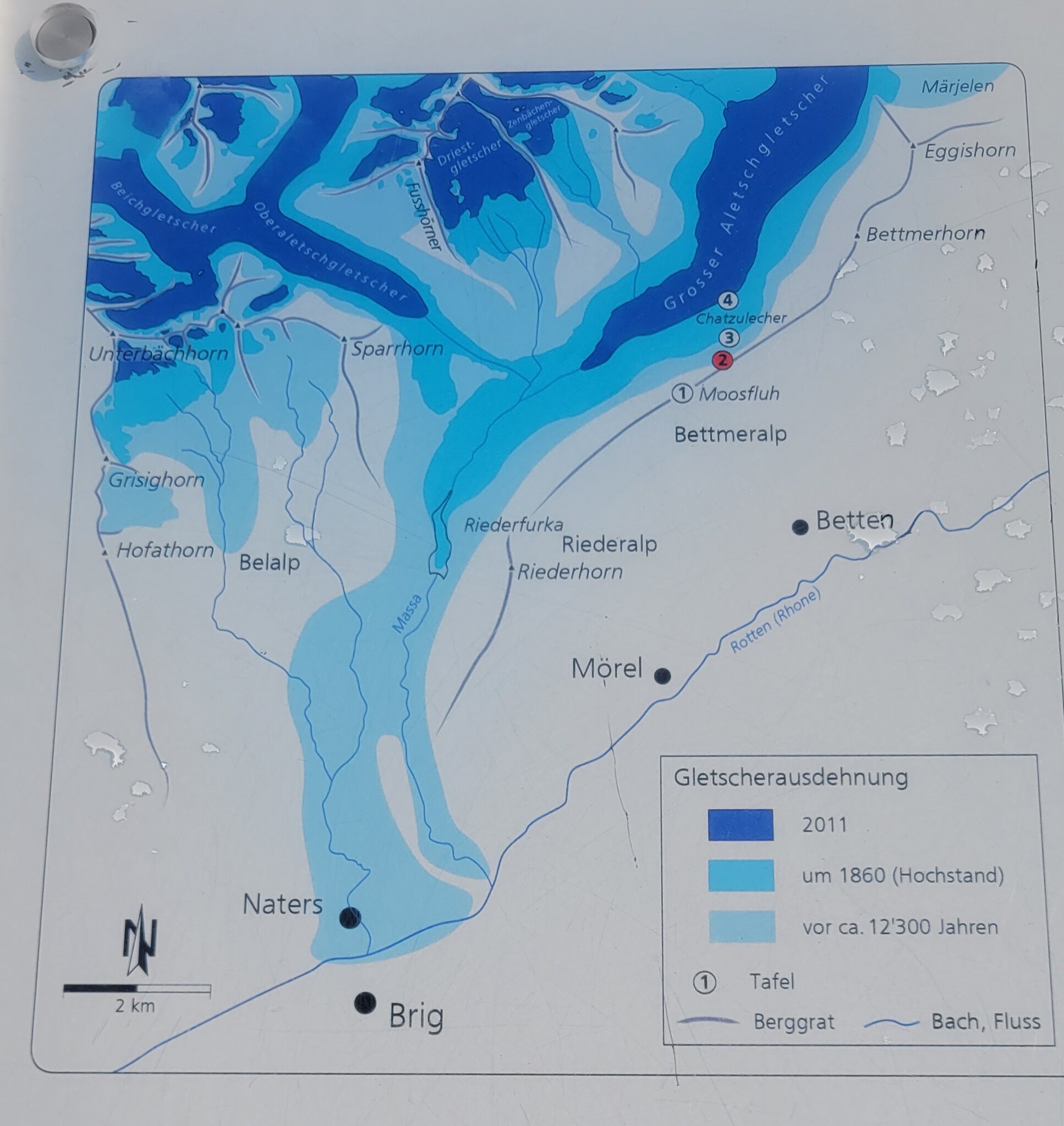 Auf einer Infotafel ist der Stand vor 12.000 Jahren drauf, damals ging der Gletscher sogar komplett runter bis Naters. 1860 war die maximale Ausdehnung bis zum heutigen Stausee.
