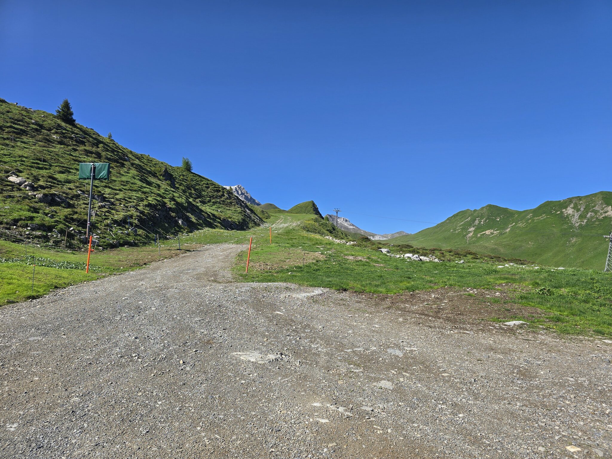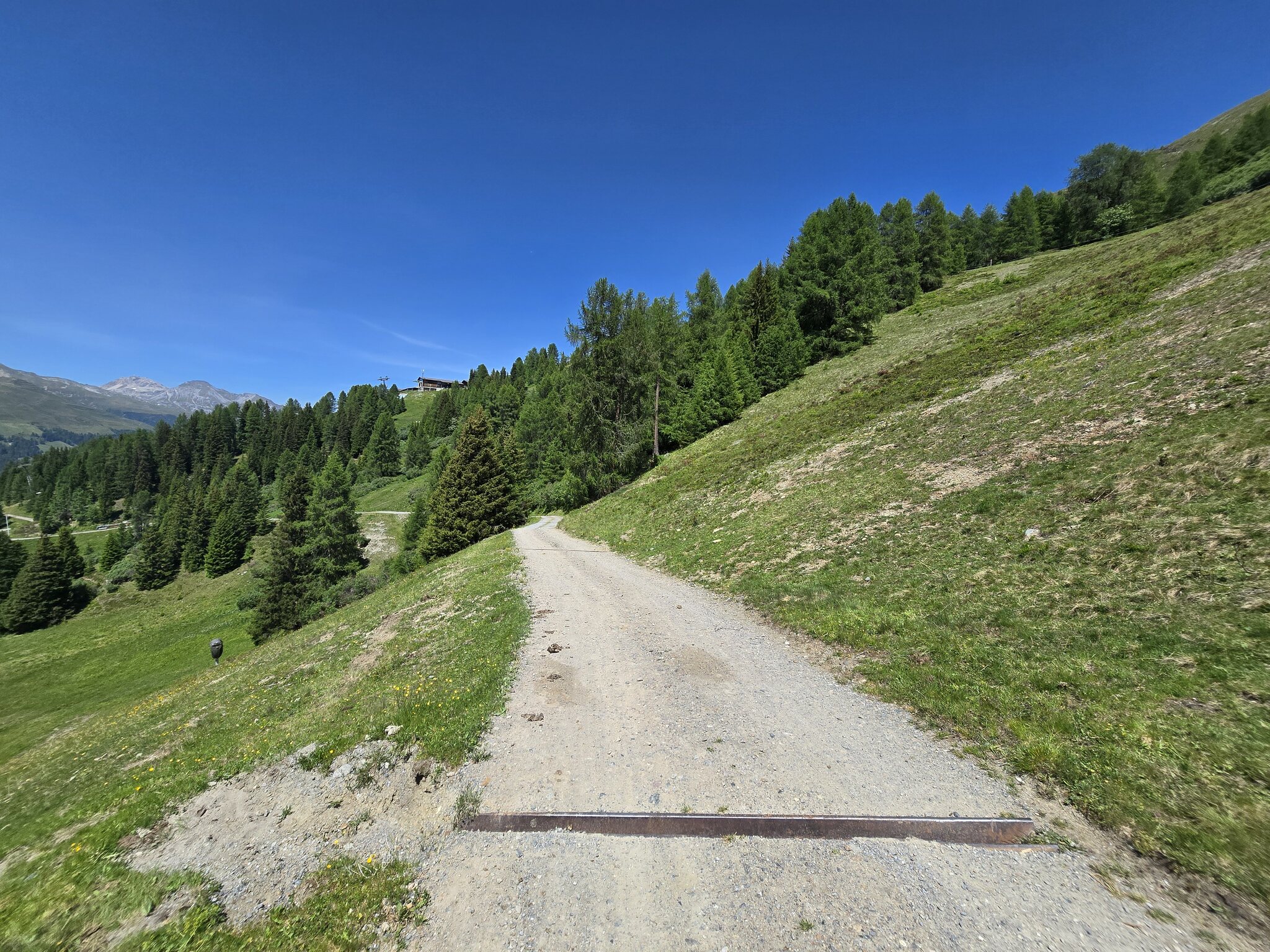 So starte ich also gegen 8:40 in Cavadürli. Zuerst geht es über einen Kiesweg zur Sereneuser Schwendi. Noch ist es mit rund 15° sehr angenehm. Auf der zweiten Hälfte der Strecke fährt man dabei über die Talabfahrt hoch. Während der Ziehweg im Winter doch teilweise sehr flach erscheint, ist es nun im Sommer mit dem Bike teilweise doch ordentlich steil.