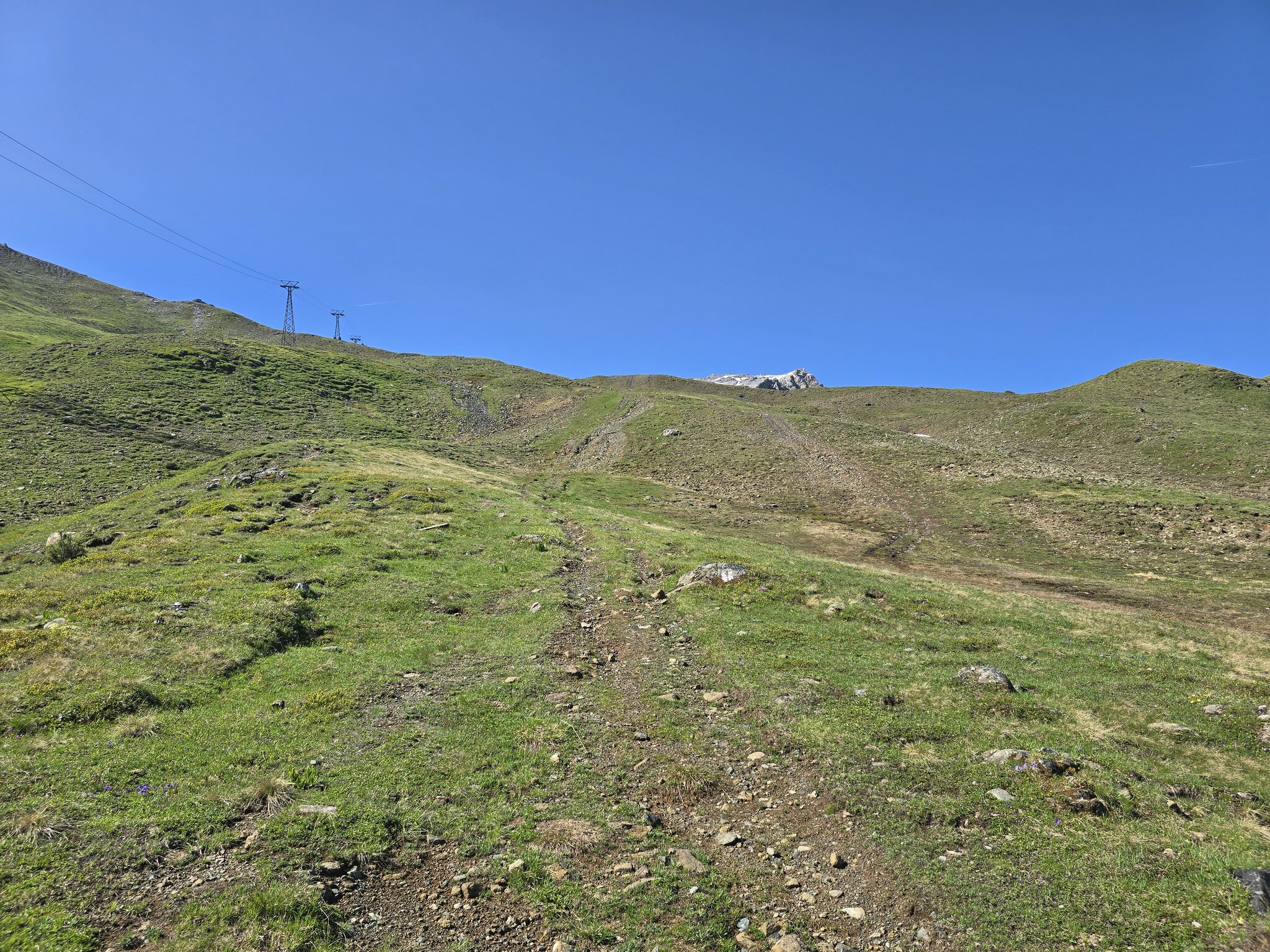 - Im Schlusshang der Nülli-Abfahrt. Wirkt im Sommer deutlich steiler als im Winter. Jetzt im Sommer ist es kaum vorstellbar, dass man hier im Winter problemlos mit hohem Tempo carven kann.