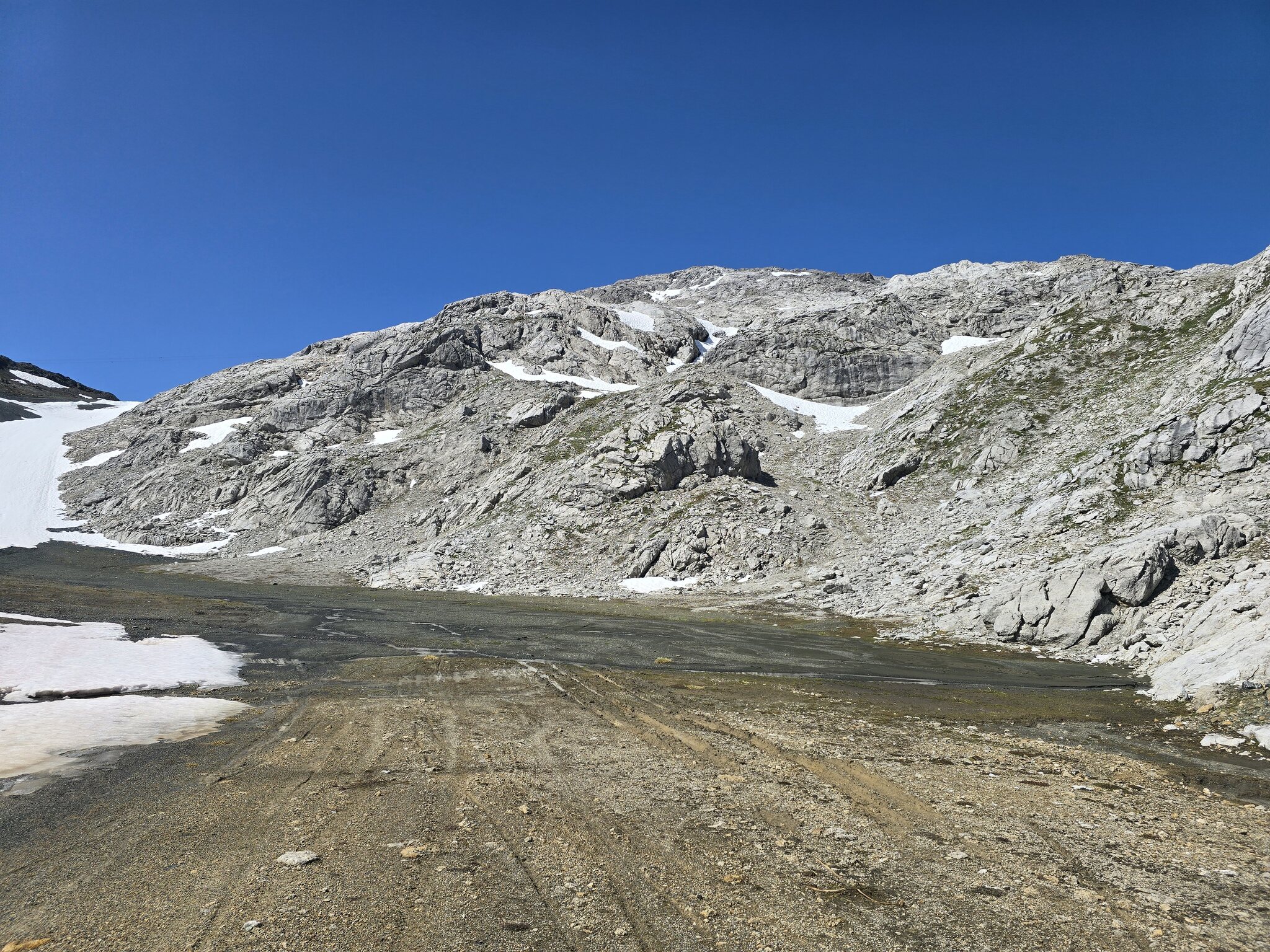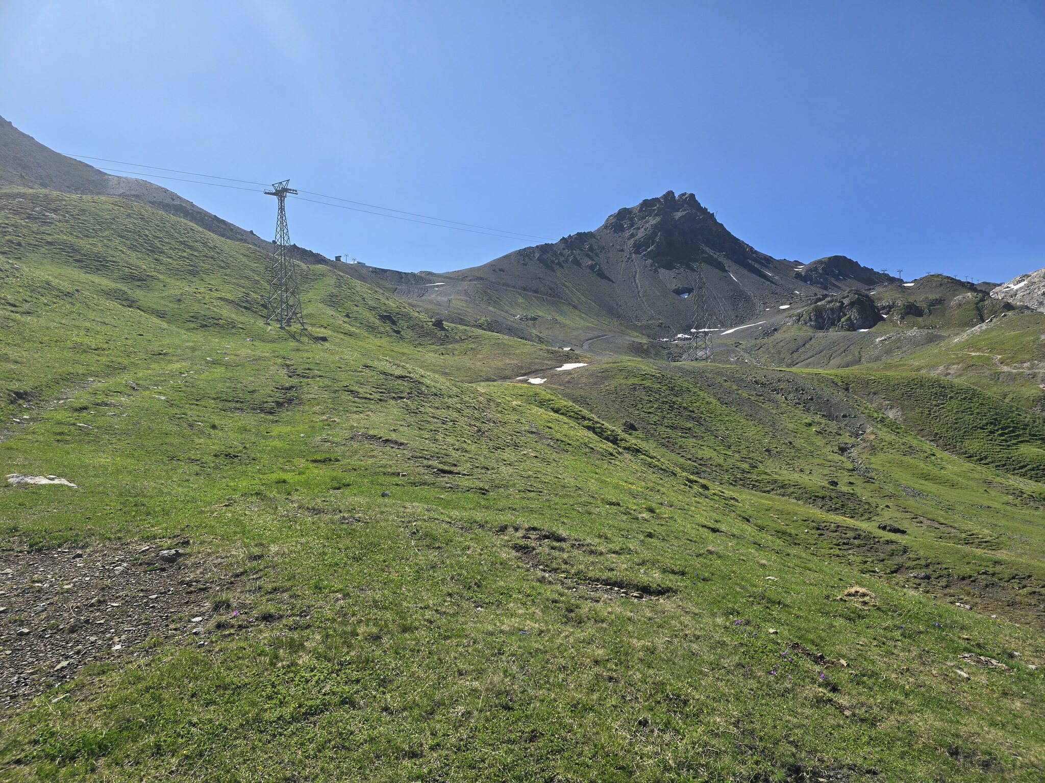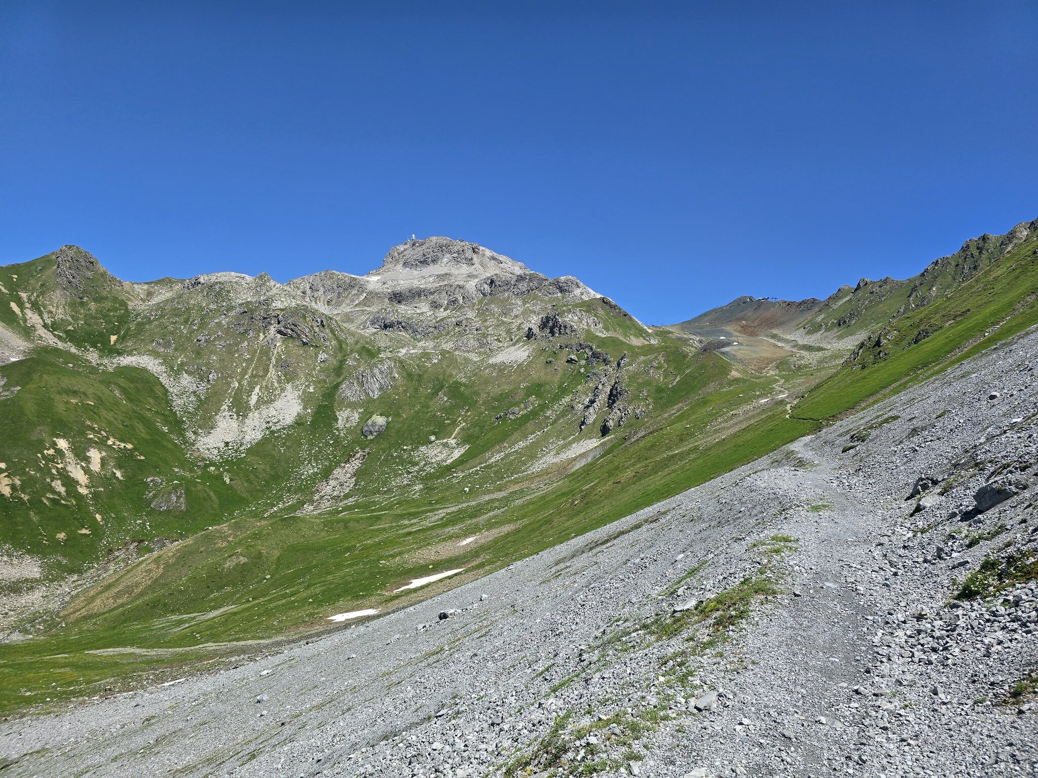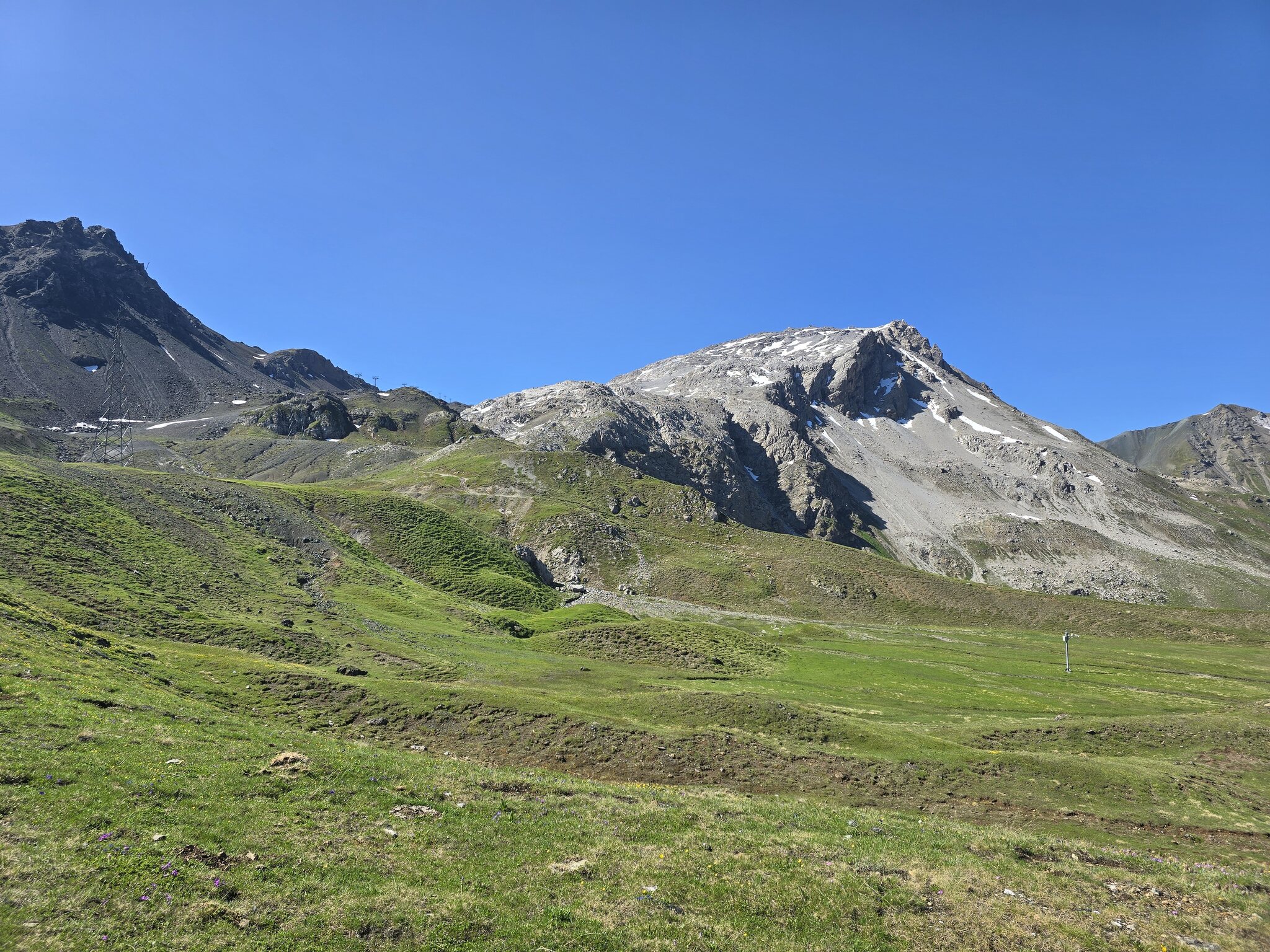 - Blick zum Weissfluh-Gipfel. Kommt wohl auch nicht so häufig vor, dass es hier Ende Juni bis zum Gipfel praktisch schneefrei ist.
