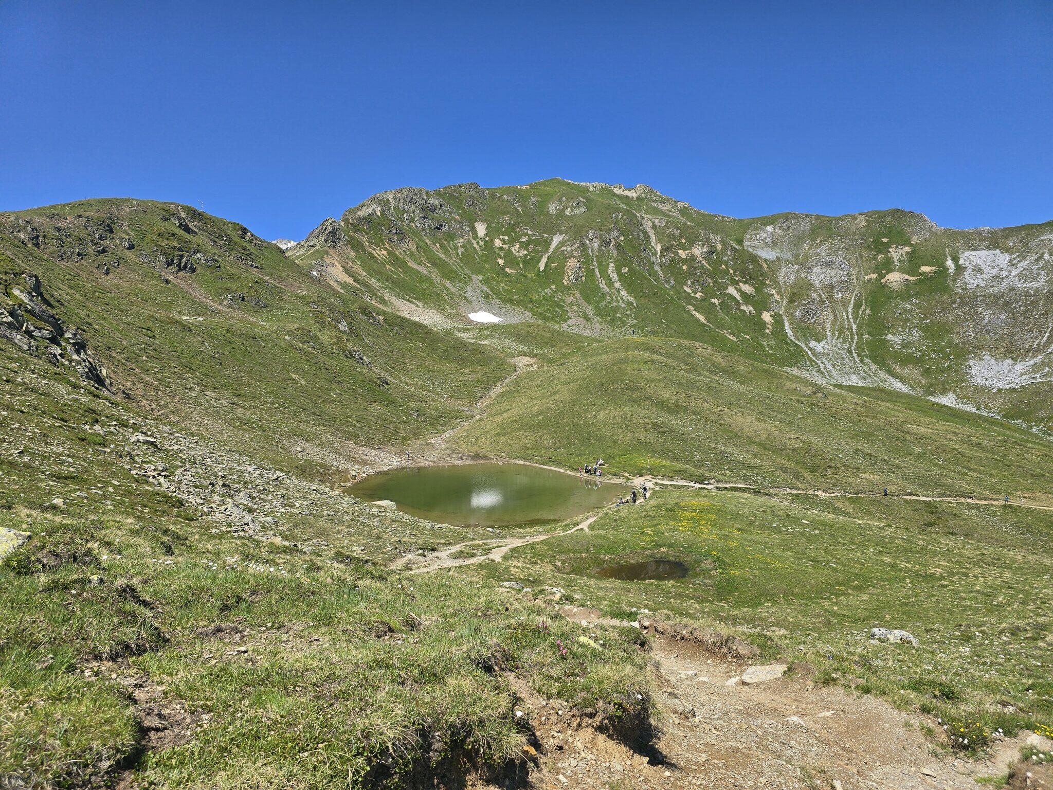 Am Strelapass angekommen fahre ich weiter über den Trail zum Chörbschhorn. Dieser ist grösstenteils gut fahrbar, ohne E-Bike muss ich aber dennoch ab und zu zwischendurch mal kurz ein paar Meter schieben. Es ist frappant wie stark man die revisionsbedingte Schliessung der Parsennbahn und den Ersatzbetrieb der Sesselbahn am Strela bemerkt. Während ich rund um das Weissfluhjoch kaum andere Leute antreffe, sind ab dem Strelapass etliche Biker und Wanderer unterwegs.