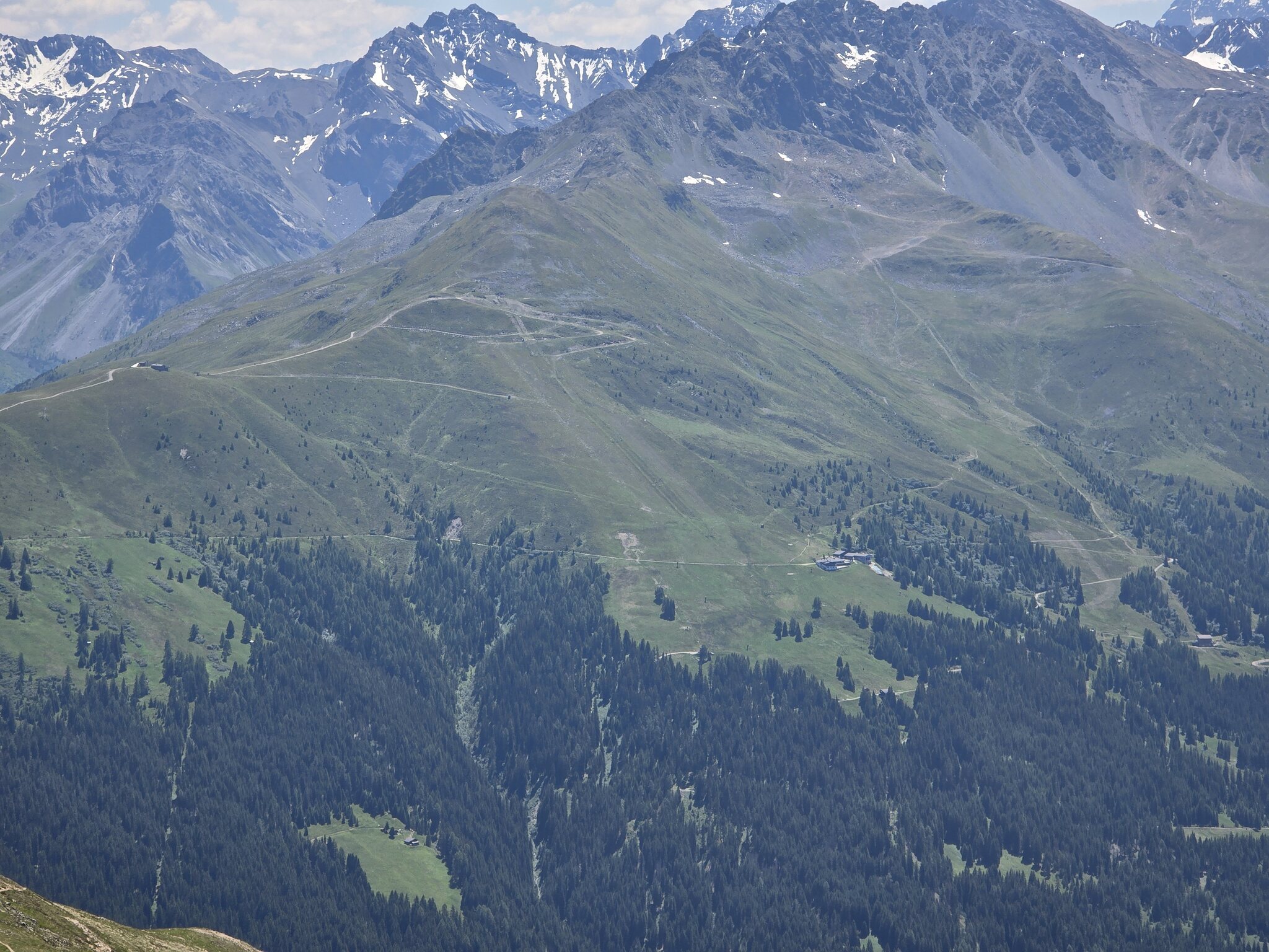 Von der Alp Casanna geht es weiter über die Schotterstrasse nach oben. Etwas oberhalb der Mittelstation der Schiferbahn endent diese jedoch. Der weitere Weg ist dann leider deutlich schlechter als die Karte vermuten liess. Es gab hier wohl mal eine (eher rudimentäre) Schotterstrasse, die ist mittlerweile aber stellenweise völlig zerfallen. Zudem führt der Weg einfach schnurstraks die Skipiste hoch, 30% Steigung und mehr sind keine Seltenheit. So muss ich das Fahren bald aufgeben und das Bike hoch schieben. Tja, wo das Gefälle ideal zum Skifahren ist, eignet es sich leider nicht um mit dem Bike hochzufahren