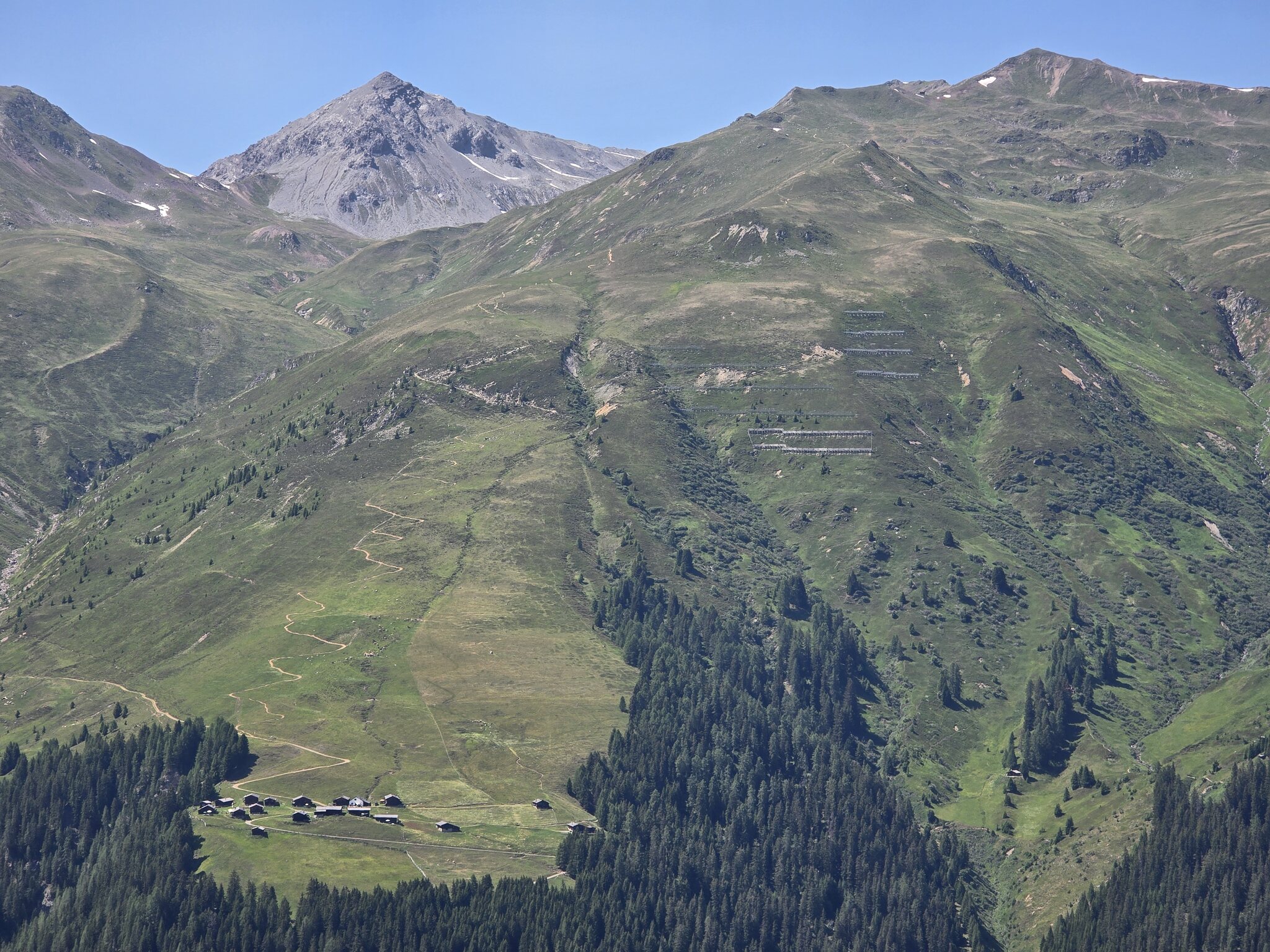 - Zoom auf die andere Talseite zum Chörbschhorn mit dem Trail.