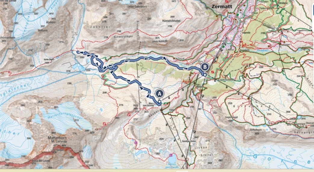 Am vergangenen Freitag lief ich zunächst den Matterhorn Glacier Trail. Dabei handelt es sich um einen Weg von der Station Schwarzsee im Bogen durch die Gletschervorfelder Furgggletscher und Theodulgletscher zur Station Trockener Steg. Auf der ganzen Strecke dominiert das Matterhorn das Panorama: Während man am Anfang auf den Hörnligrat blickt, sieht man die meiste Zeit des Weges vor allem auf die Ostwand. Für den Weg brauchte ich vielleicht 2 1/2 Stunden. Da im Anschluss noch genug Zeit war, fuhr ich mit dem Matterhorn-Express zunächst hinab zur Staion Furi, und anschließend mit dem Riffelbergexpress zum Station Riffelberg, wo auch die Gornergratbahn vorbeikommt. Von dort lief ich zum Riffelsee und weiter zur Station Rotenboden. Das ganze dauerte vielleicht 1 h 15 min. In der Nähe des Riffelsees hat man auf einen kleinen Grat einen guten Blick auf Gorner- und Grenzgletscher sowie die Berge vom Breithorn bis zum Monte Rosa. Von der Station Rotenboden fuhr ich mit der Gornergratbahn ins Tal.