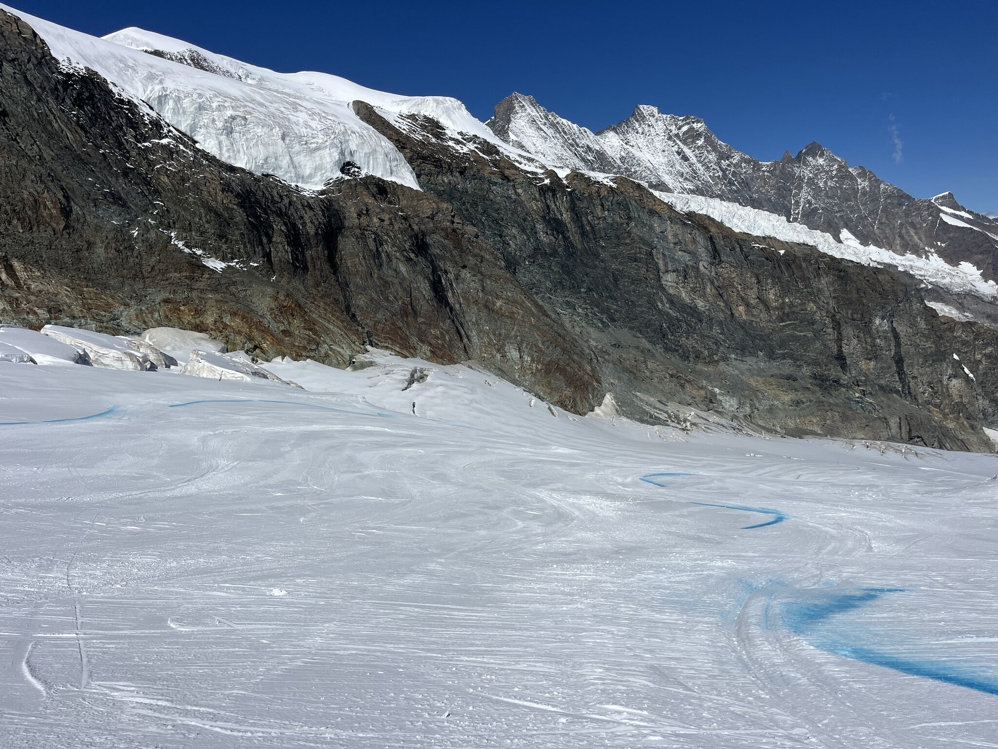 Ich war gestern zu Fuß in der Britanniahütte (von Saas-Almagell bis Felskinn). Eine wunderschöne Gegend mit beeindruckender Aussicht auf die Gletscher Allalin und Hohlaub sowie die Region Mattmark. Leider ist auch der Rückgang der Gletscher in dieser Region deutlich zu sehen, insbesondere beim Chessjengletscher, der das Gebiet zwischen Felskinn und Britanniahütte bedeckte und nun fast vollständig verschwunden ist. Bis auf einen kleinen Rest links vom Felskinn (Piste Felsental) ist nichts mehr davon übrig. Und dabei konnte man vor etwas mehr als 30 Jahren noch im Sommer auf dem Egginerjoch skifahren...