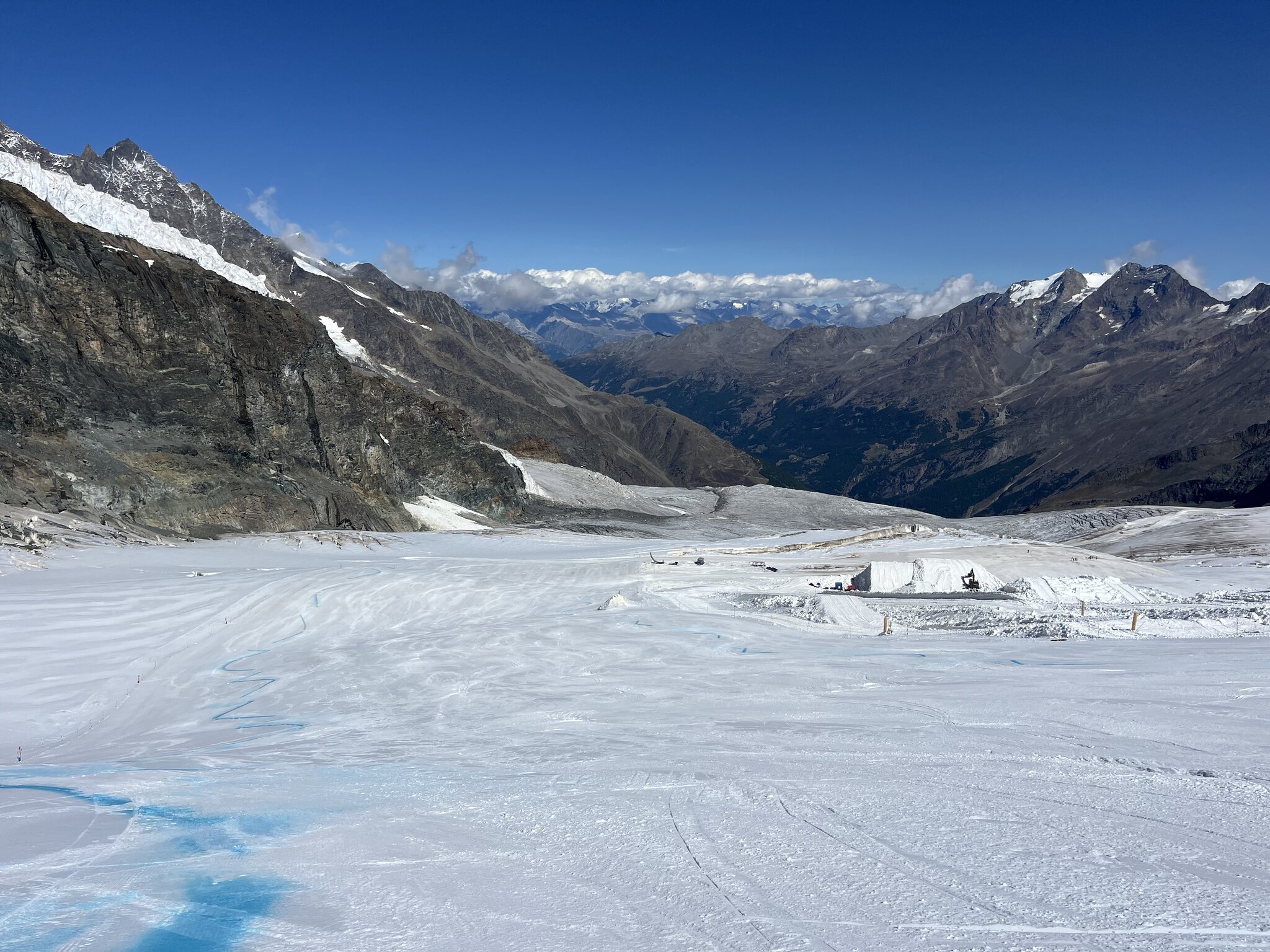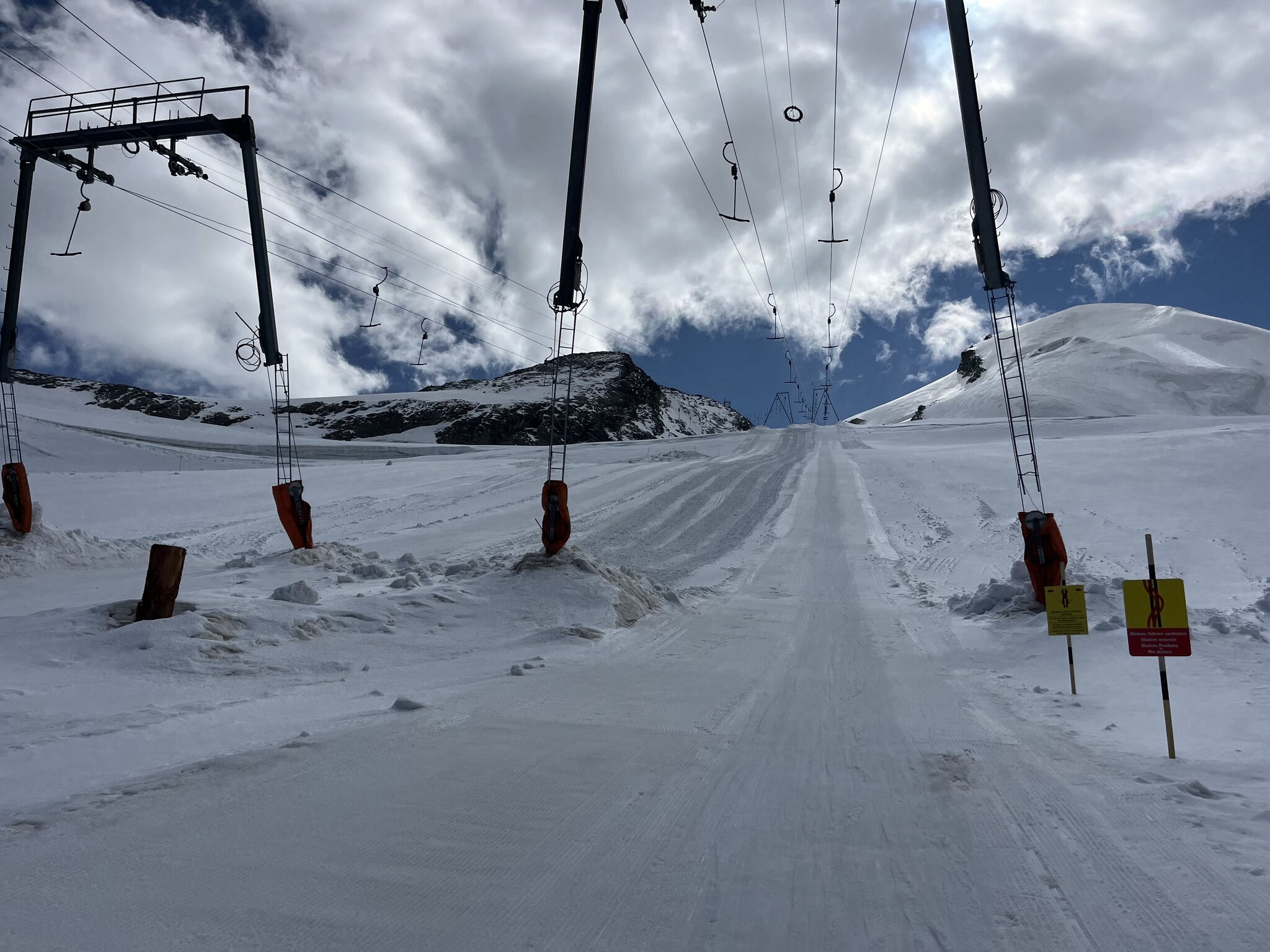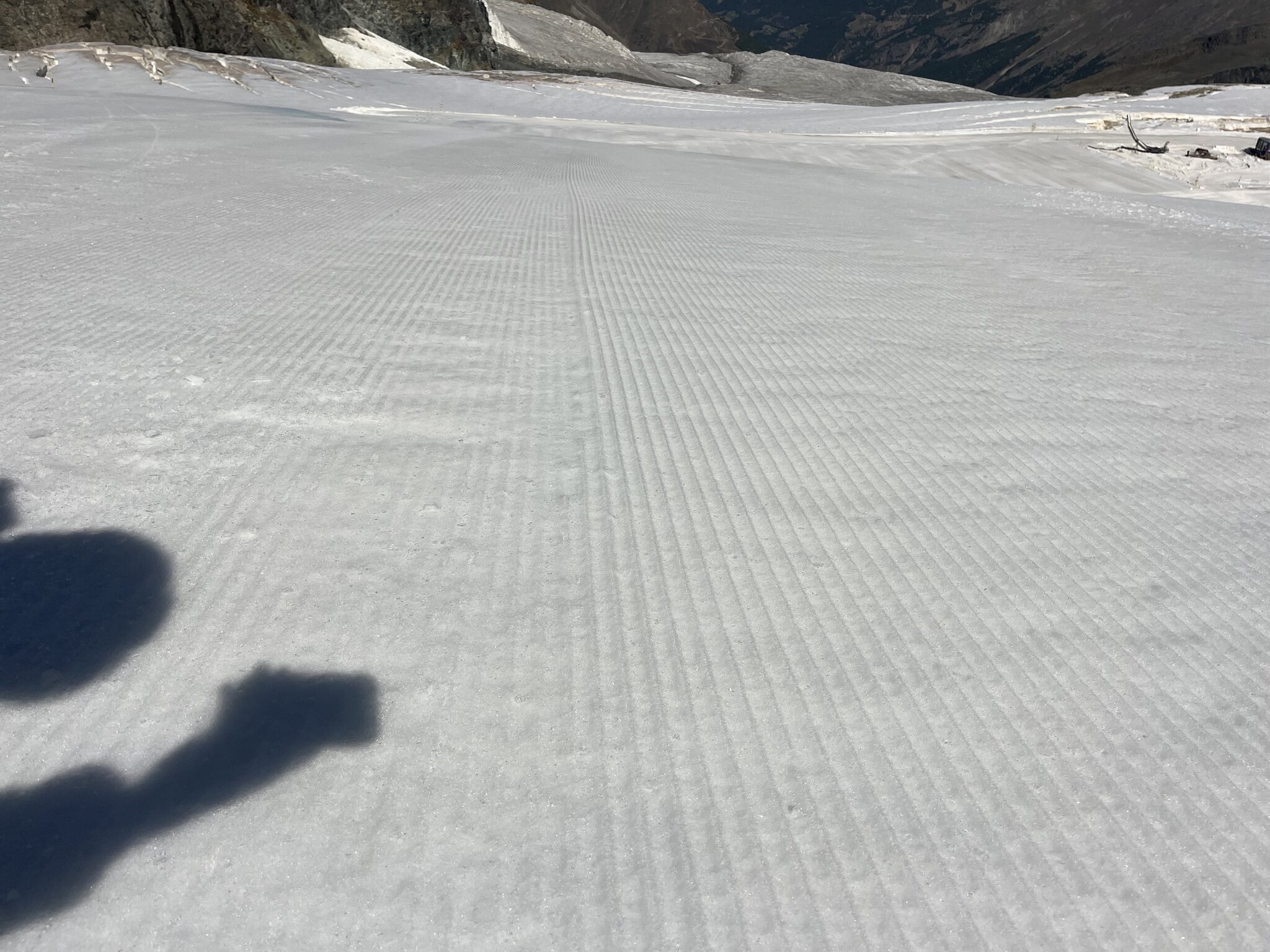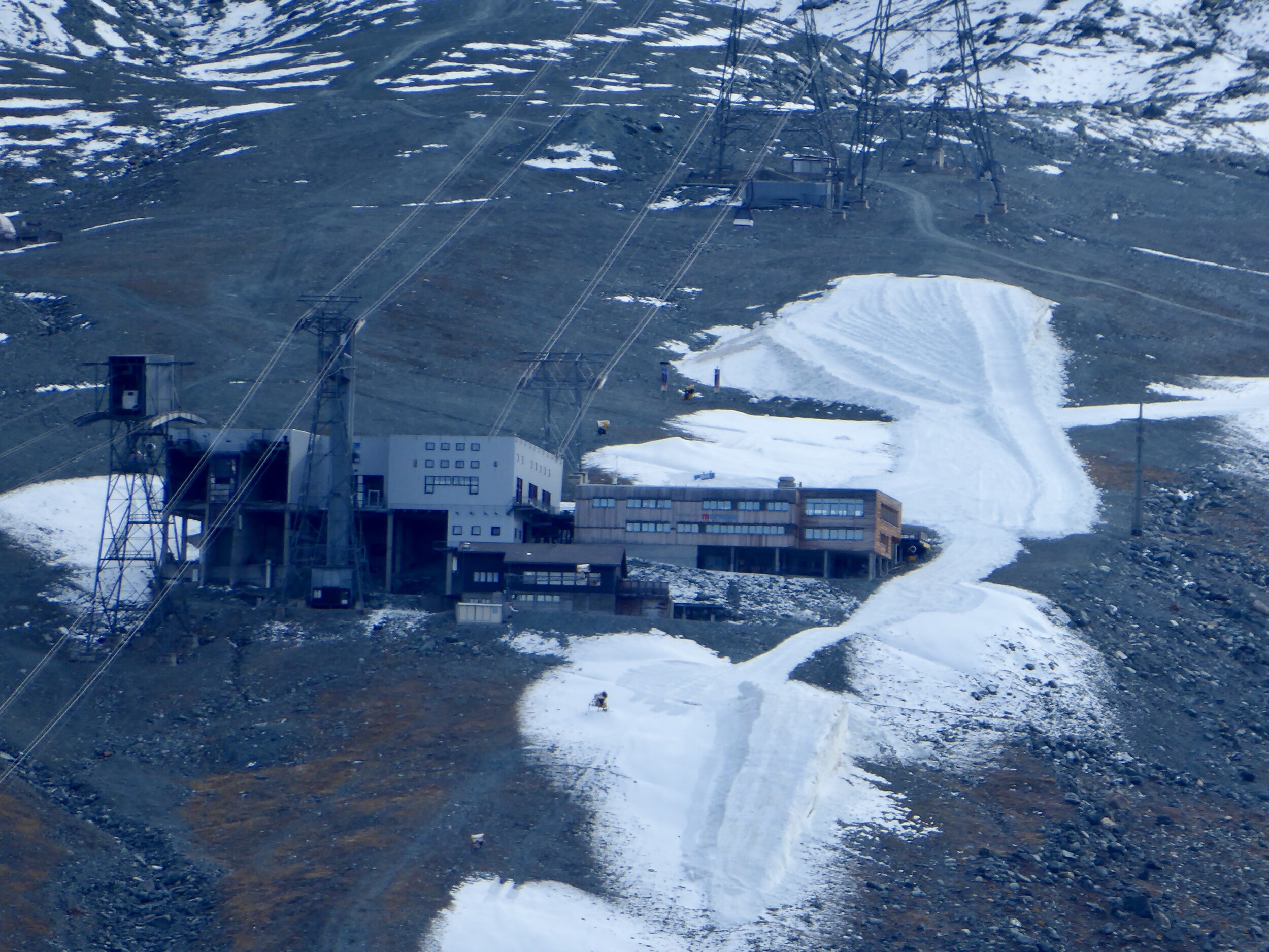 Was die Schneelage angeht, liegt auf dieser Höhe (3000 m ü. M.) noch fast kein Schnee auf den Gletschern. Die Schneedepots in Morenia sind noch abgedeckt. Maschinen bearbeiten das Gelände (Planieren) auf der Egginer- und Egginerjoch-Piste.
