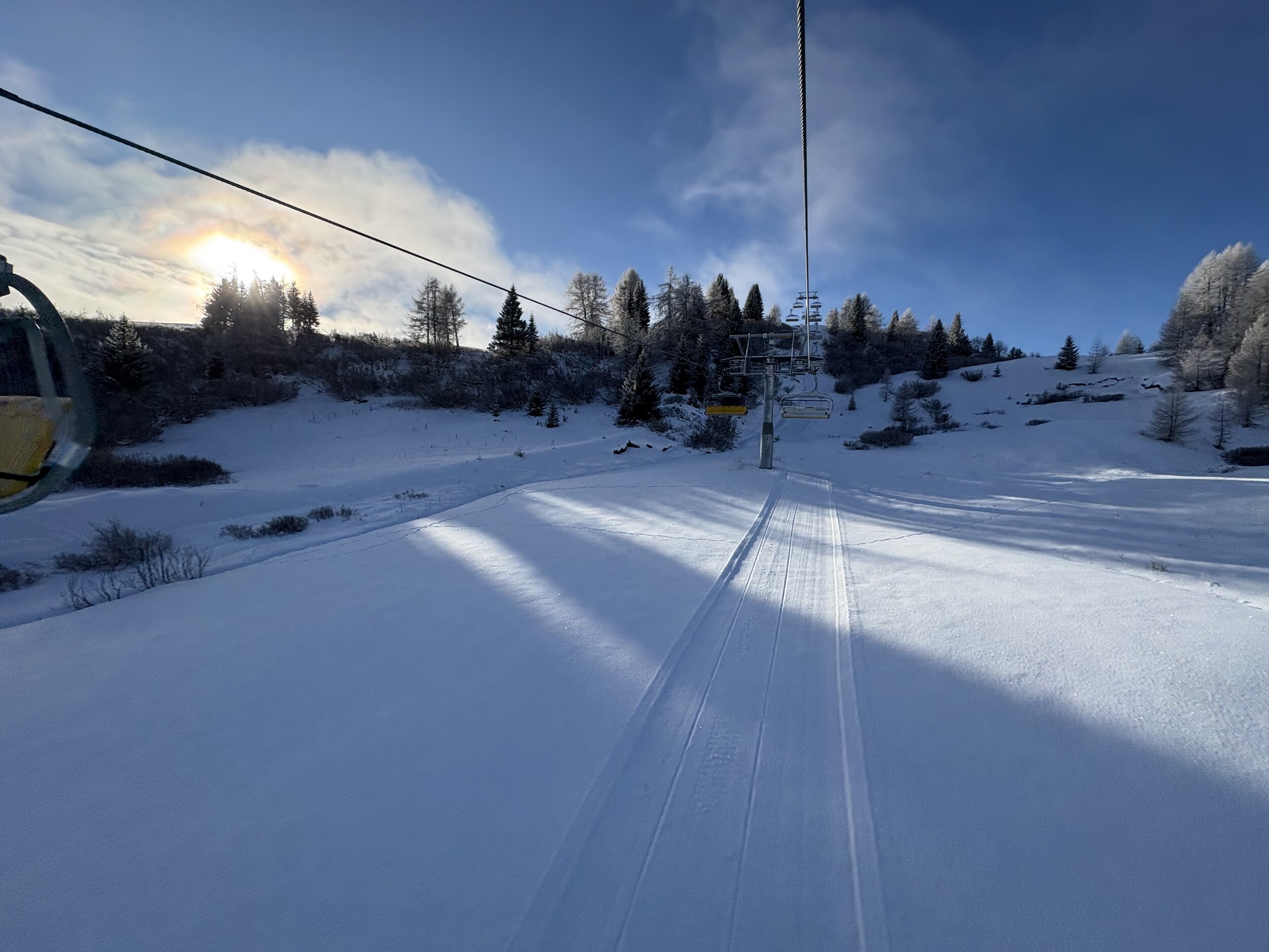Ich bin gerade extrem happy, das erste Mal wieder Dolomiten seit 8 Jahren Noch ist das Boarders Traum mit 2, 3 cm Pulverschnee auf der Piste Gran Risa, erste Spur Mit der Pulverschnee Auflage macht die Gran Risa auch mit dem Board richtig Spass. Der Andrang um 9:15 Uhr ist sehr überschaubar. An der Piz la Ila kann ich direkt in die Gondel durchgehen. Wettermässig ist es relativ mild. es ist Einfach nur herrlich.