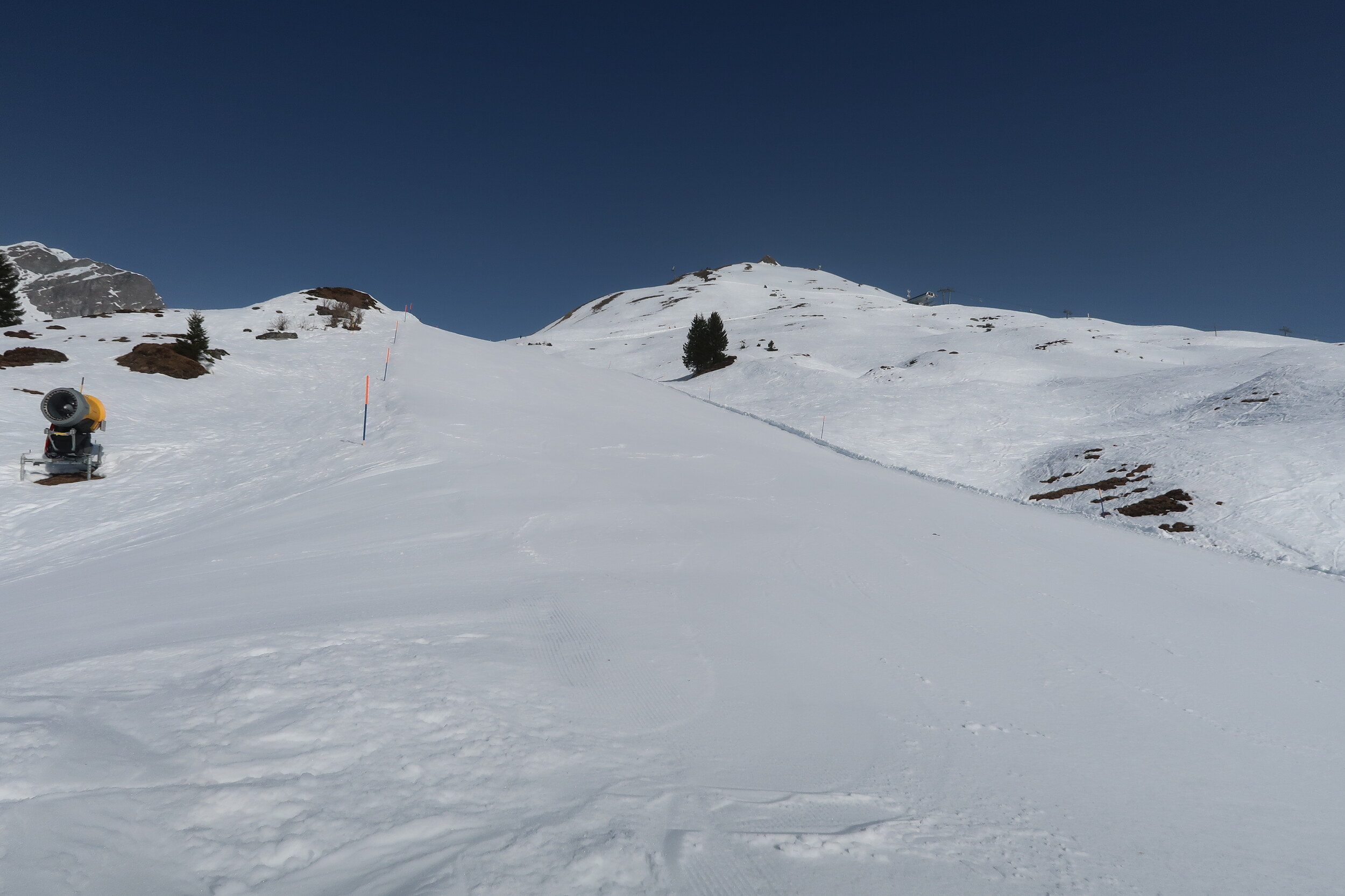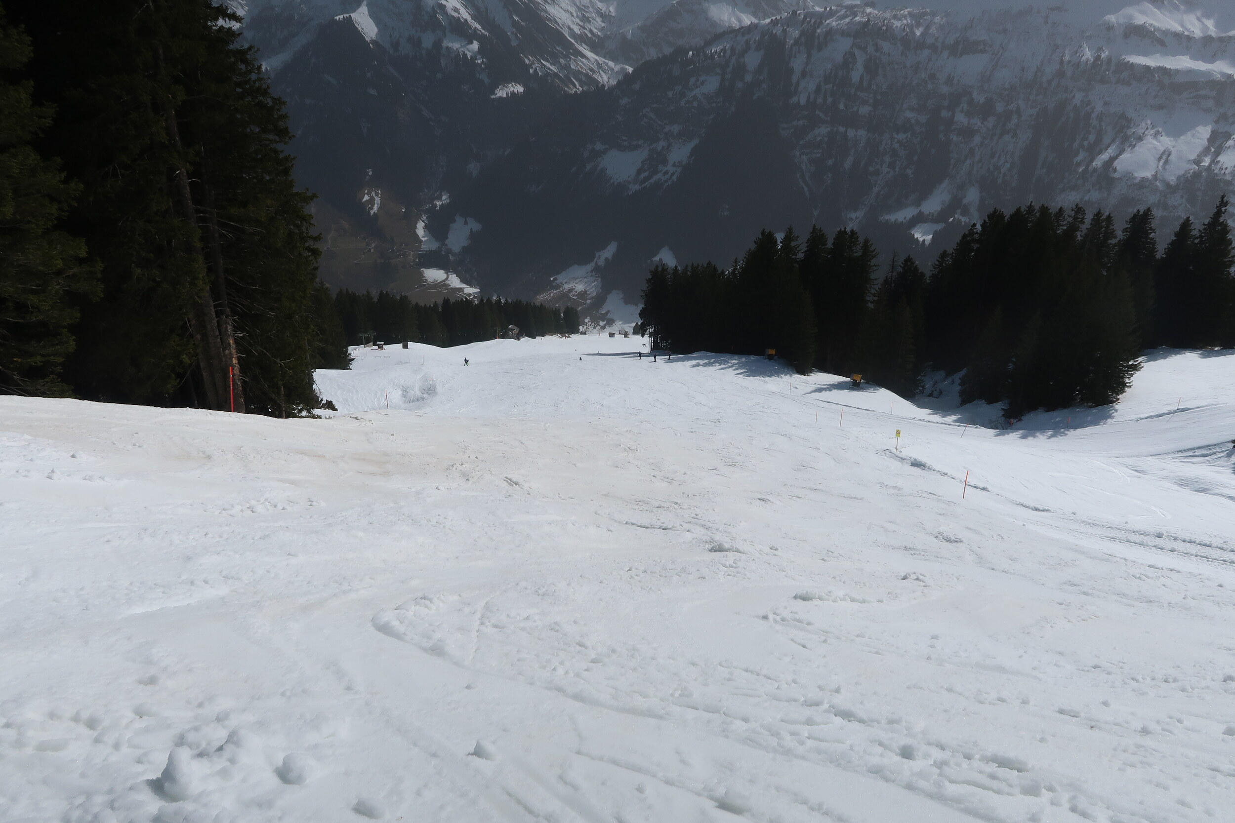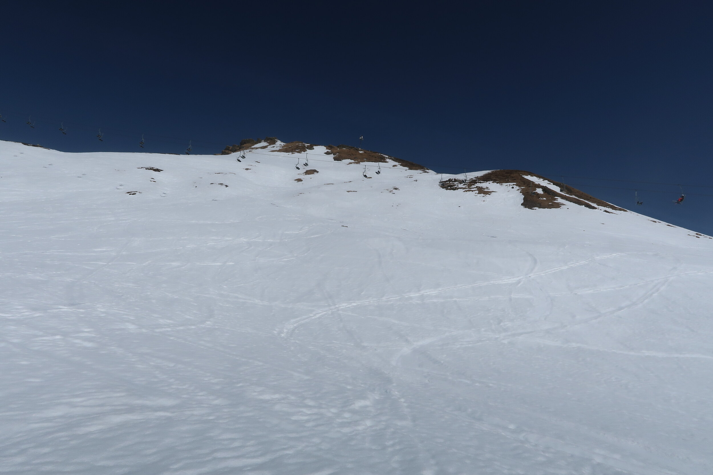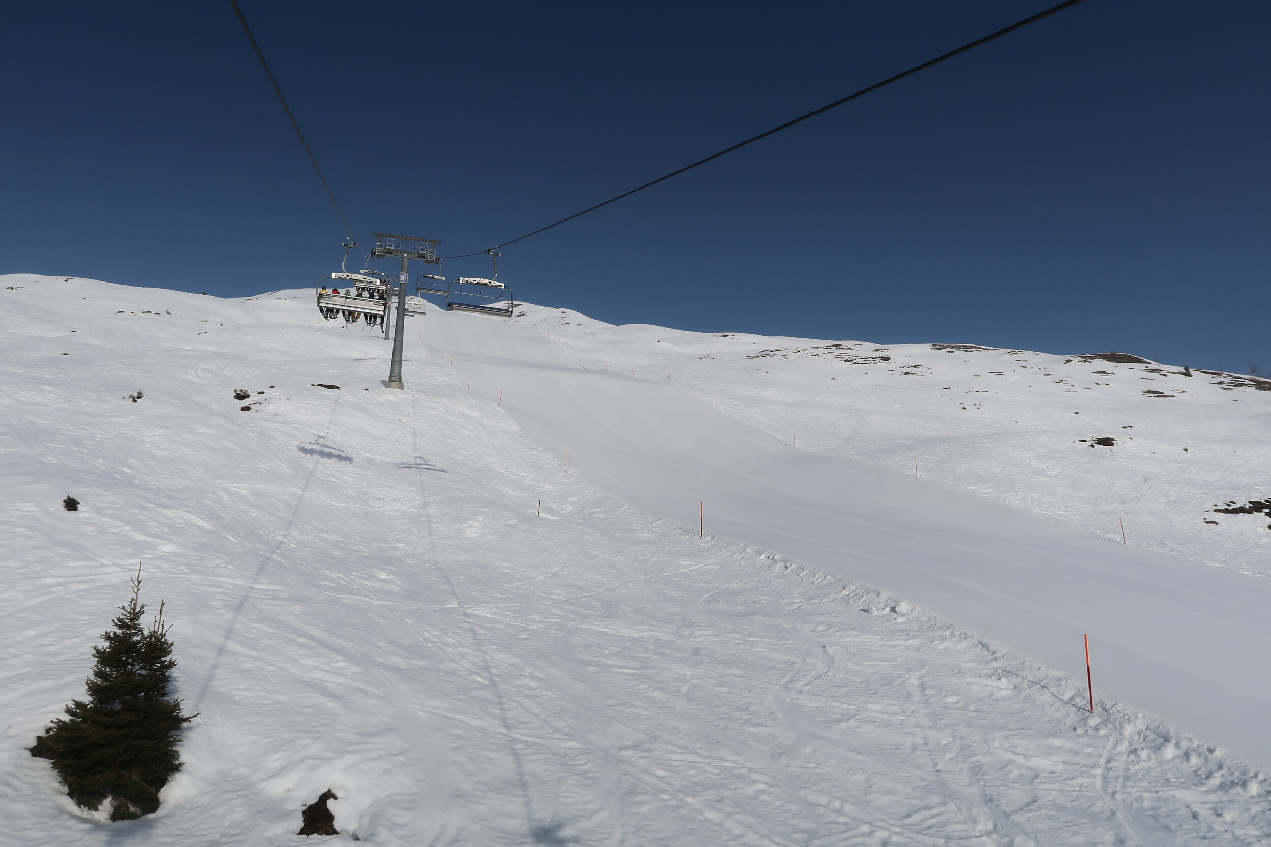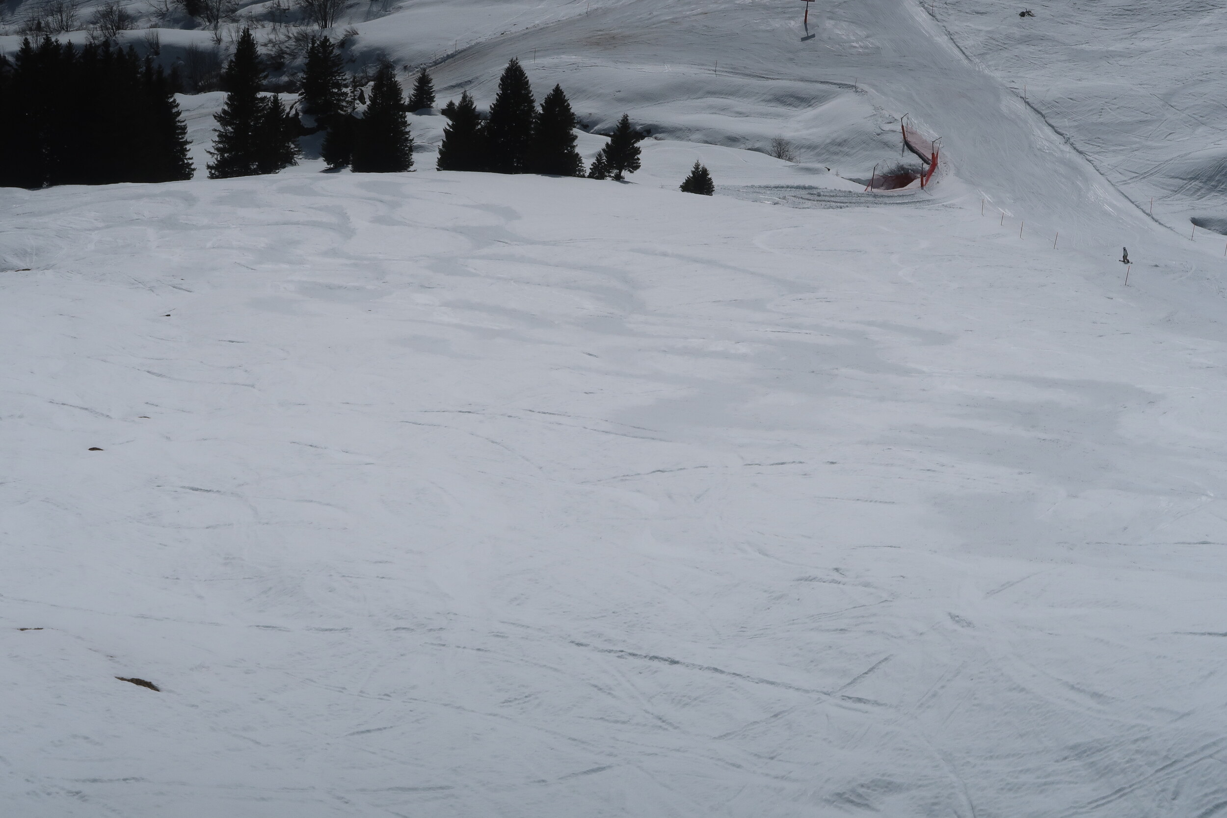 Die blaue 4 am Schlepper war ganz oben von Anfang an schon sehr braun und sulzig. Die rote 3 für Stangenfahrer gesperrt. Nach dem braunen Teil war die blaue 4 vormittags aber die beste Piste.