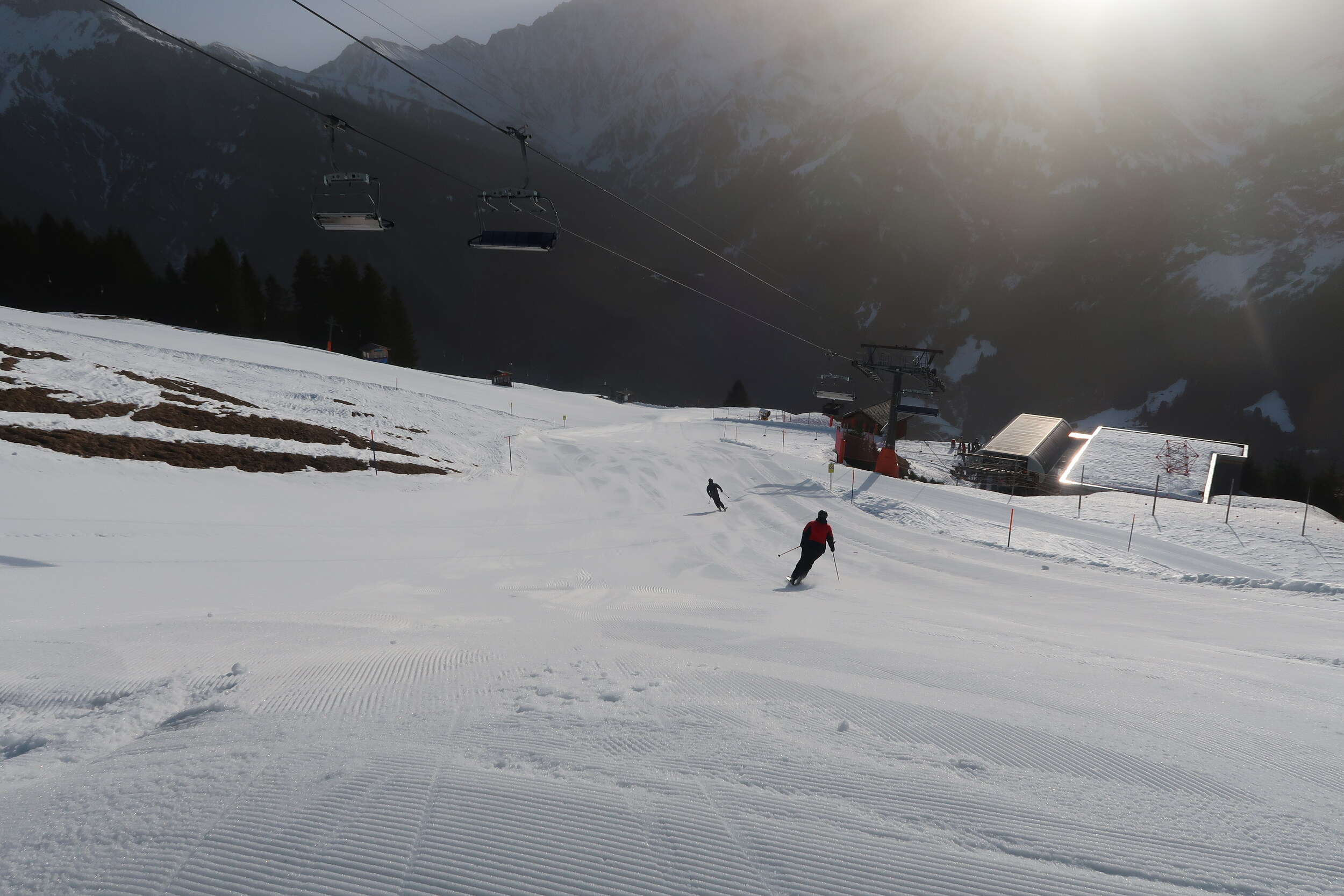 Die erste Abfahrt war noch etwas härter, die oberste Schicht aber schon leicht angesulzt. Das gilt aber nur für den oberen Teil. Unten war es bin Anfang an ein weicher. Und das wurde es dann auch schnell bis obenhin. Lifte und Pisten waren anfangs noch gut gefüllt. Teils ein paar Sessel oder ein paar Bügel Wartezeit. Wenn man Glück hatte vielleicht auch mal nicht. Aber bereits zwischen 10 und 11 (oder war es sogar noch früher?) verabschiedeten sich die ersten auf die Hütte. Es wurde somit nie voller als am Anfang sondern eher immer leerer und gleichzeitig die Pisten immer weicher.