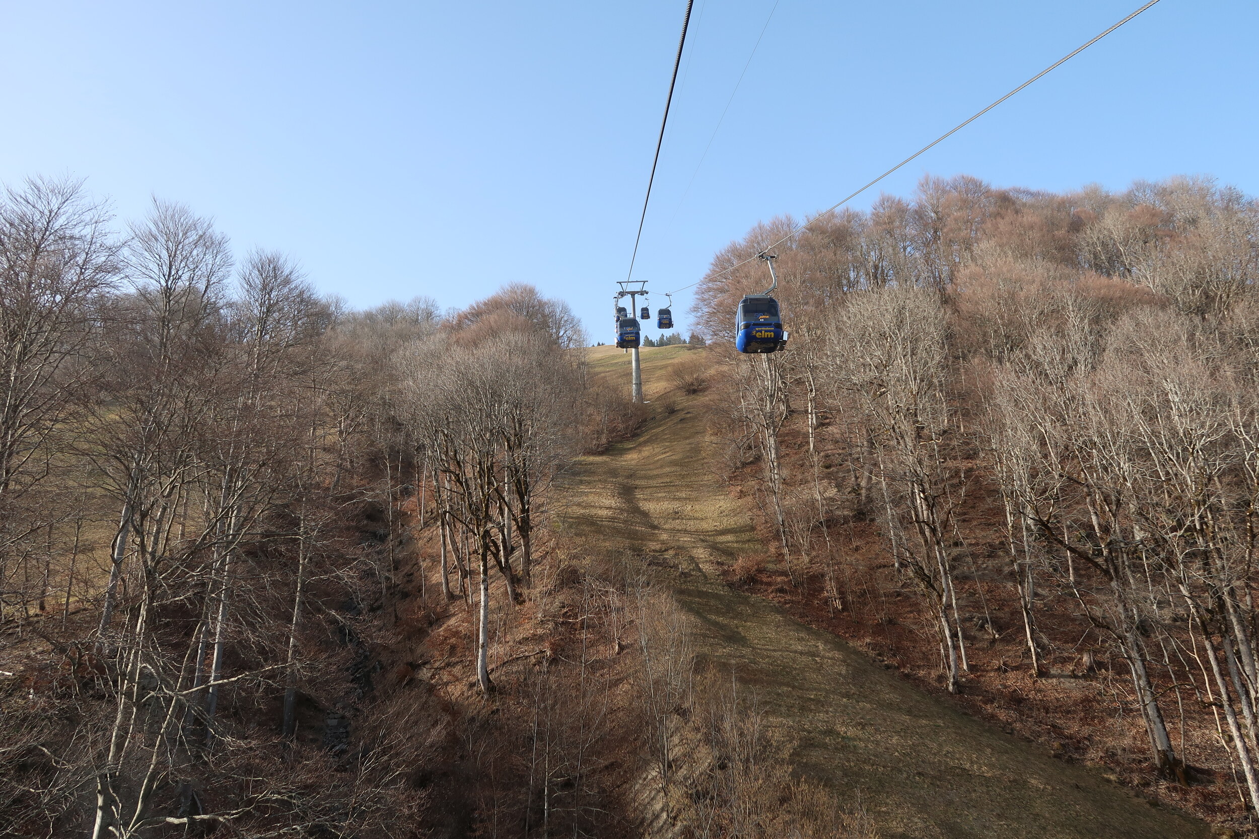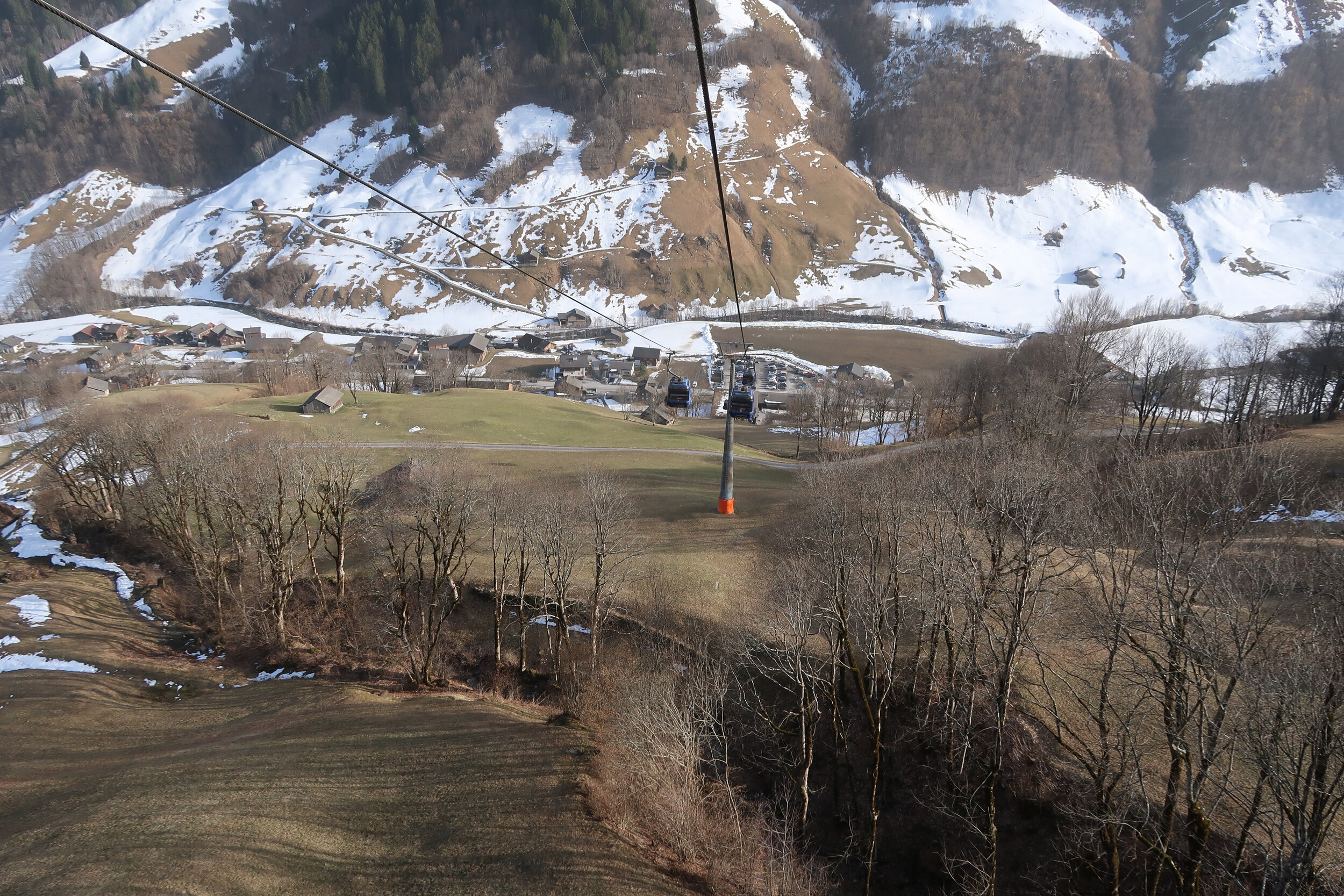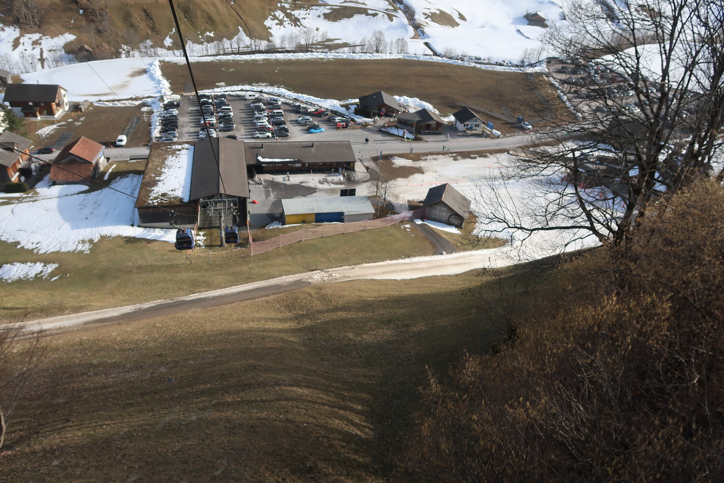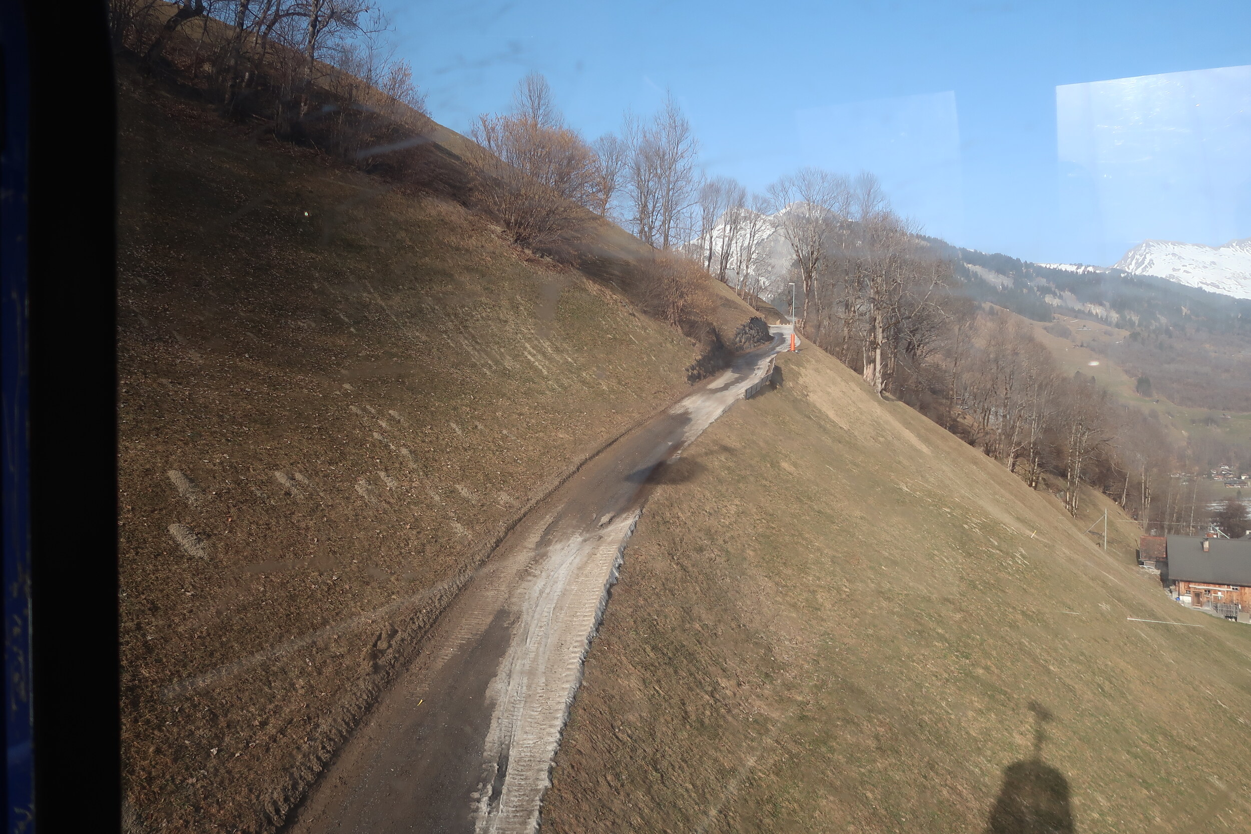 Um 8 Uhr war ich fertig, hatte problemlos meinen Gutschein gehen den Skipass eingetauscht. Und habe mich hinten an der Schlange angestellt - ja es standen schon einige an Drehkreuz, welche aber nicht gesperrt waren. Und während ich mit den anderen wartete, wurde die Schlange immer länger. Ich hätte nicht mit so viel Andrang so früh gerechnet. Doch meine Hoffnung, dass die Bahn so schon früher startet, wurde nicht erfüllt. Die Drehkreuze wurden erste pünktlich um 8:15 Uhr freigeschaltet. Ein paar Kabinen musste ich warten, bis es hoch ging über grüne schneefreie Wiesen. Talabfahrten waren keine geöffnet und auch der Schlittenweg ist gesperrt. Wenn ich es richtig verfolgt habe, war diese Saison bisher noch keine Talabfahrt offen gewesen. Die Schlittenbahn habe ich den Status nicht mitverfolgt, die Schneereste sahen aber so aus, als wäre sie vor nicht all zu langer Zeit noch offen gewesen.