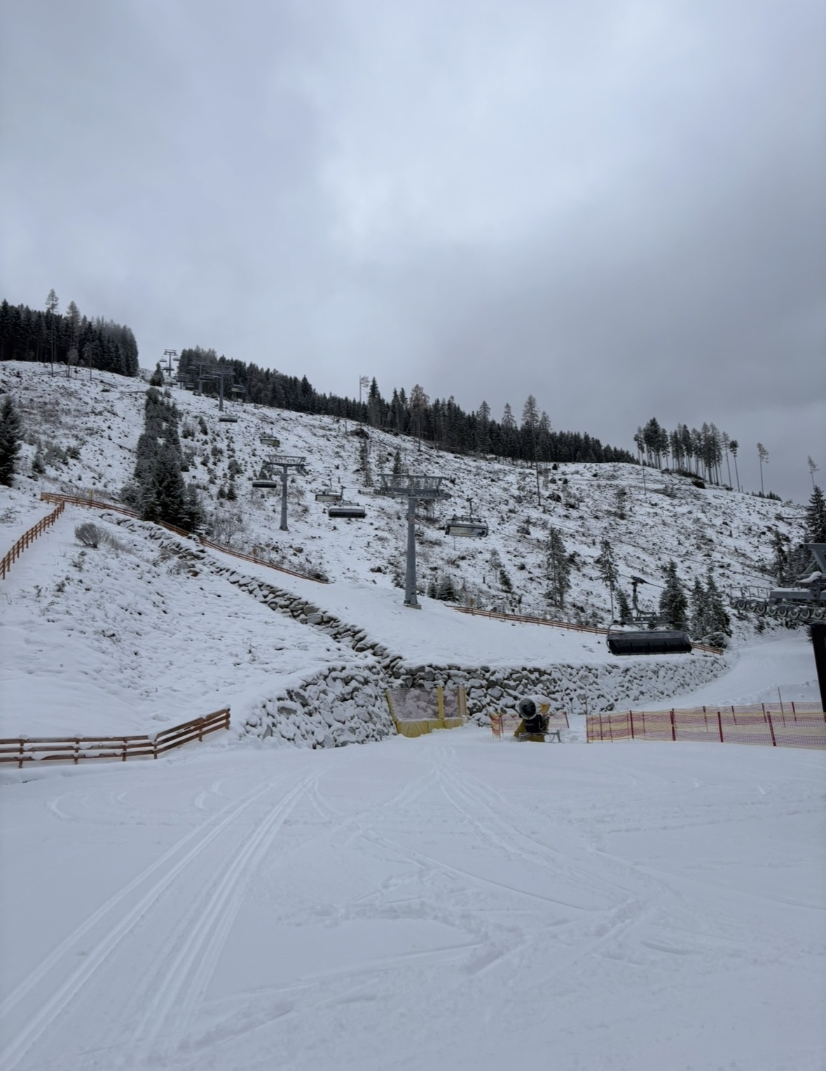 Mitterhausalm 2 sehr schmal beschneit (von den Turmkanonen bis zum sichtbaren Pistenrand), die Lanzen am linken Pistenrand waren noch gar nicht in Betrieb