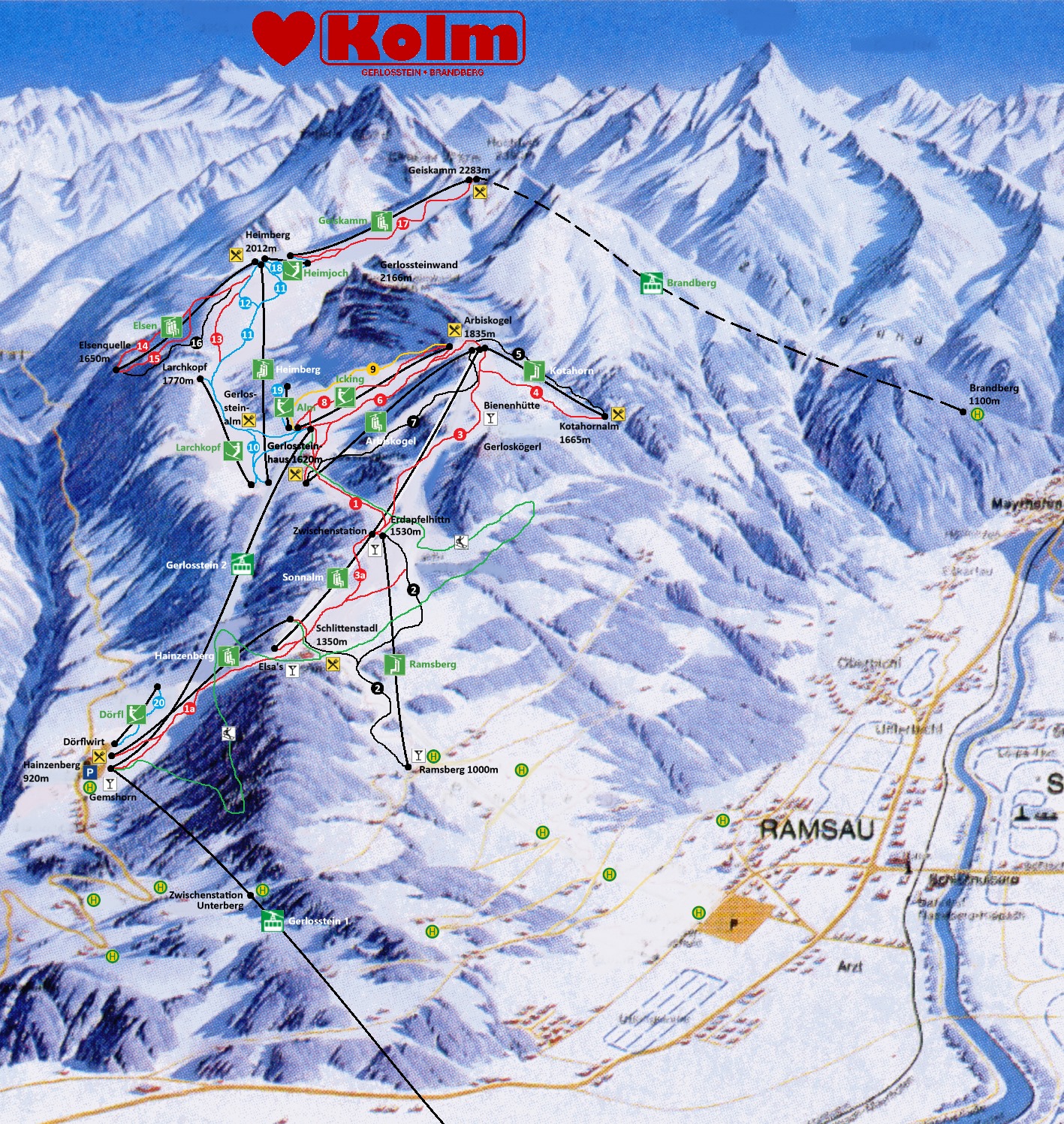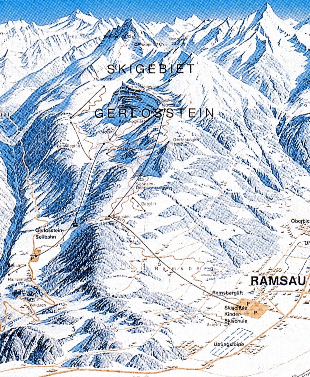 Bei meinem letzten grippalen Infekt schnappte ich die alte Panoramakarte und kritzelte drin rum. Obwohl ich den Gerlosstein mag so wie er ist, gibt es Optimierungsbedarf. Aufgrund des 80er Stils des ganzen Skigebiets sollten auch neue Anlagen diesen Stil weiterführen. So sorgte ich mit meiner Vision für ein dann doch viel größeres Skigebiet und erschloss über das Heimjoch hinaus auch den Geiskamm (der eigentlich keinen Namen hat, aber der nebenanliegende Geiskopf ist zu steil für eine Erschließung). Zu eben diesem Kamm plante ich dann auch eine Pendelbahn von Brandberg hinauf. Das Dörfchen passt gut zum Rest: Hainzenberg, Ramsberg und Brandberg sind die neuen "Talorte" des Skigebiets, ruhig und bäuerlich geht es zu und man ist weit weg von den Massen des restlichen Zillertals. Alle Lifte sind bewusst fix geklemmt, die Bergfahrten damit sollen bewusst das Gemütlichkeits-Erlebnis fördern. Die meisten Pisten liegen eher Nordseite, die Neuerschließungspläne bis zum Geiskamm sorgen für mehr Schneesicherheit. Der höchste Punkt ist neu auf 2.280m (statt wie bisher auf 1.835m).