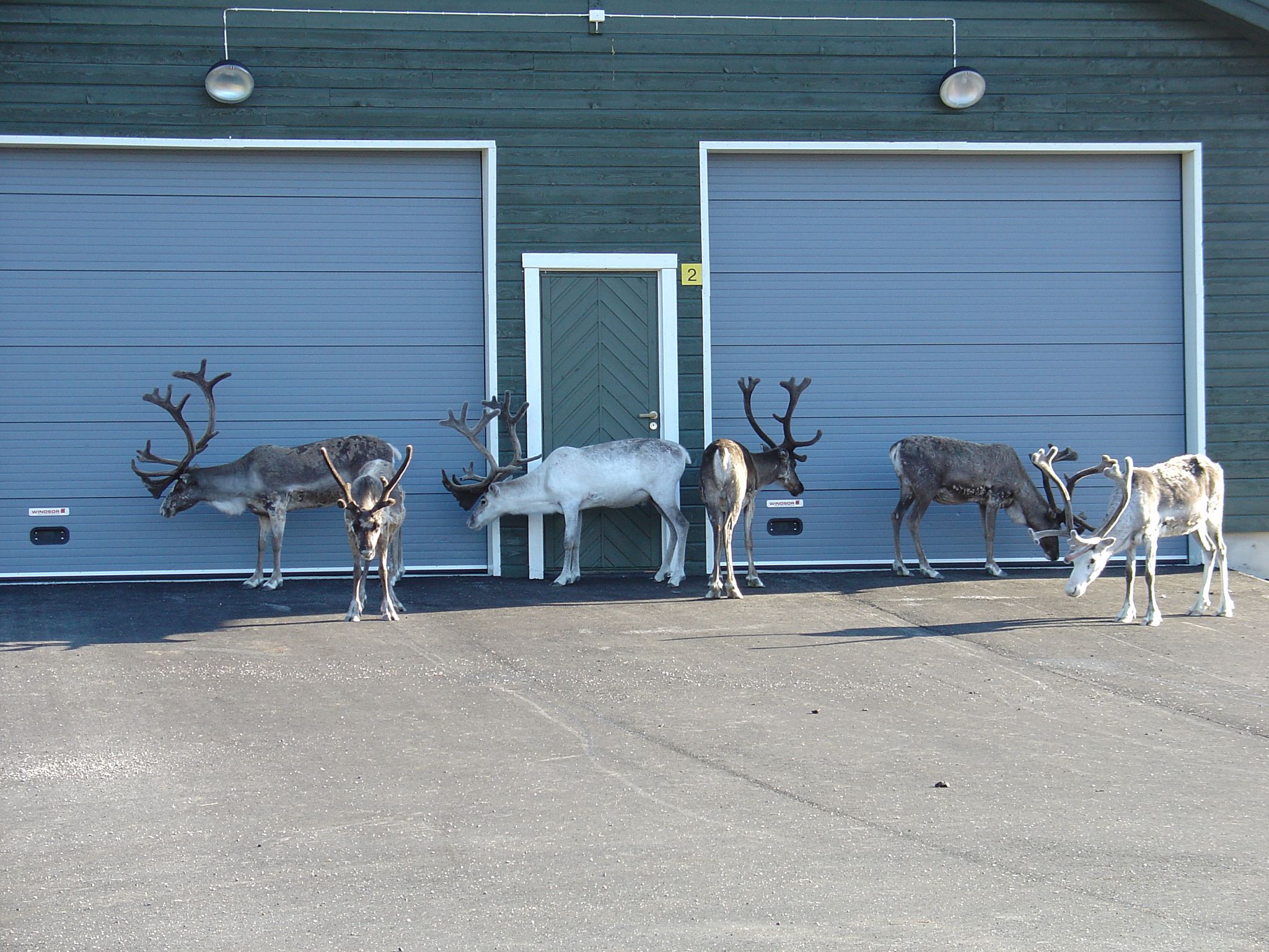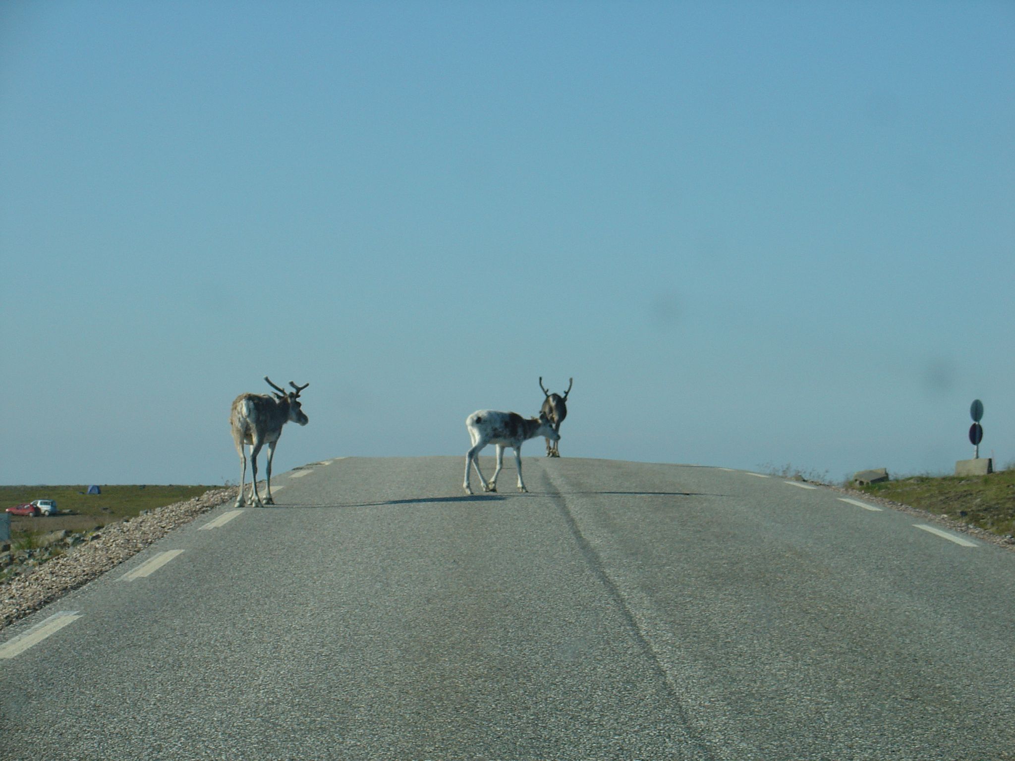 Kurz vor sieben fuhren wir wieder Richtung Süden und hatten erstaunlich viel Verkehr in Form von Rentieren auf der Strasse: