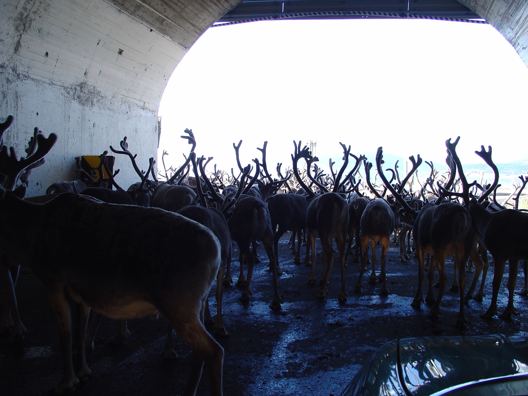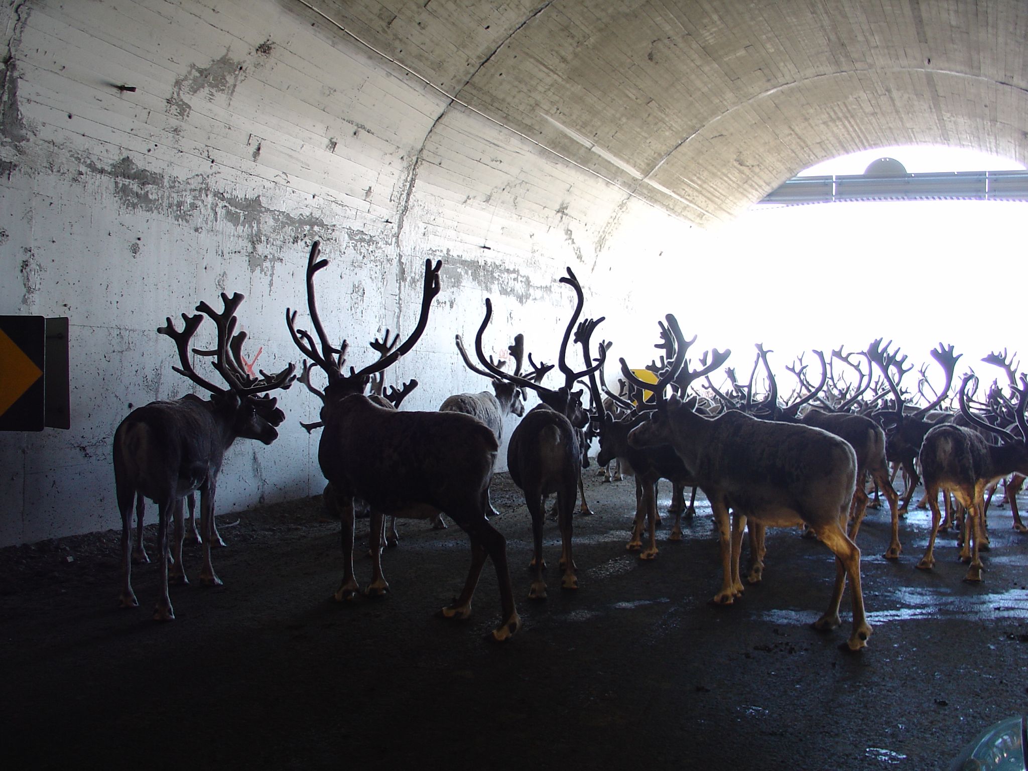 Beim Tunnel bei Skarvberg sah ich von weitem am Ende des Tunnels etwas merkwürdiges und konnte es zunächst nicht richtig identifizieren. Als wir näher kamen, stellte es sich um eine Rentierherde handelte, die sich im Tunnel abkühlen wollte: