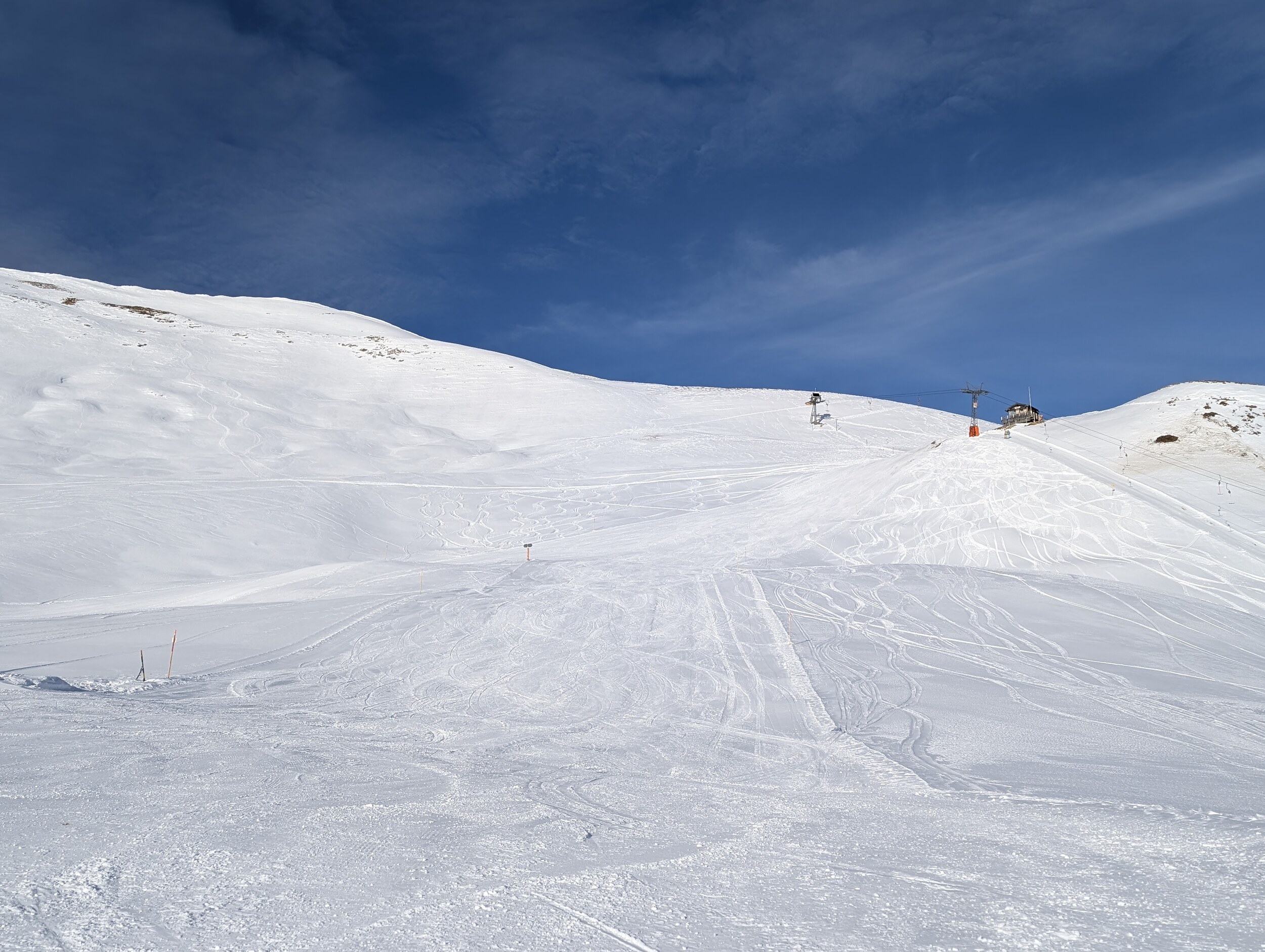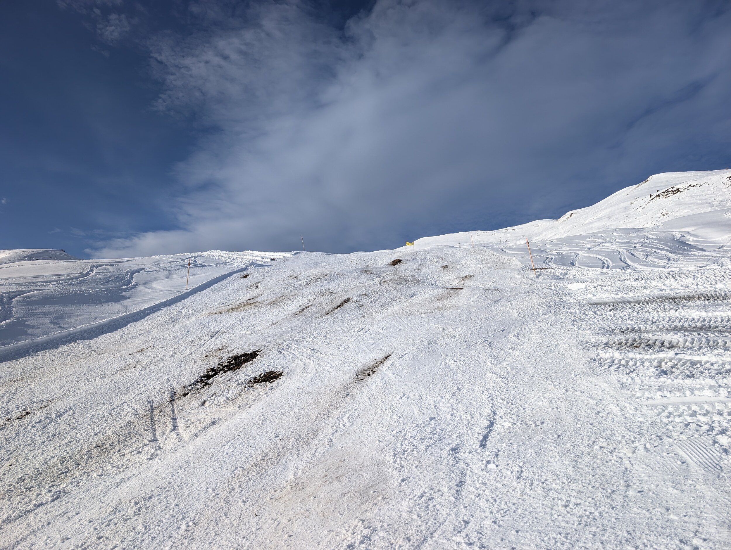 Es hat definitiv nicht viel Schnee, knapp genügend für die 3.5 offenen Pisten. Das Bergbahnteam gibt sich jegliche Mühe und stosst von überall Schnee in die Pisten und auf das SL-Trassee. Im ganzen Gebiet zwar fast alles Grashänge aber dennoch von Vorteil: möglichst alte Skier mitnehmen