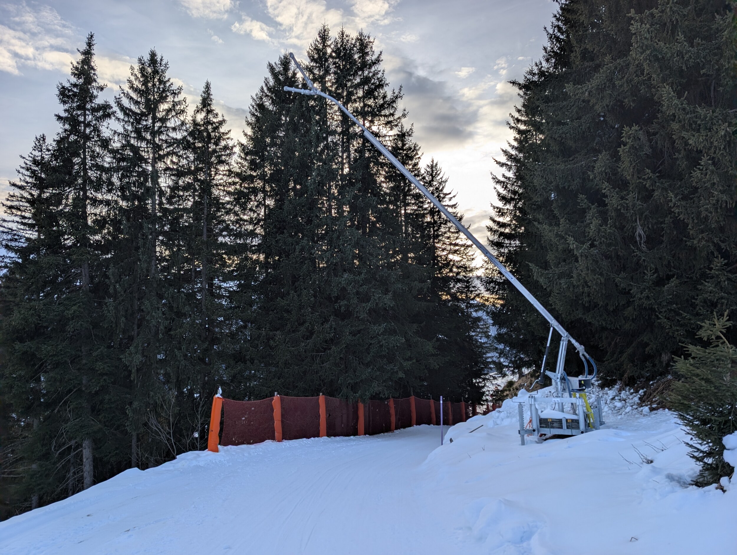 Talabfahrt auf der Schlittelbahn. Geht gut, einige kleine apere Stellen sind gut zu umfahren. Im unteren Teil trifft eine alte Kanone eine Lanze (ist die neu?)